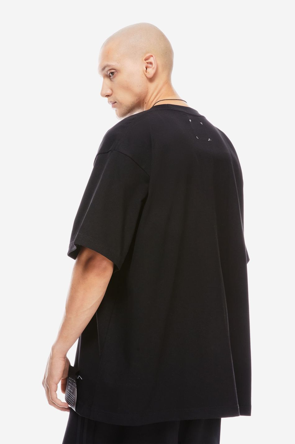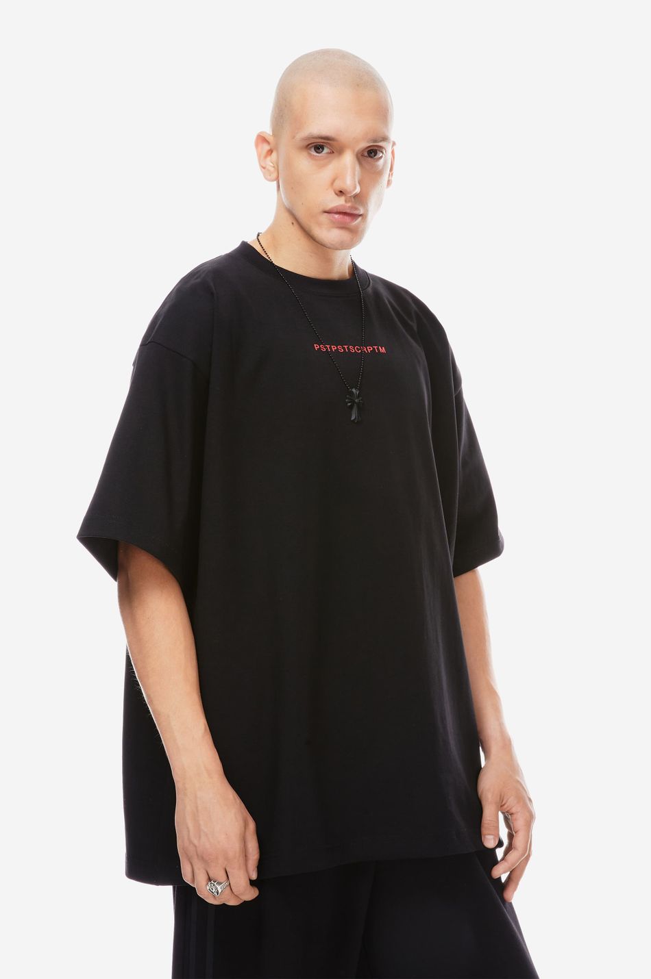 футболка силуэта oversize из плотного хлопка. модель с круглой горловиной и широкими рукавами дополнена спереди логотипом бренда, составленным из прорезиненных букв PSTPSTSCRPTM.