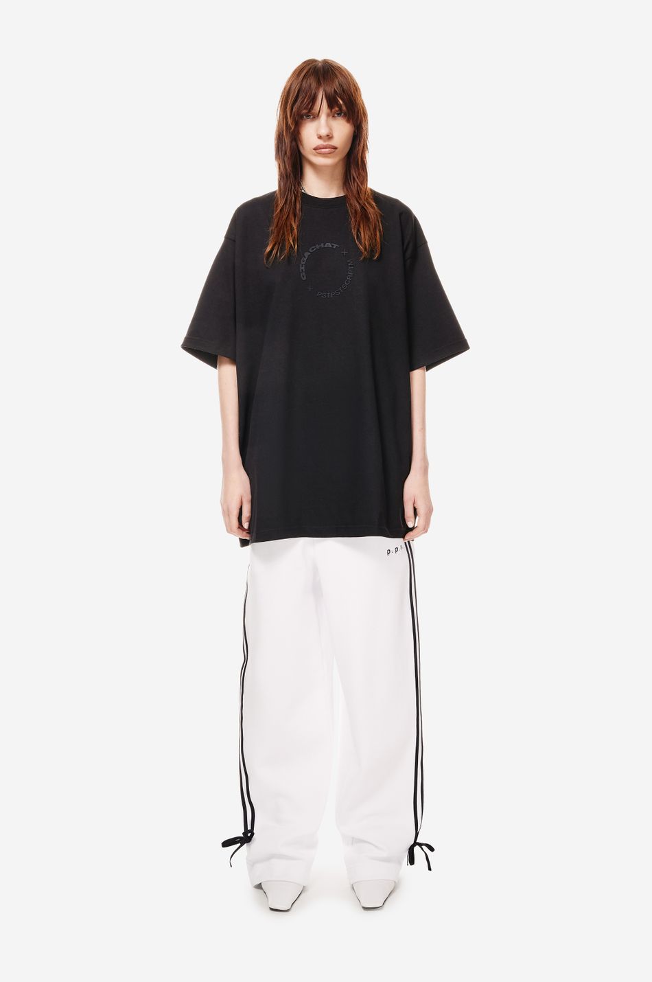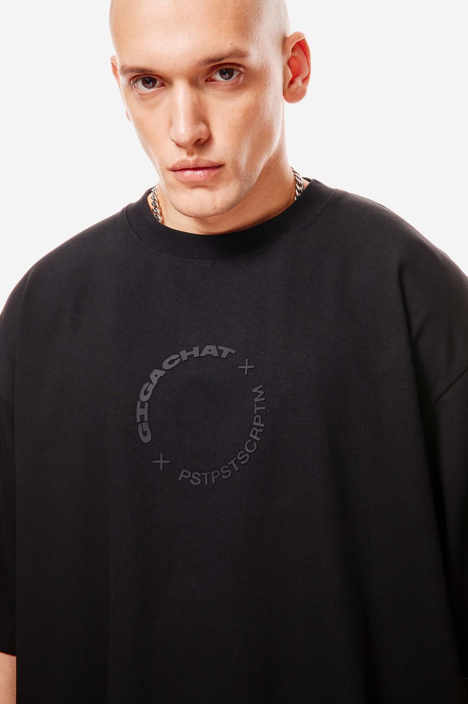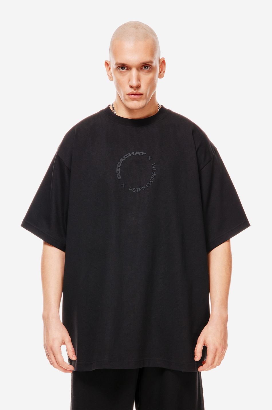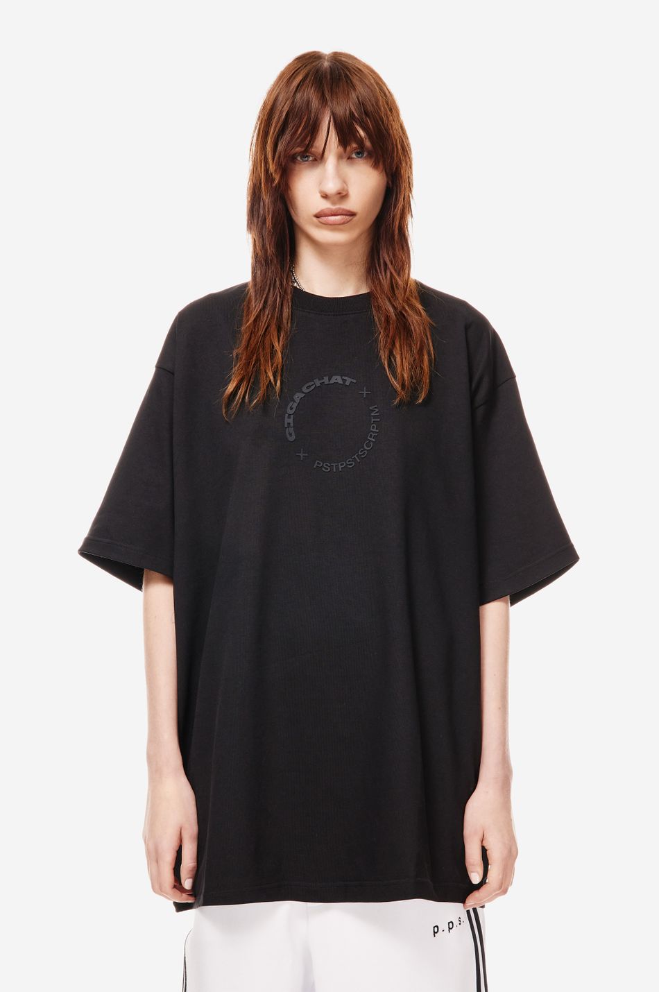 футболка силуэта oversize из плотного хлопка. модель с круглой горловиной и широкими рукавами дополнена спереди логотипом бренда, составленным из прорезиненных букв PSTPSTSCRPTM.