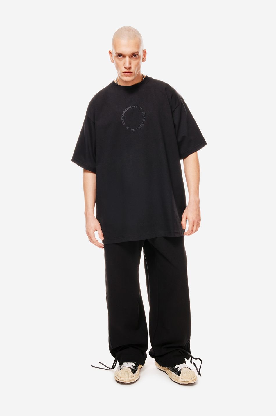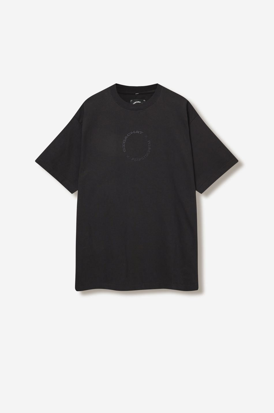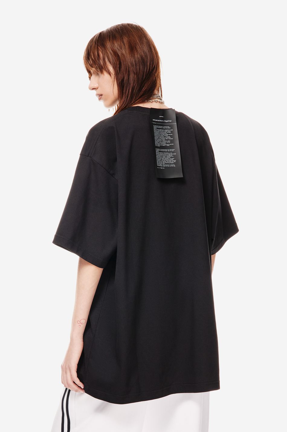футболка силуэта oversize из плотного хлопка. модель с круглой горловиной и широкими рукавами дополнена спереди логотипом бренда, составленным из прорезиненных букв PSTPSTSCRPTM.