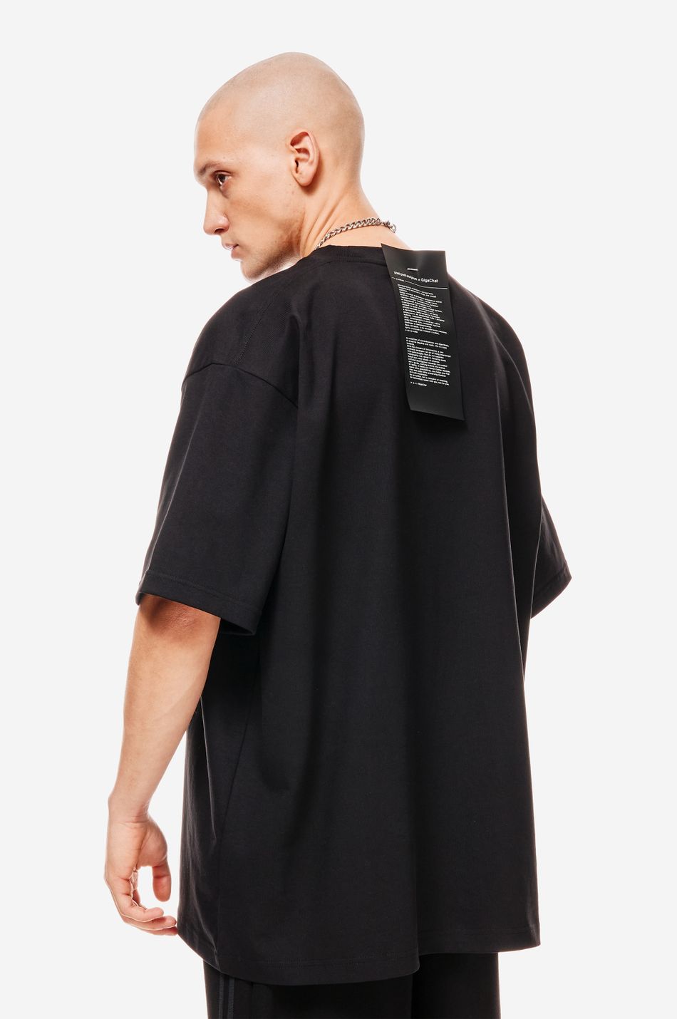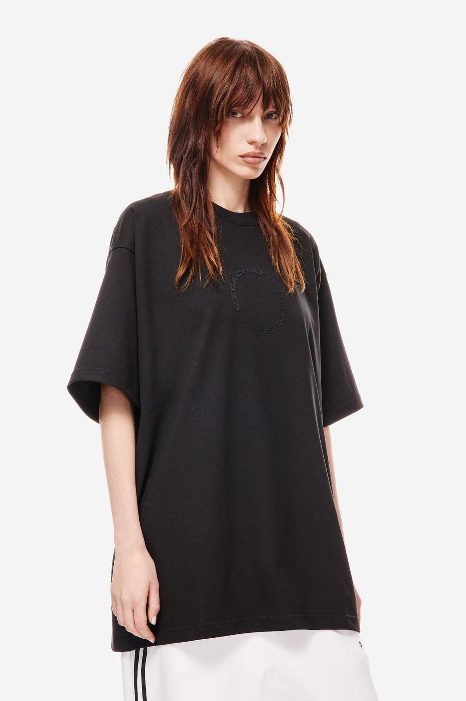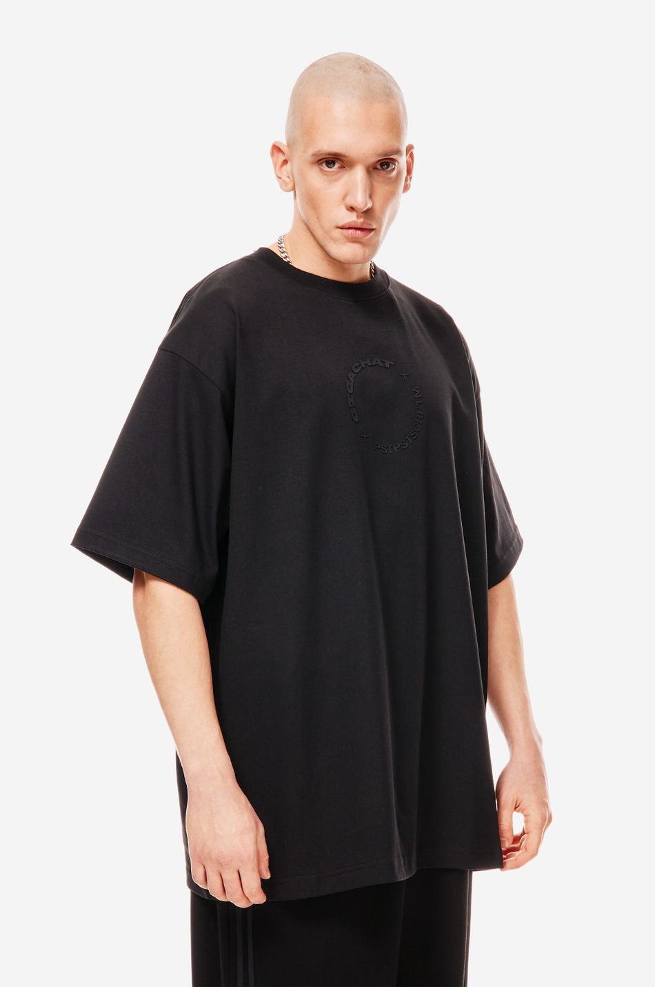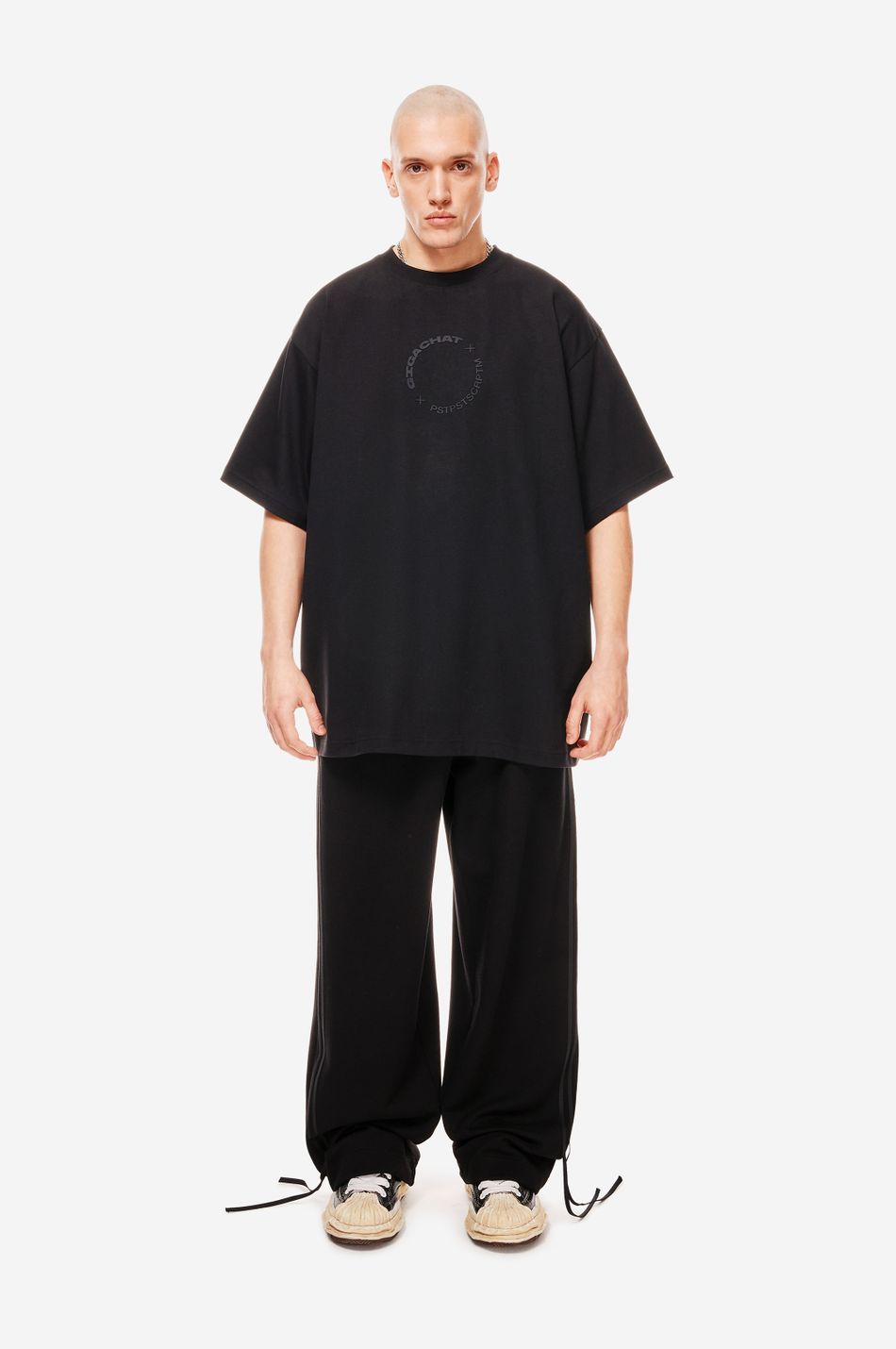 футболка силуэта oversize из плотного хлопка. модель с круглой горловиной и широкими рукавами дополнена спереди логотипом бренда, составленным из прорезиненных букв PSTPSTSCRPTM.