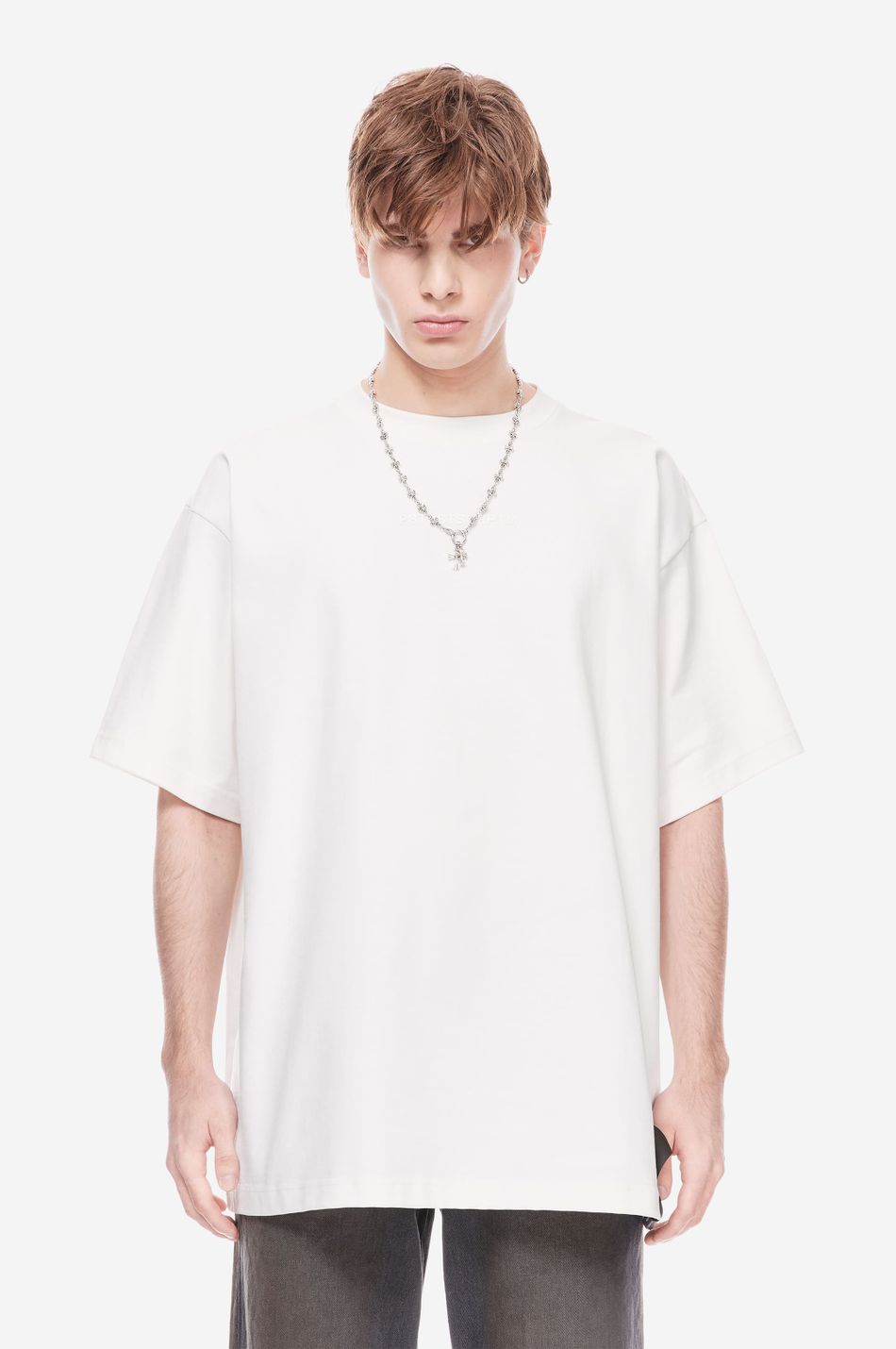 футболка силуэта oversize из плотного хлопка. модель с круглой горловиной и широкими рукавами дополнена спереди логотипом бренда, составленным из прорезиненных букв PSTPSTSCRPTM.