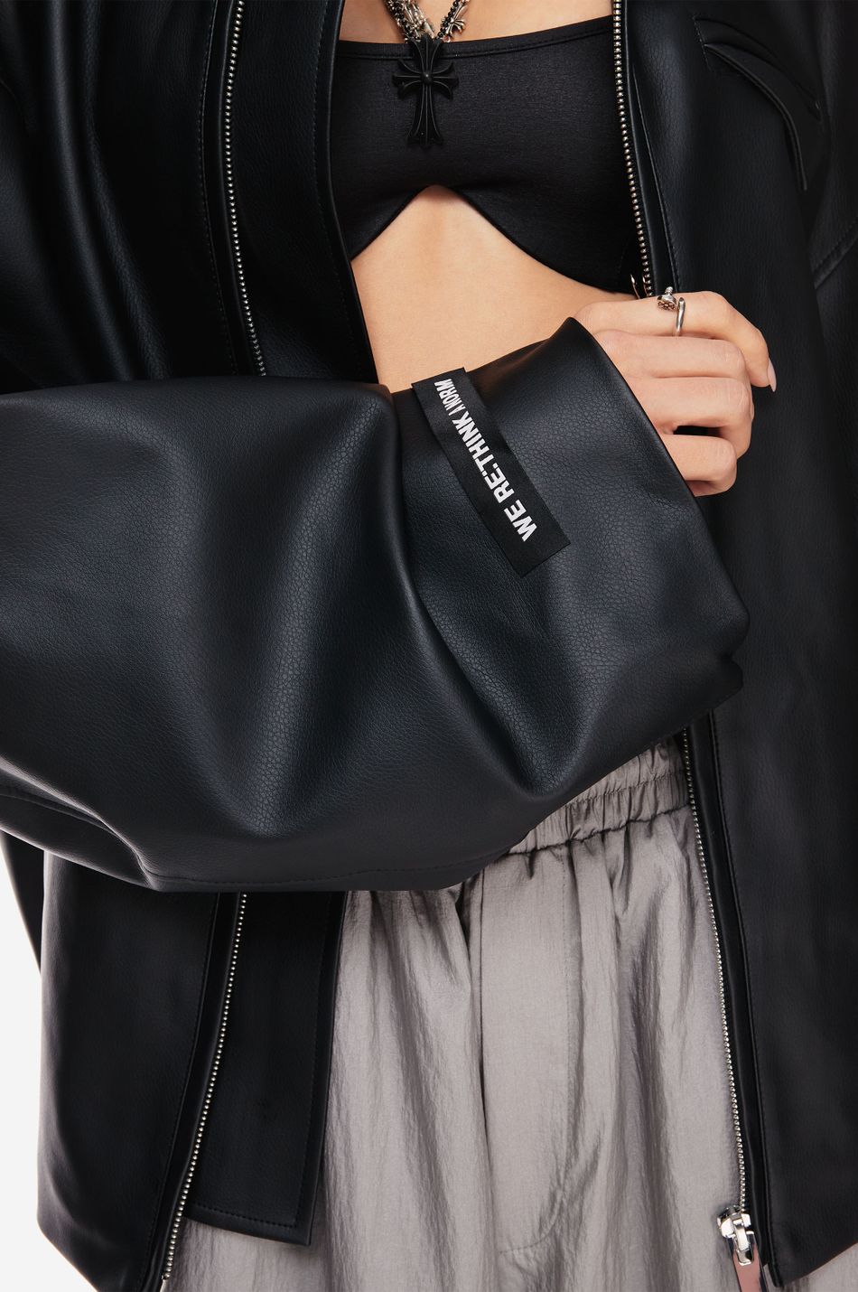 черная куртка силуэта oversize выполнена из структурной и плотной искусственной кожи. модель, застегивающуюся на молнию, дополнили защипы на рукавах, тем самым позволив создать исключительный силуэт. декоративный карман с треугольным клапаном на груди, прорезные карманы по бокам, контрастный слоган на рукаве и широкая лента с логотипом бренда — основные узнаваемые детали. стилисты советуют сочетать куртку как с джинсами, так и с легкими образами.