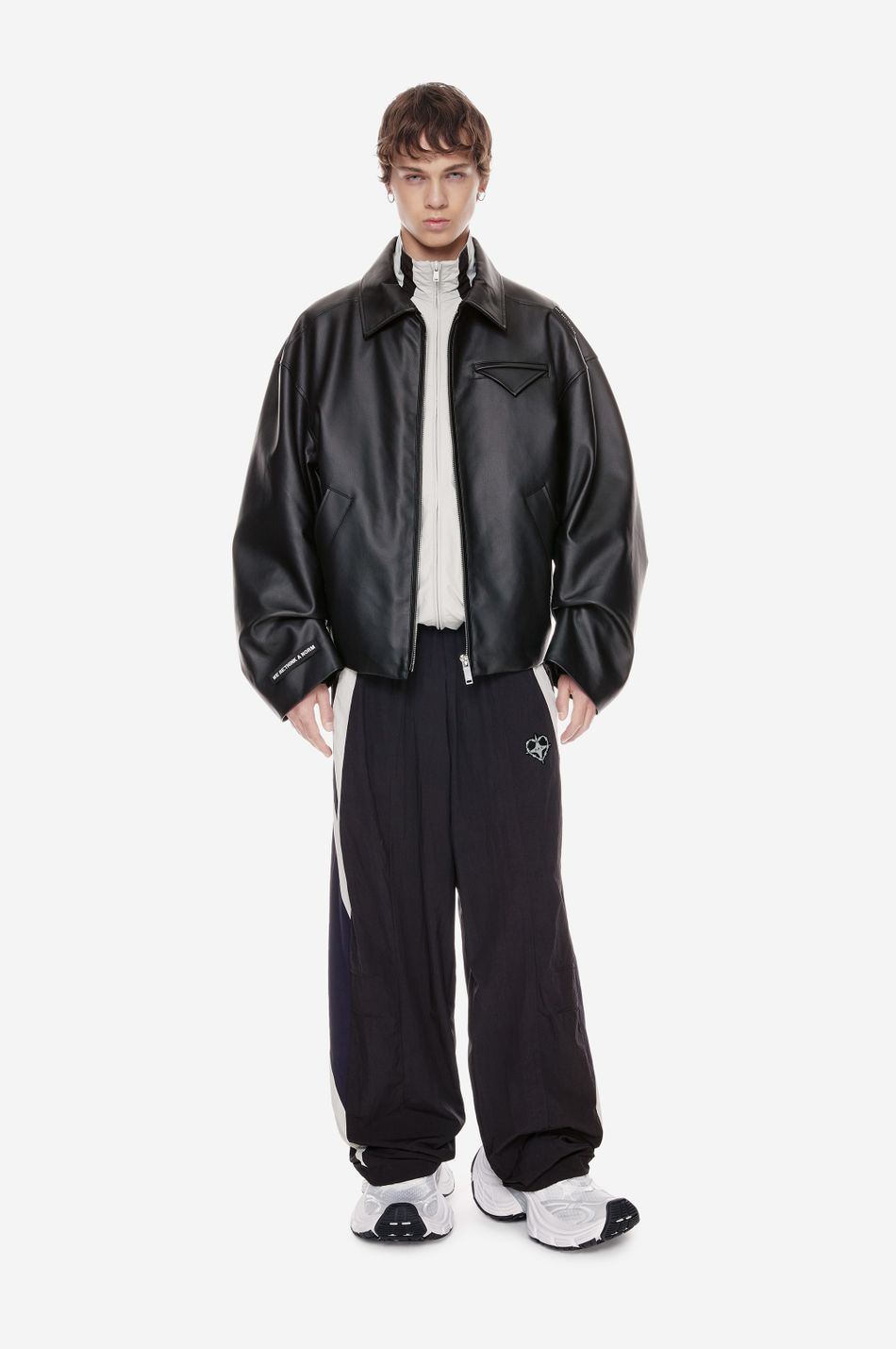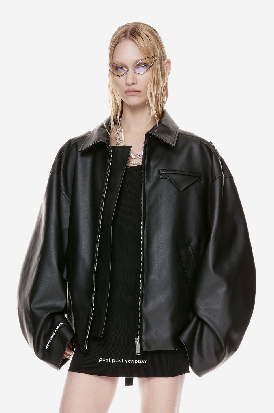 черная куртка силуэта oversize выполнена из структурной и плотной искусственной кожи. модель, застегивающуюся на молнию, дополнили защипы на рукавах, тем самым позволив создать исключительный силуэт. декоративный карман с треугольным клапаном на груди, прорезные карманы по бокам, контрастный слоган на рукаве и широкая лента с логотипом бренда — основные узнаваемые детали. стилисты советуют сочетать куртку как с джинсами, так и с легкими образами.