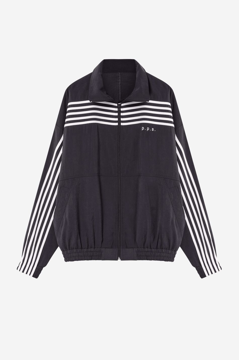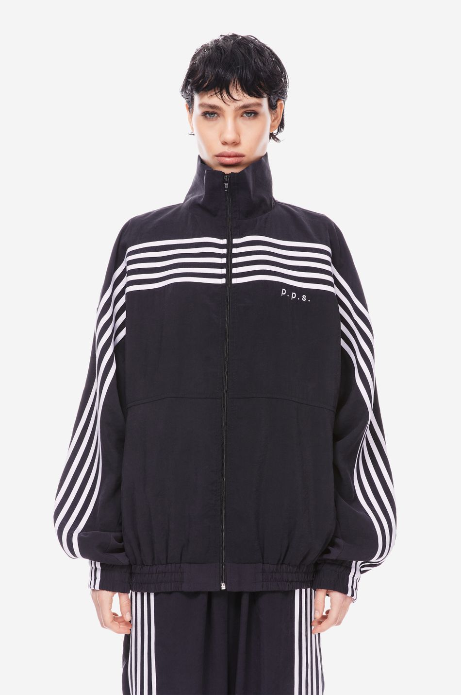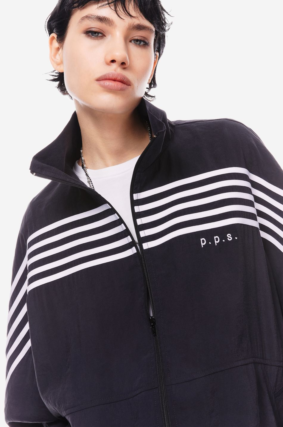 оверсайз-куртка на молнии с графичными лампасами — переосмысление спортивной классики. для пошива использовали тонко текстурированную вискозную ткань (модал с хлопком). акцентные лампасы, объёмные рукава, высокий ворот и эластичный низ формируют силуэт, созданный для комфорта без компромиссов в стиле. вышитый логотип p.p.s. на груди завершает образ
