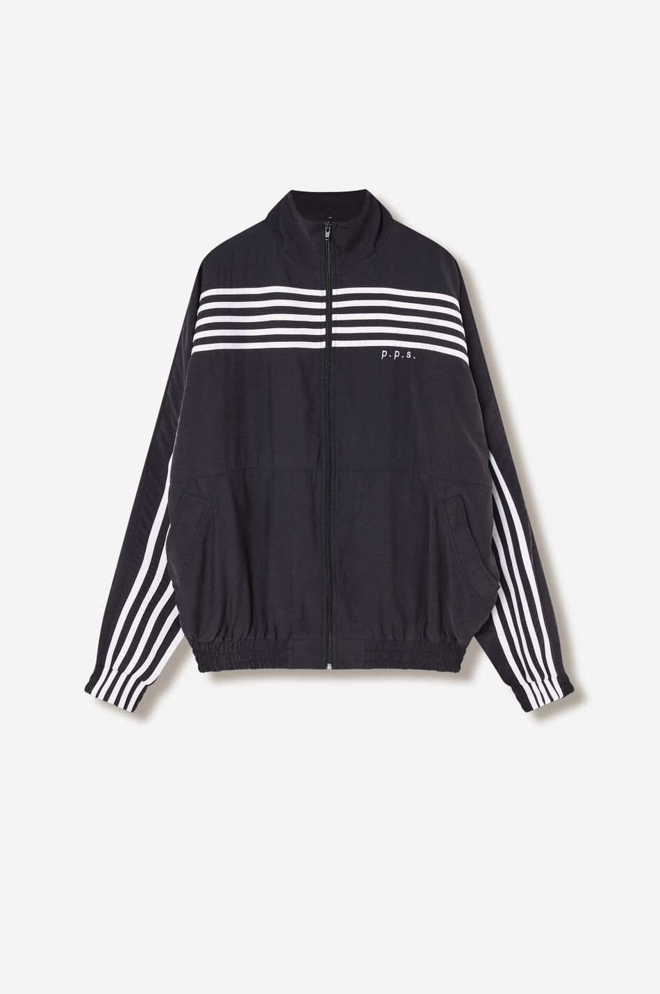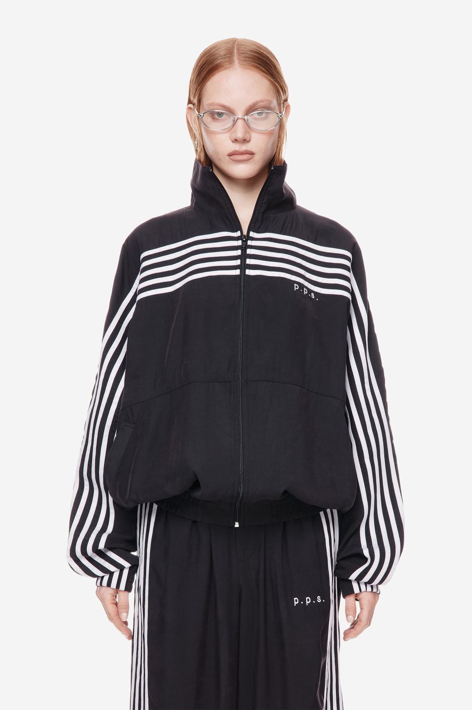 оверсайз-куртка на молнии с графичными лампасами — переосмысление спортивной классики. для пошива использовали тонко текстурированную вискозную ткань (модал с хлопком). акцентные лампасы, объёмные рукава, высокий ворот и эластичный низ формируют силуэт, созданный для комфорта без компромиссов в стиле. вышитый логотип p.p.s. на груди завершает образ