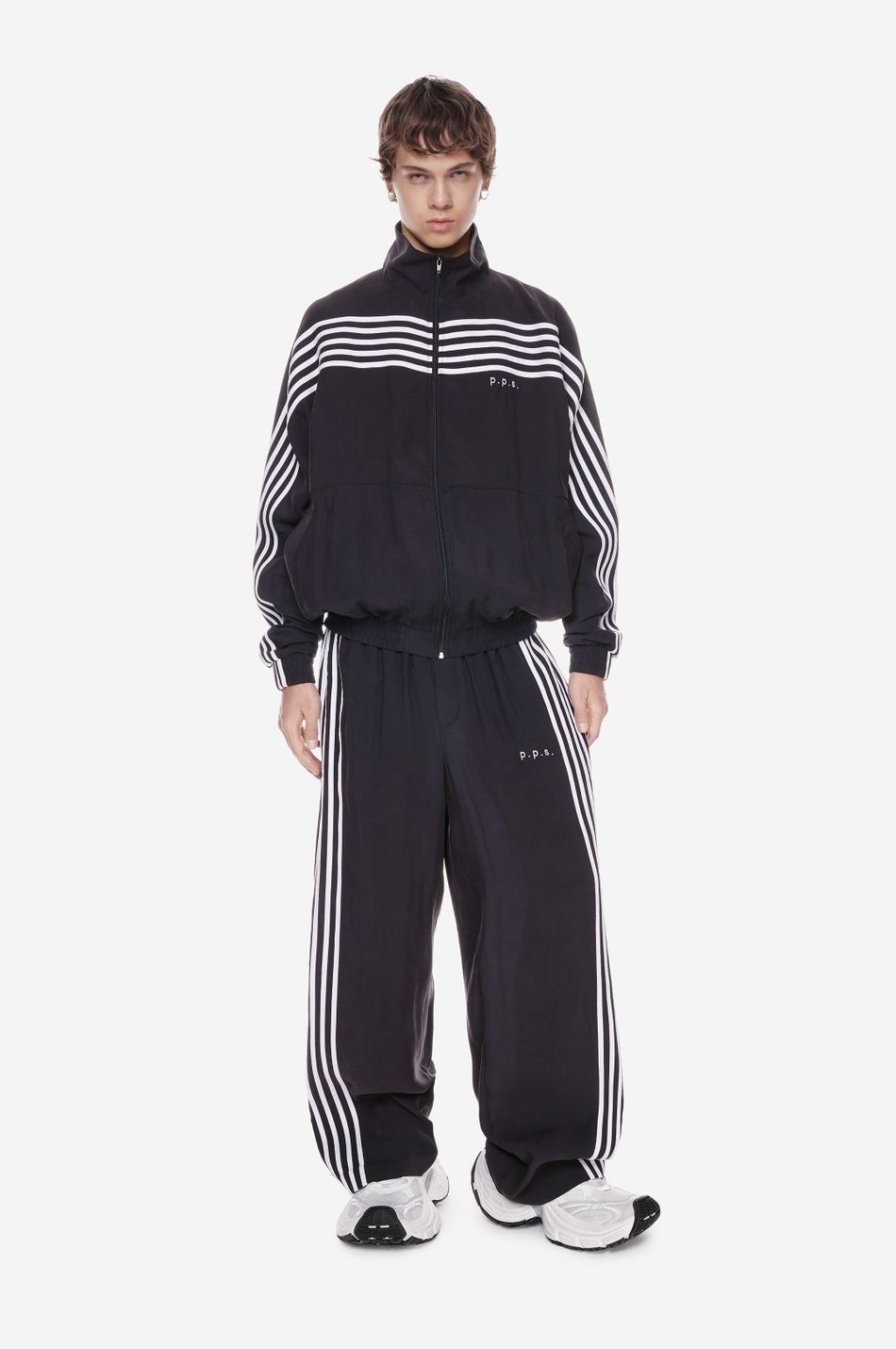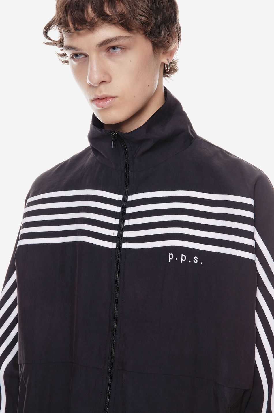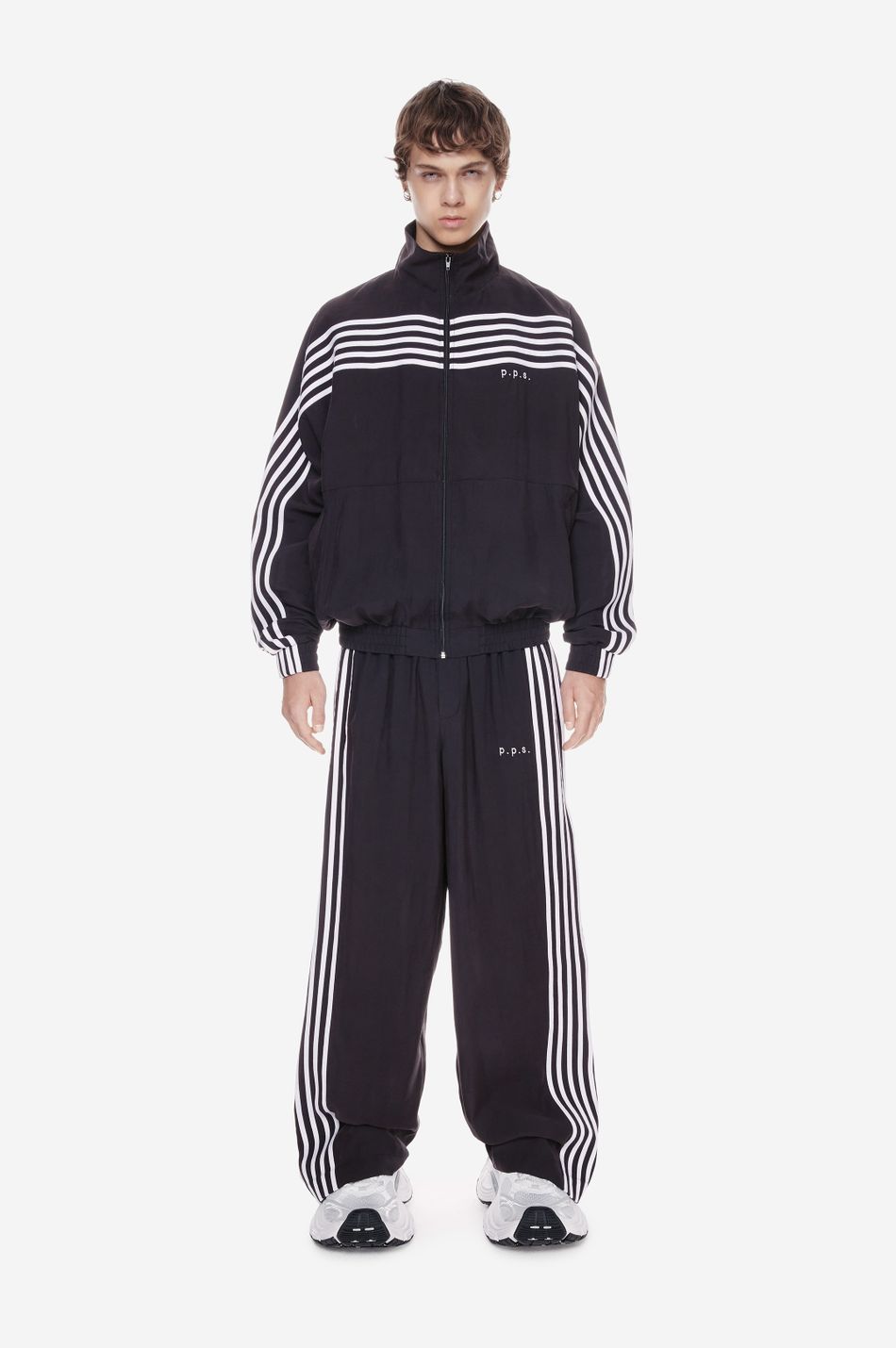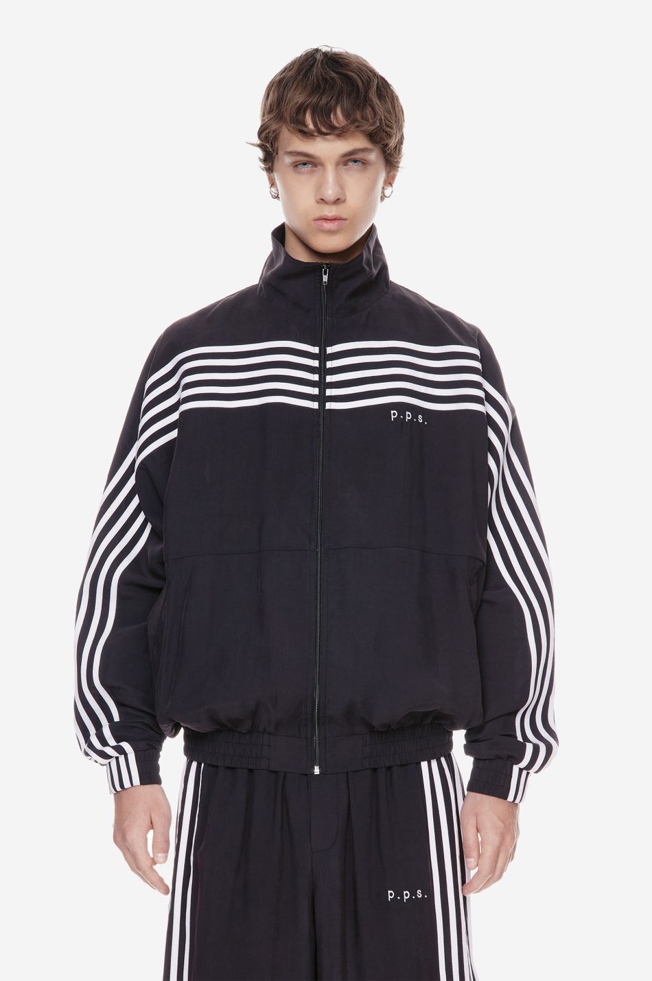 оверсайз-куртка на молнии с графичными лампасами — переосмысление спортивной классики. для пошива использовали тонко текстурированную вискозную ткань (модал с хлопком). акцентные лампасы, объёмные рукава, высокий ворот и эластичный низ формируют силуэт, созданный для комфорта без компромиссов в стиле. вышитый логотип p.p.s. на груди завершает образ