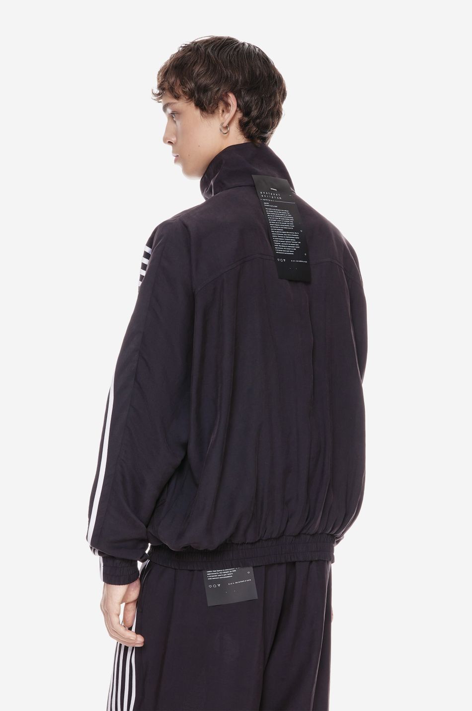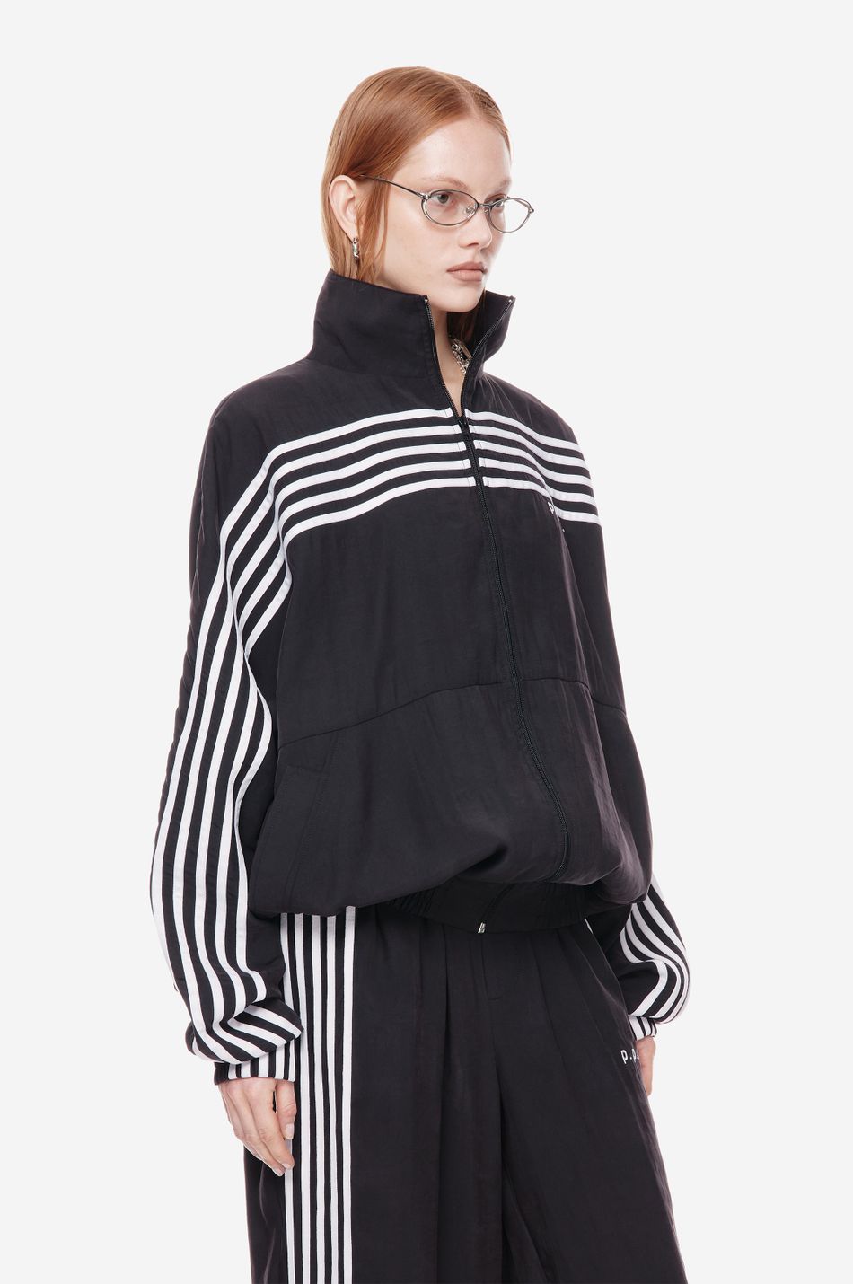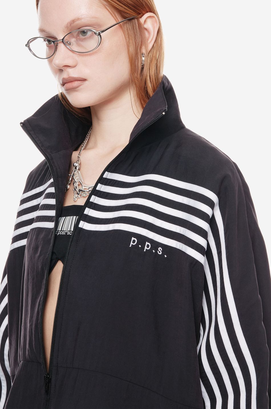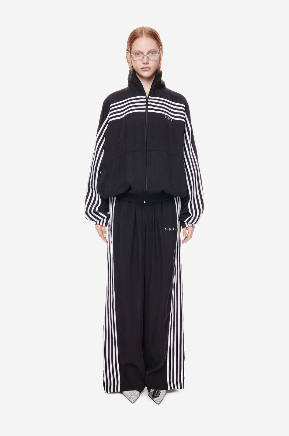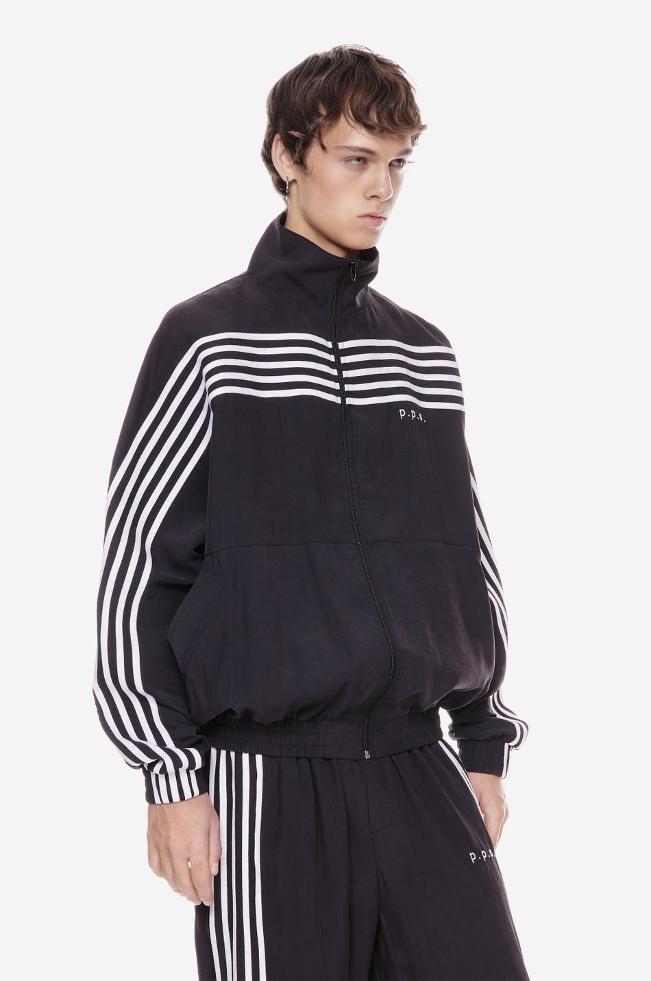 оверсайз-куртка на молнии с графичными лампасами — переосмысление спортивной классики. для пошива использовали тонко текстурированную вискозную ткань (модал с хлопком). акцентные лампасы, объёмные рукава, высокий ворот и эластичный низ формируют силуэт, созданный для комфорта без компромиссов в стиле. вышитый логотип p.p.s. на груди завершает образ