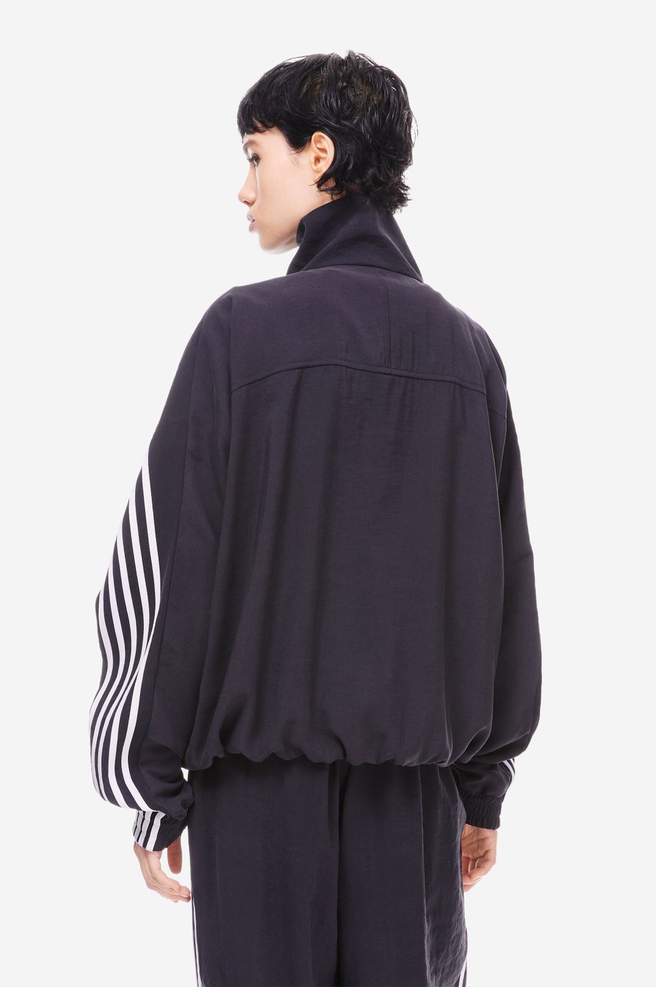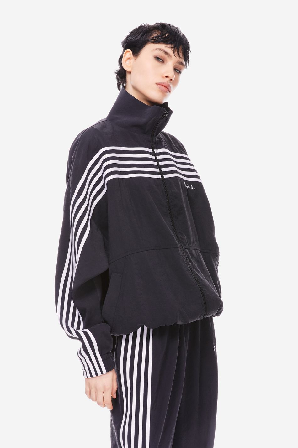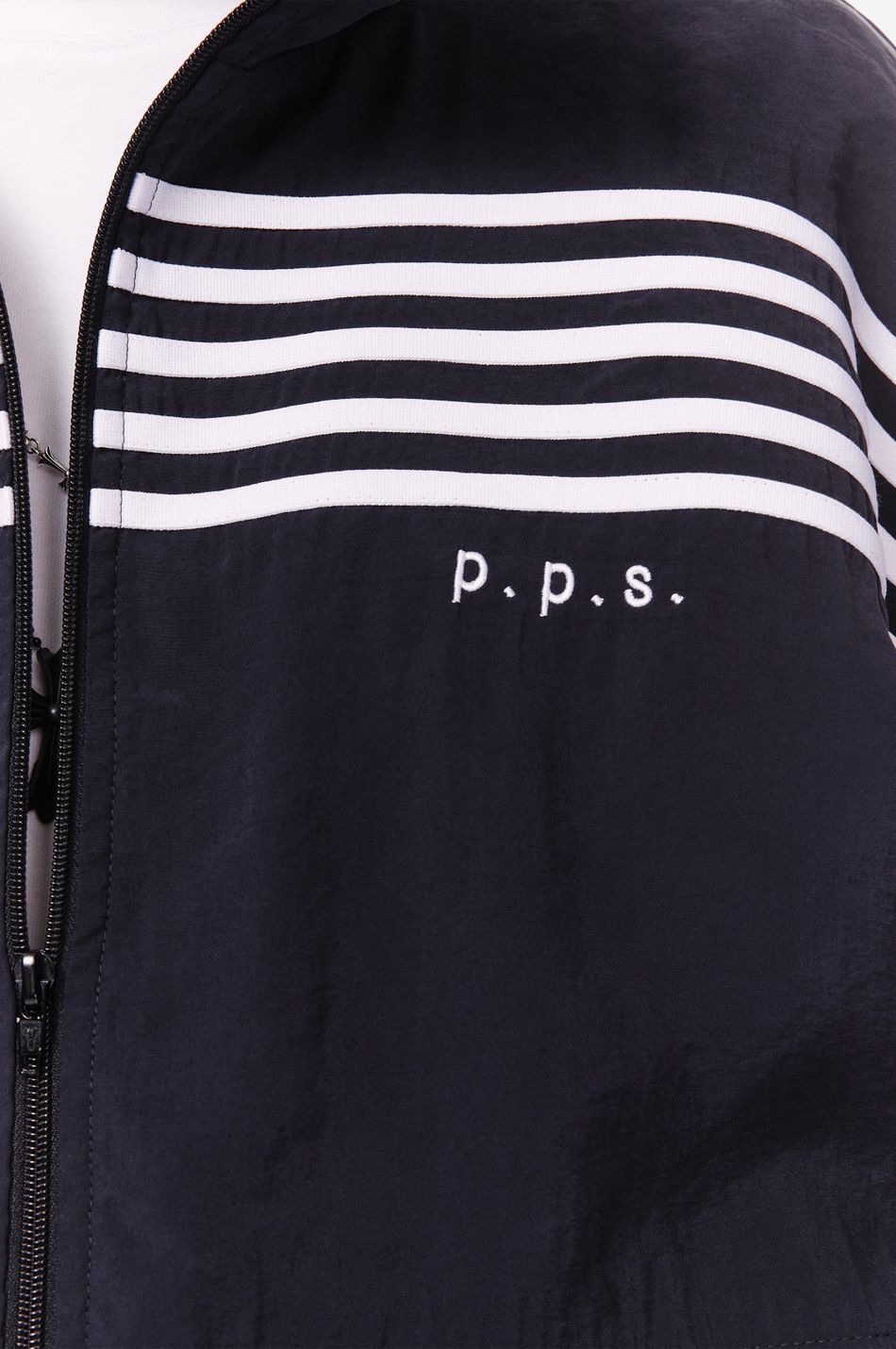 оверсайз-куртка на молнии с графичными лампасами — переосмысление спортивной классики. для пошива использовали тонко текстурированную вискозную ткань (модал с хлопком). акцентные лампасы, объёмные рукава, высокий ворот и эластичный низ формируют силуэт, созданный для комфорта без компромиссов в стиле. вышитый логотип p.p.s. на груди завершает образ