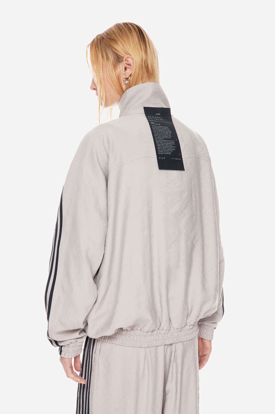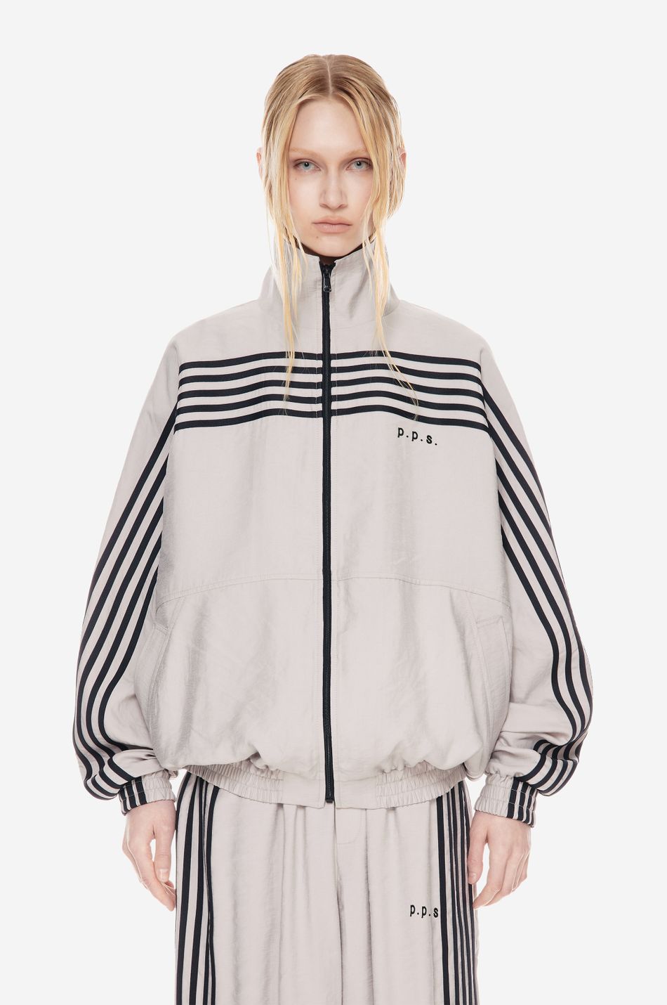 оверсайз-куртка на молнии с графичными лампасами — переосмысление спортивной классики. для пошива использовали тонко текстурированную вискозную ткань (модал с хлопком). акцентные лампасы, объёмные рукава, высокий ворот и эластичный низ формируют силуэт, созданный для комфорта без компромиссов в стиле. вышитый логотип p.p.s. на груди завершает образ