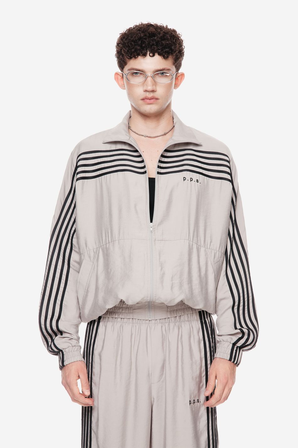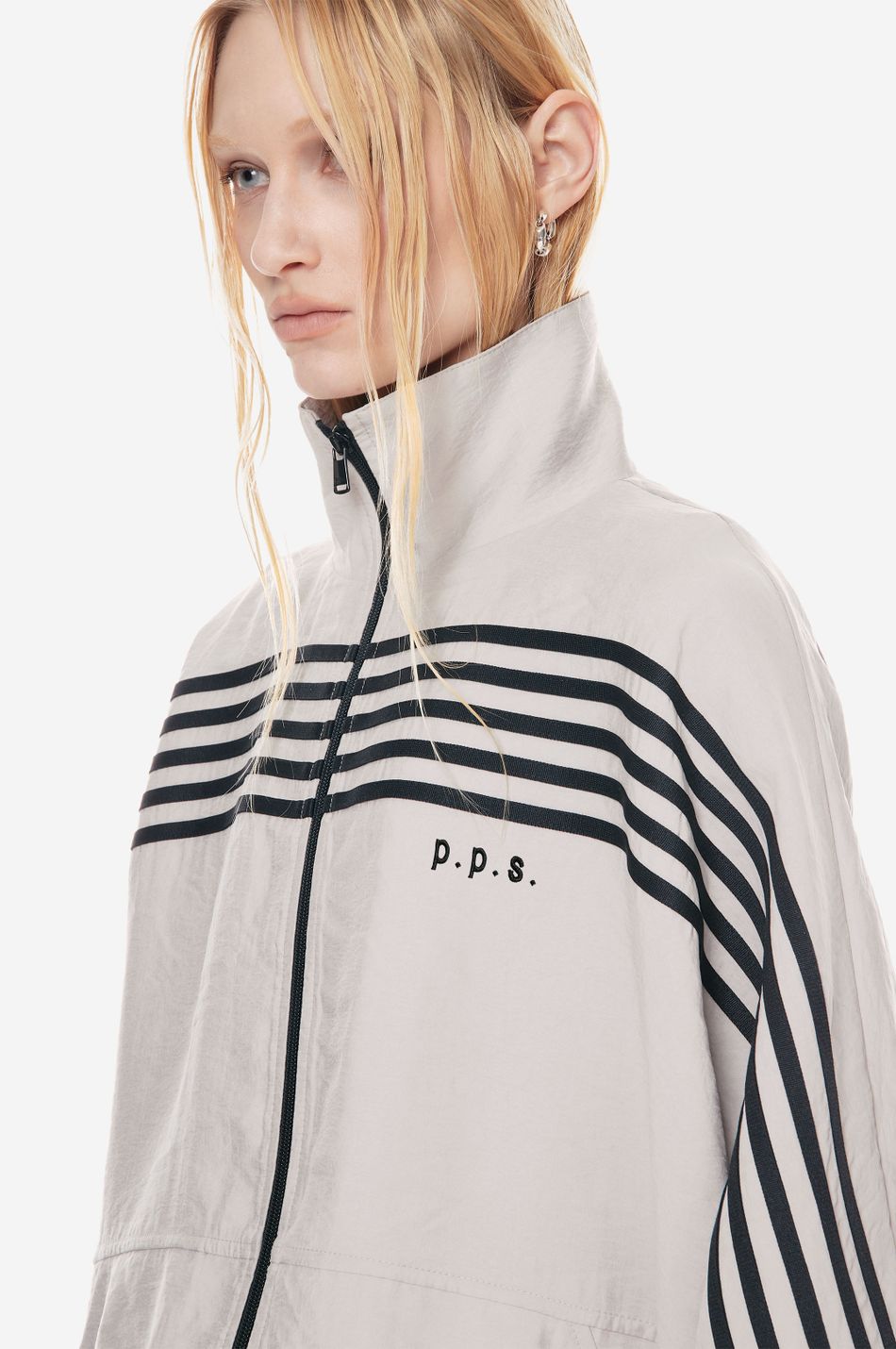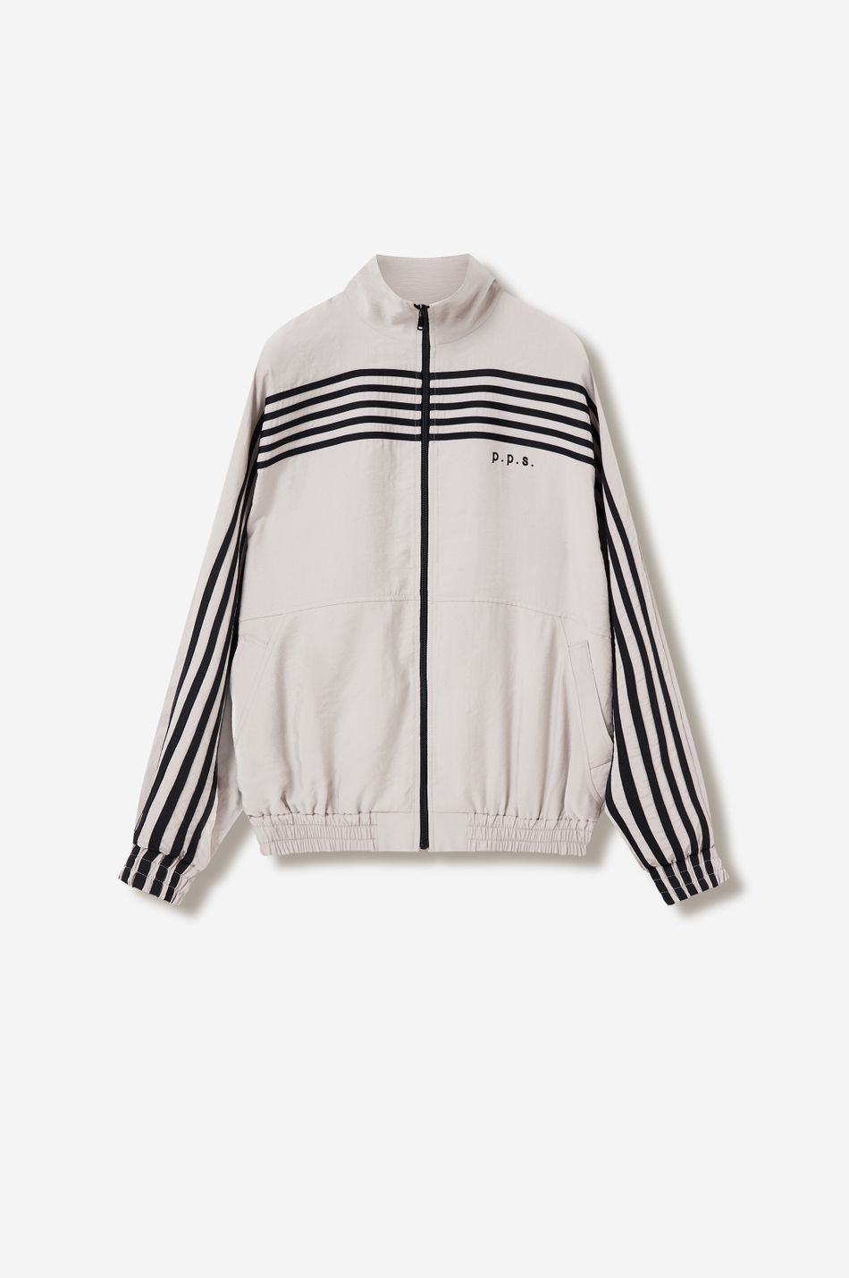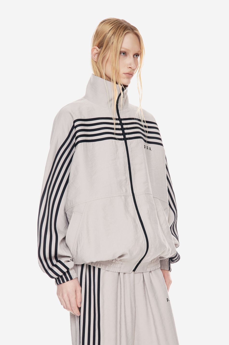 оверсайз-куртка на молнии с графичными лампасами — переосмысление спортивной классики. для пошива использовали тонко текстурированную вискозную ткань (модал с хлопком). акцентные лампасы, объёмные рукава, высокий ворот и эластичный низ формируют силуэт, созданный для комфорта без компромиссов в стиле. вышитый логотип p.p.s. на груди завершает образ
