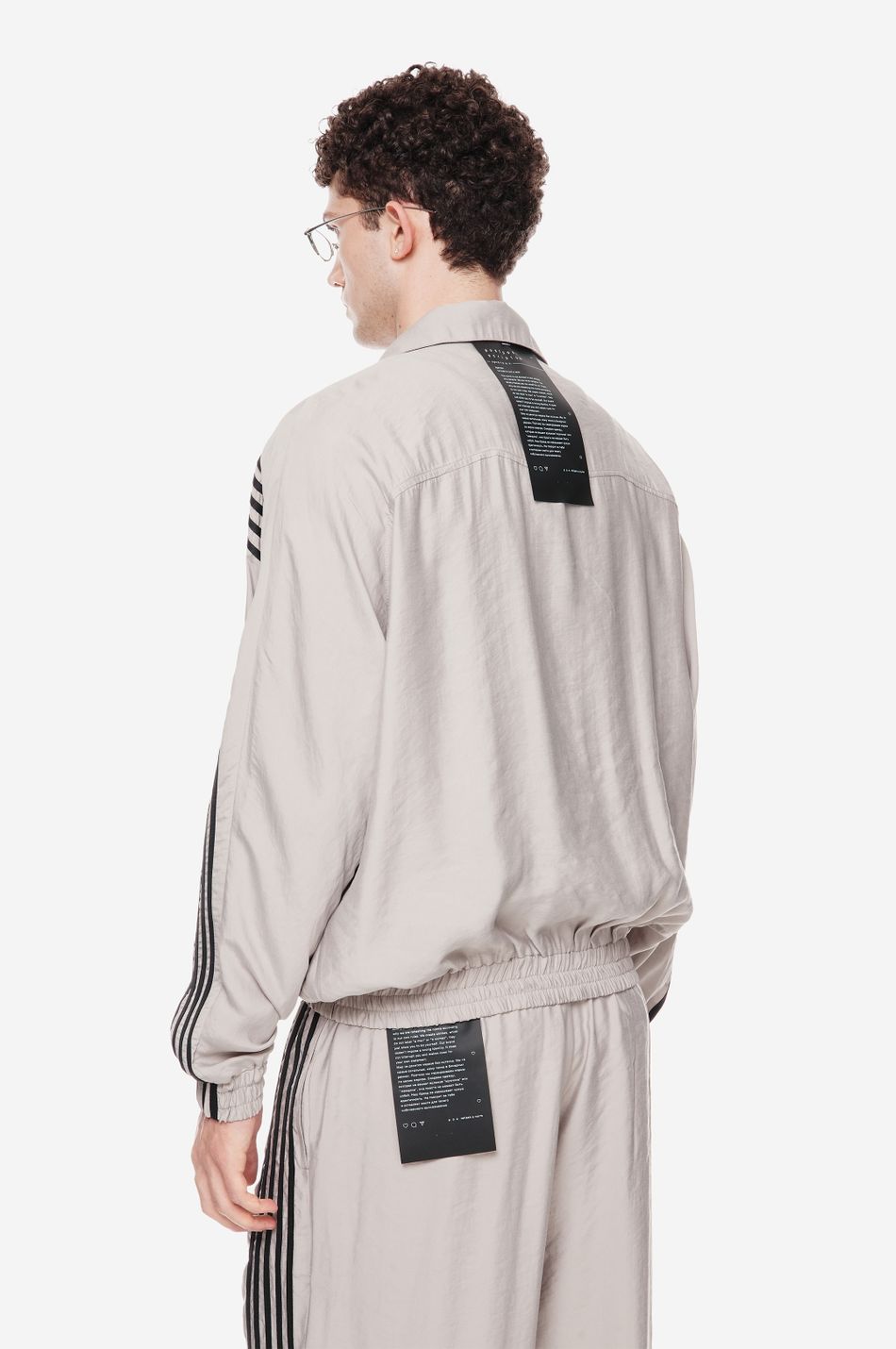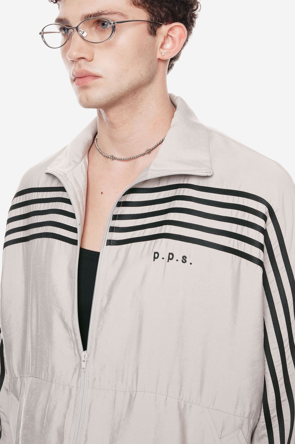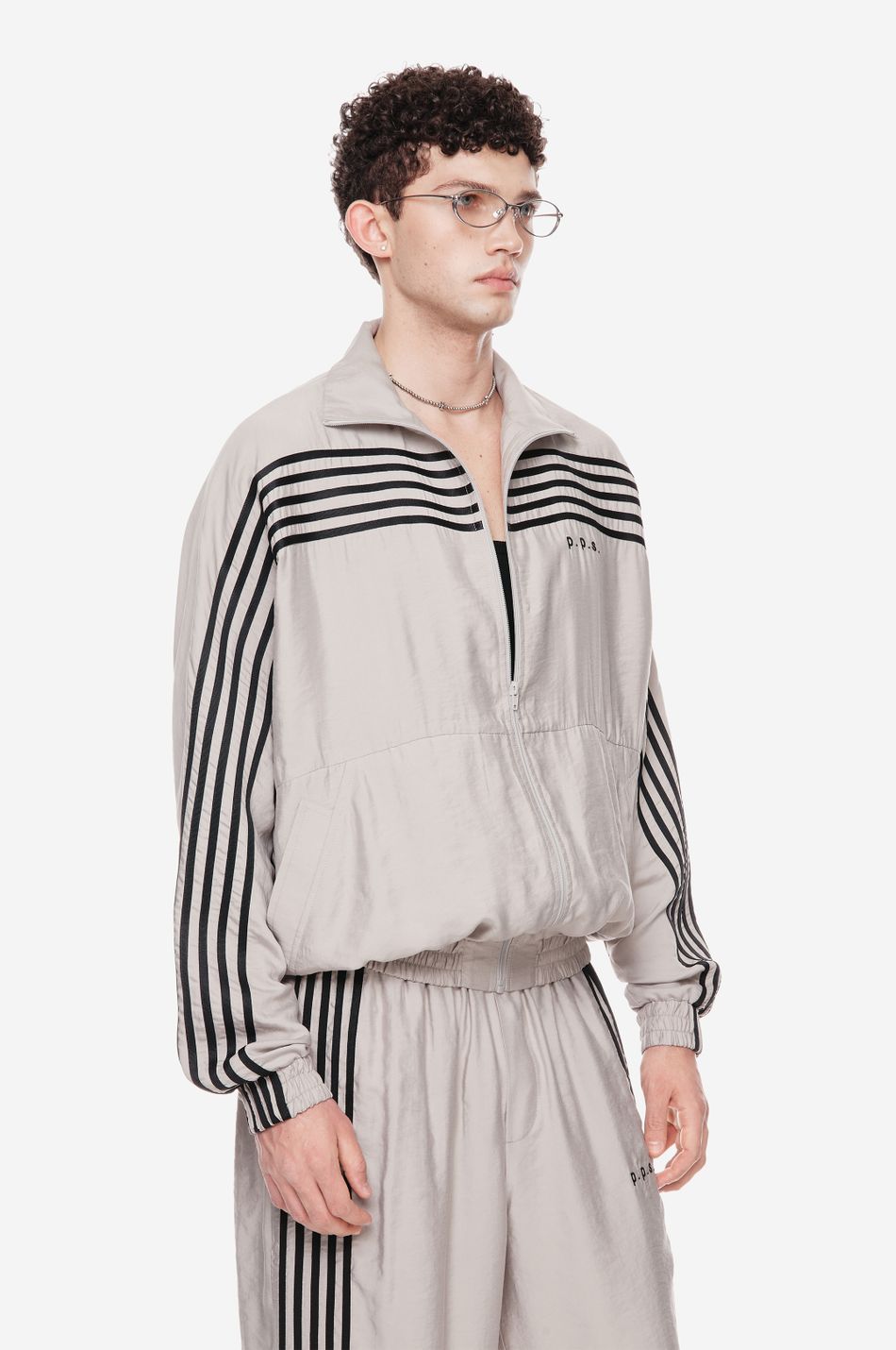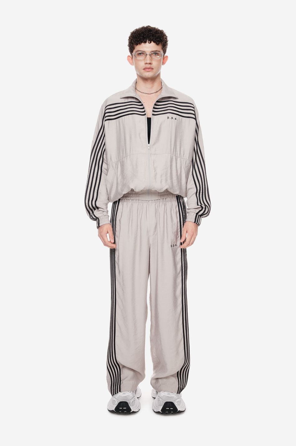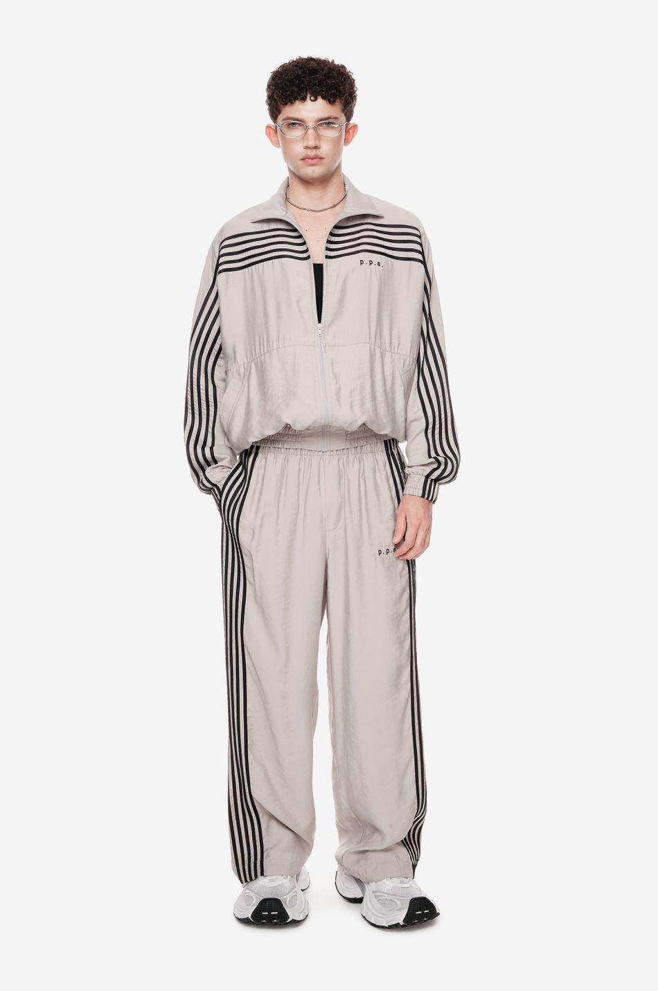 оверсайз-куртка на молнии с графичными лампасами — переосмысление спортивной классики. для пошива использовали тонко текстурированную вискозную ткань (модал с хлопком). акцентные лампасы, объёмные рукава, высокий ворот и эластичный низ формируют силуэт, созданный для комфорта без компромиссов в стиле. вышитый логотип p.p.s. на груди завершает образ