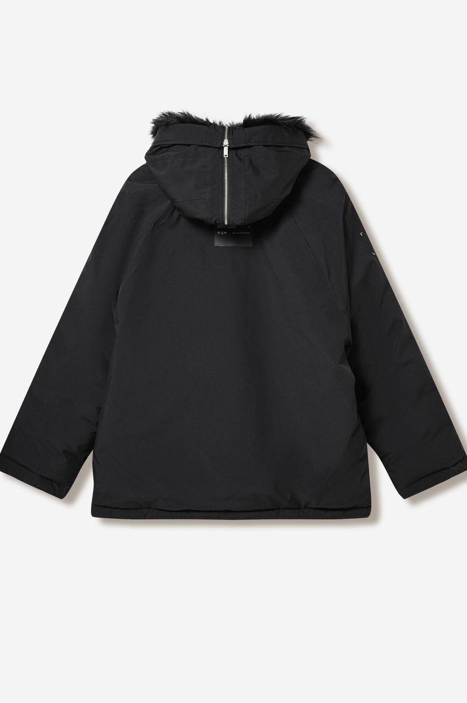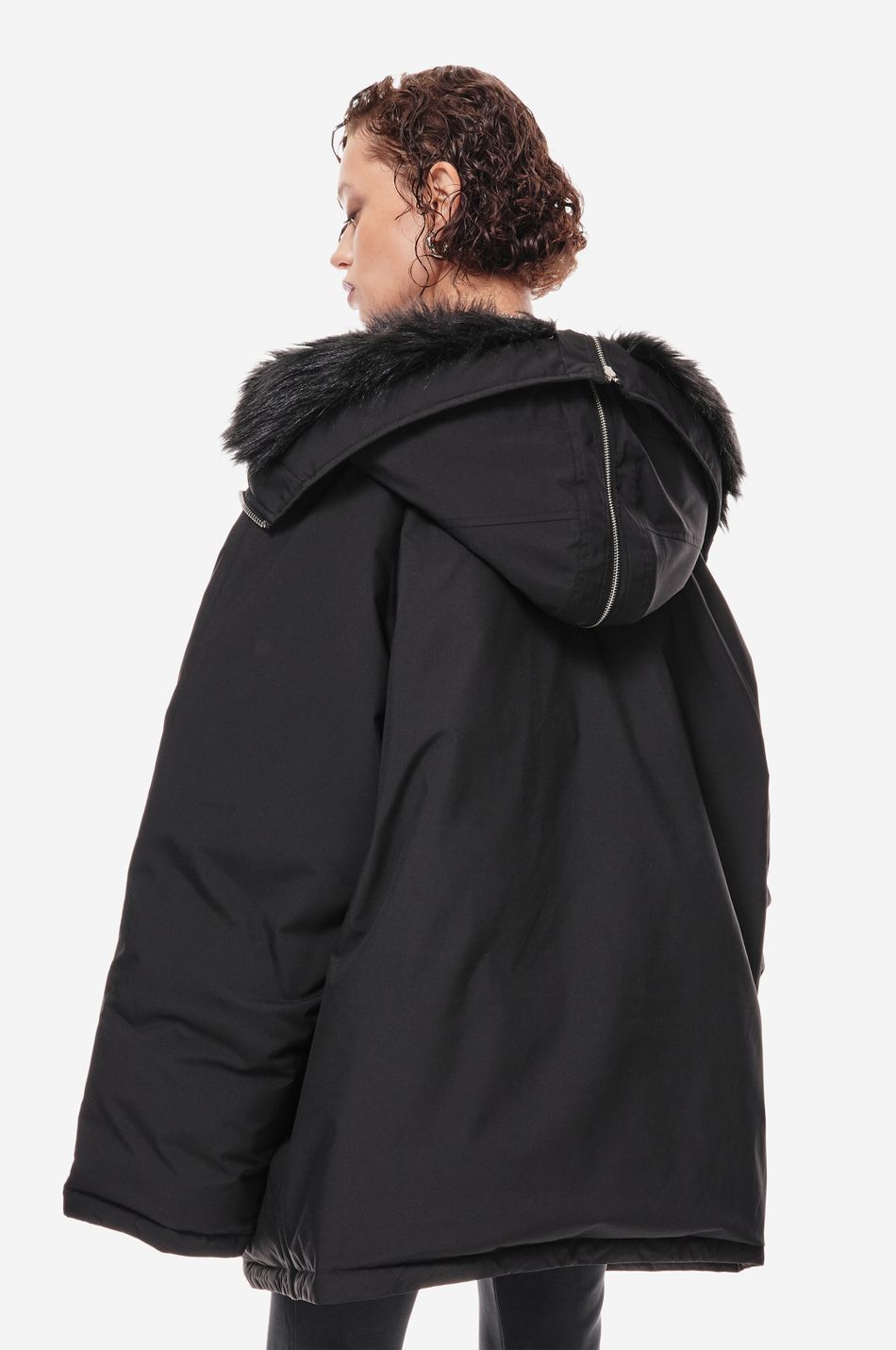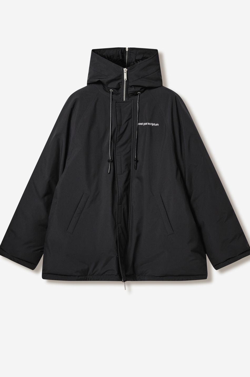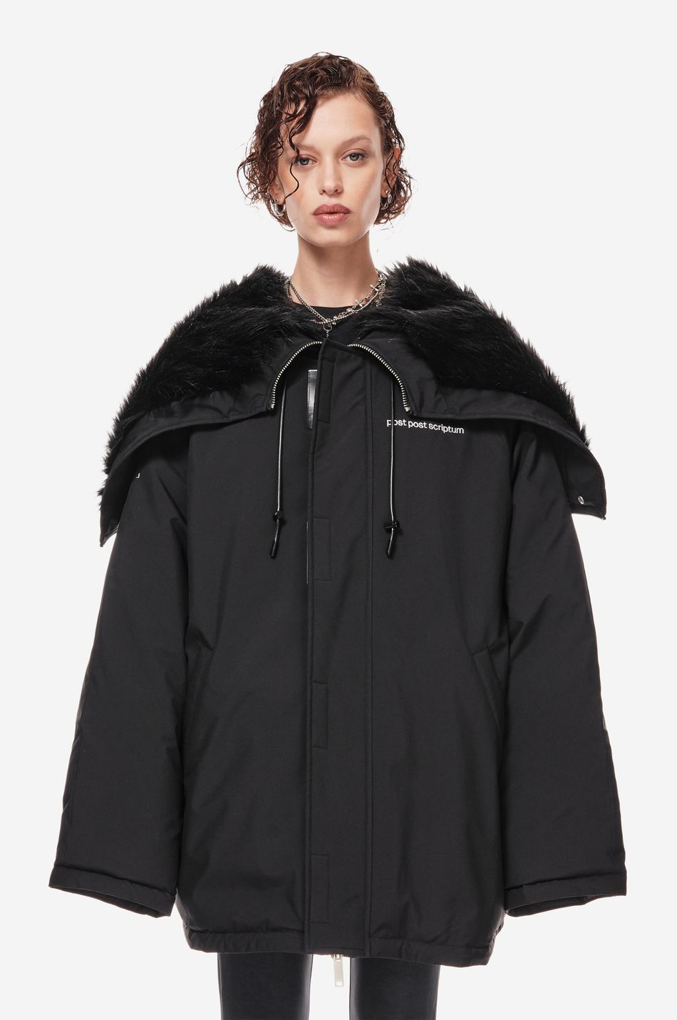 COLD LINE — утилитарная парка с архитектурным кроем. матовый полиэстер сочетается с пуховым утеплением и меховой подкладкой. система регулировок (капюшон, низ) и двухзамковая молния подчеркивают функциональность. днк бренда — металлические буквы post post scriptum на груди. форма, созданная для экстремальных -30°C.