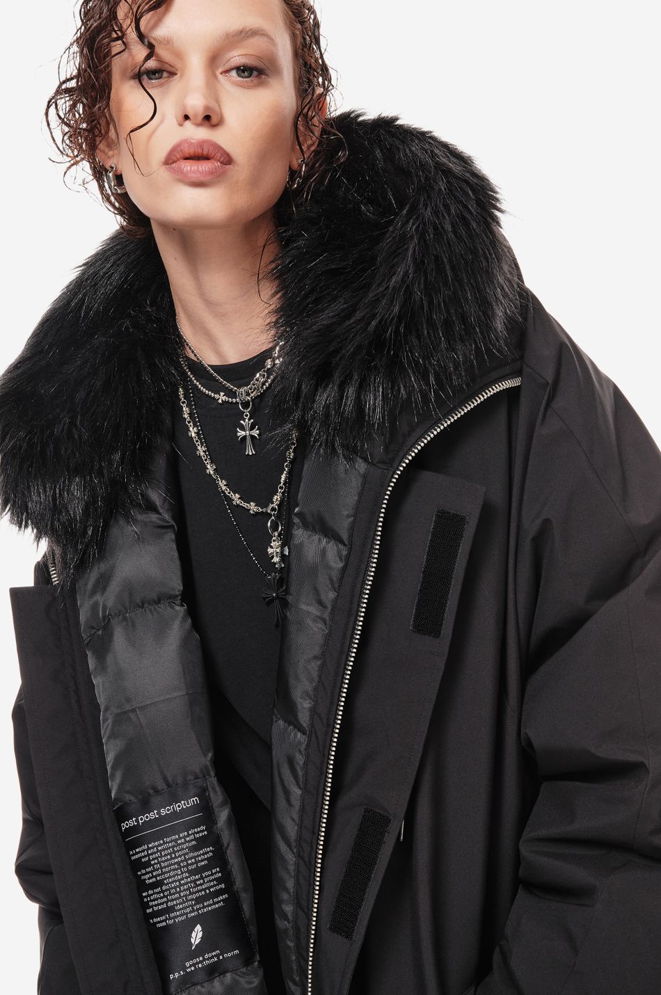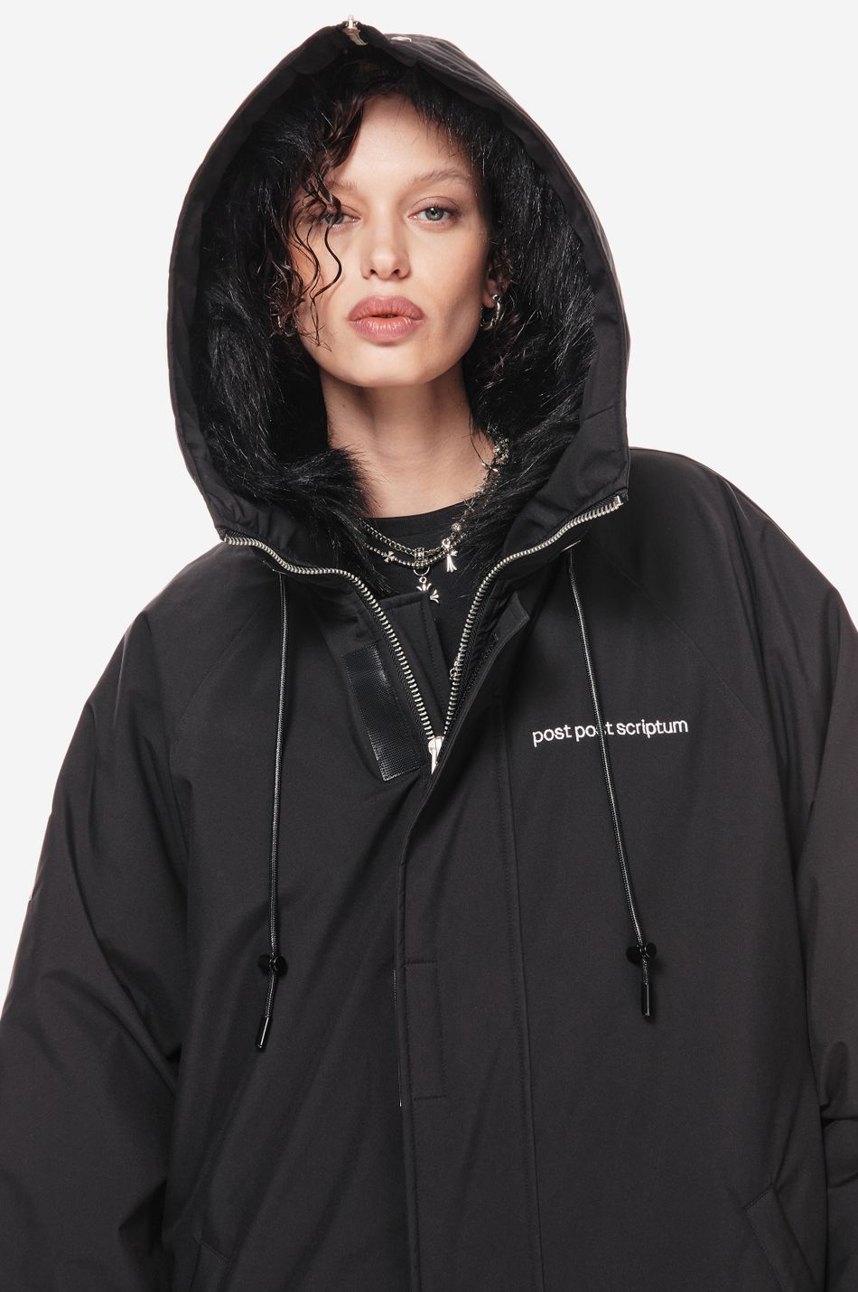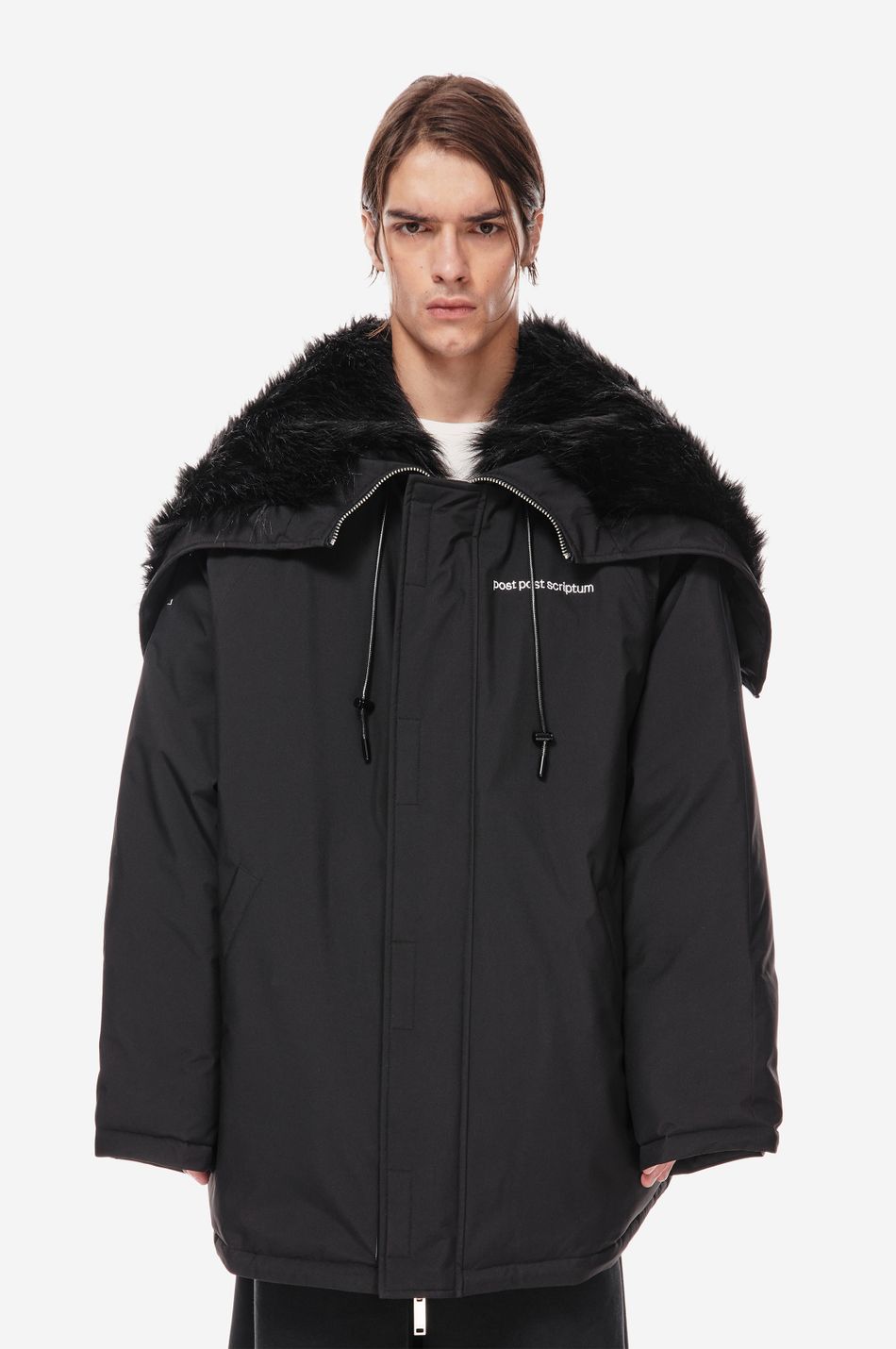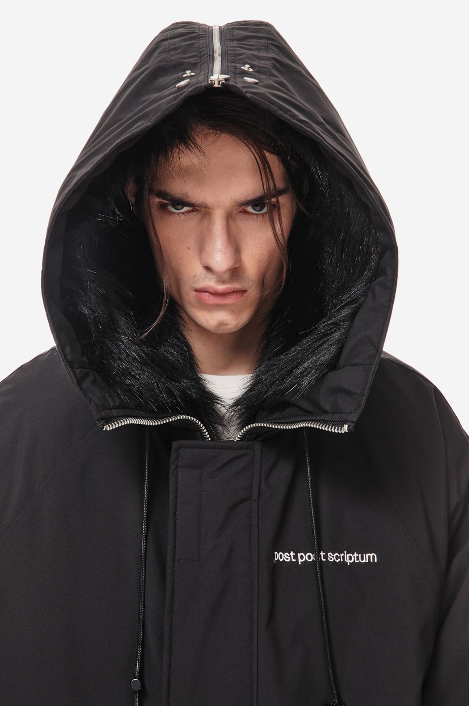 COLD LINE — утилитарная парка с архитектурным кроем. матовый полиэстер сочетается с пуховым утеплением и меховой подкладкой. система регулировок (капюшон, низ) и двухзамковая молния подчеркивают функциональность. днк бренда — металлические буквы post post scriptum на груди. форма, созданная для экстремальных -30°C.