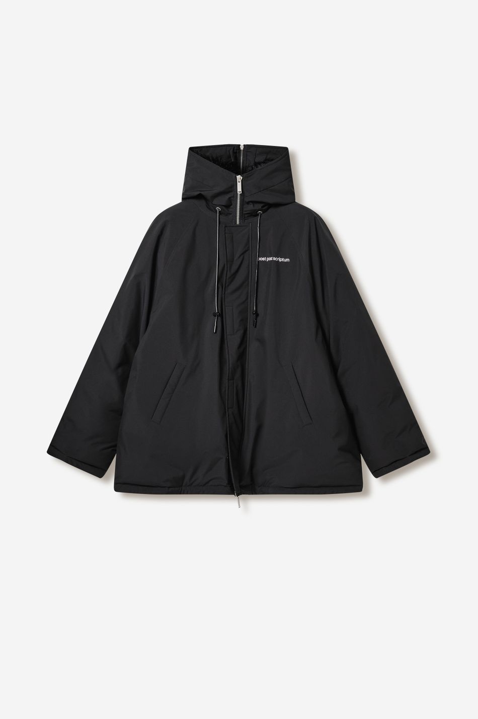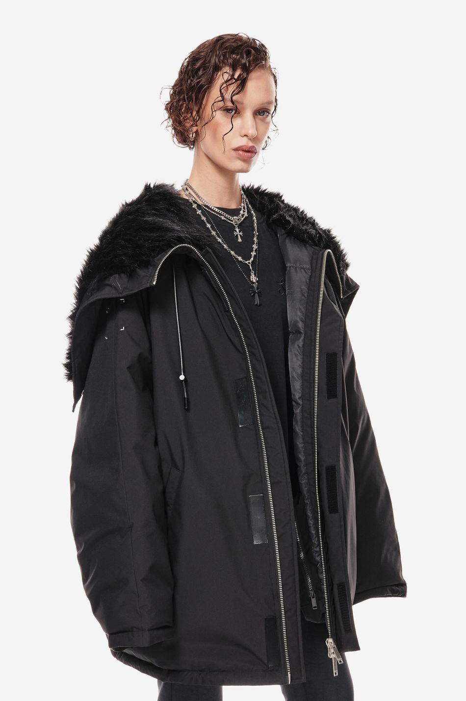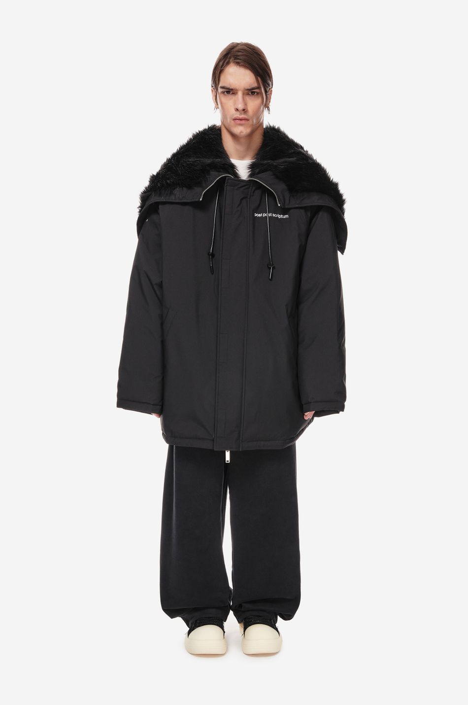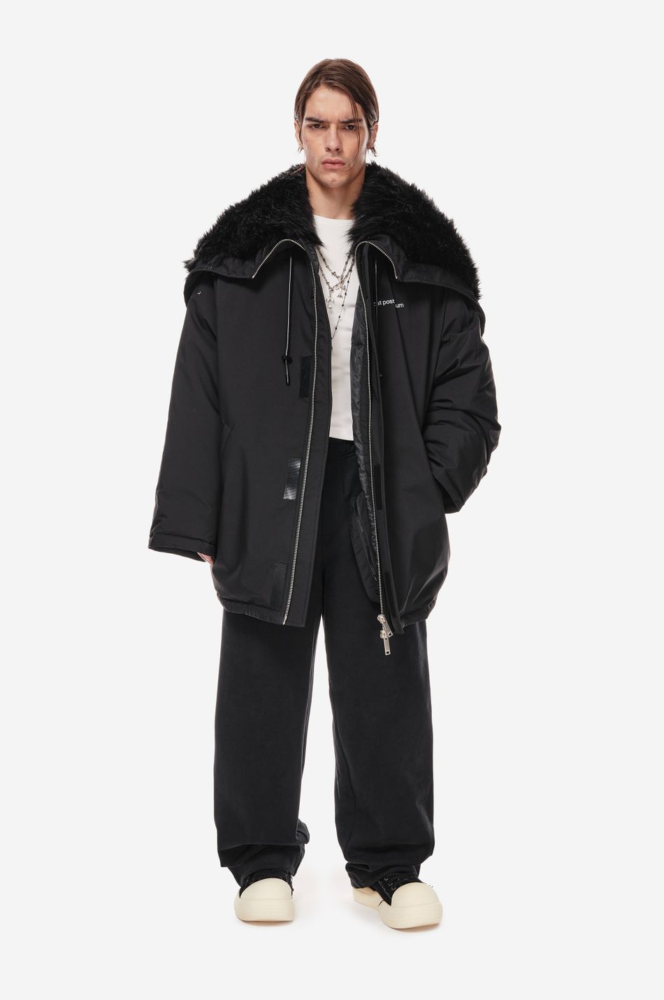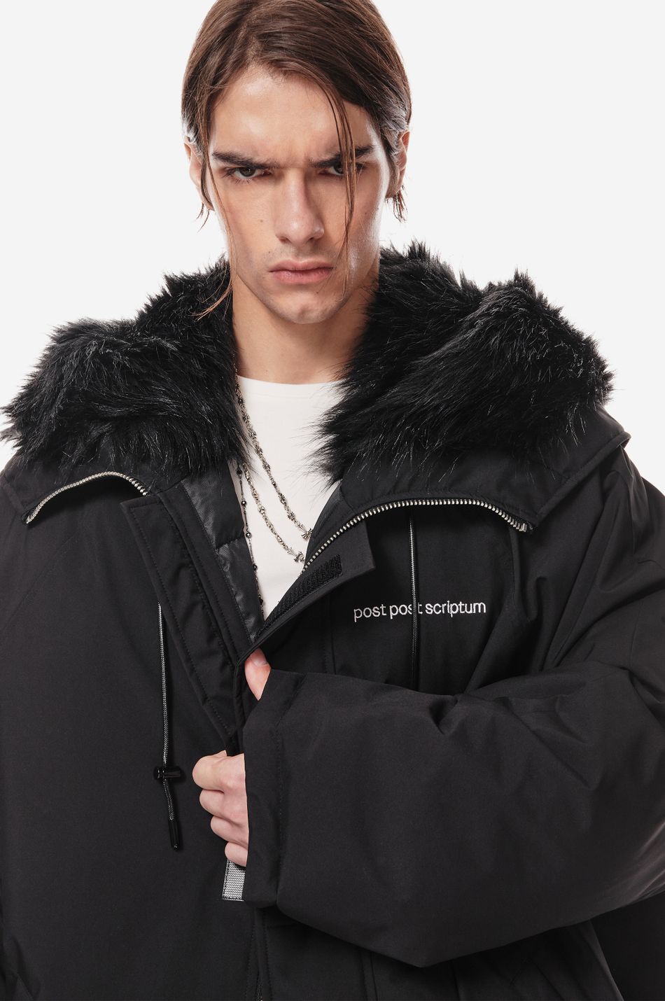 COLD LINE — утилитарная парка с архитектурным кроем. матовый полиэстер сочетается с пуховым утеплением и меховой подкладкой. система регулировок (капюшон, низ) и двухзамковая молния подчеркивают функциональность. днк бренда — металлические буквы post post scriptum на груди. форма, созданная для экстремальных -30°C.