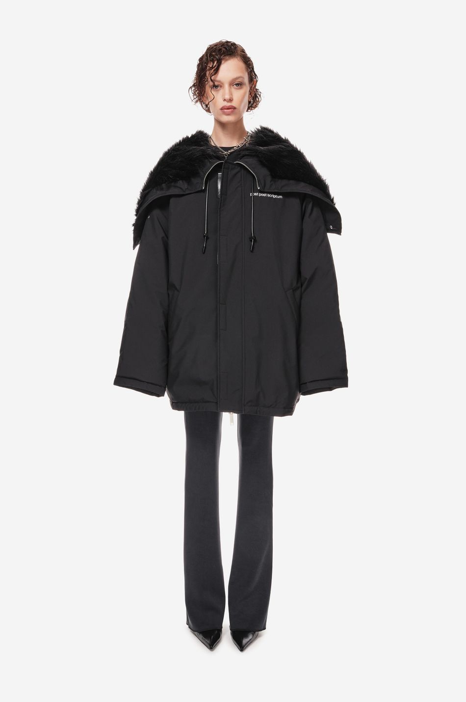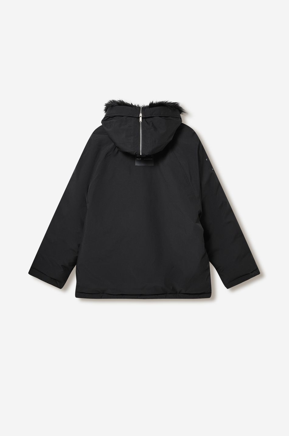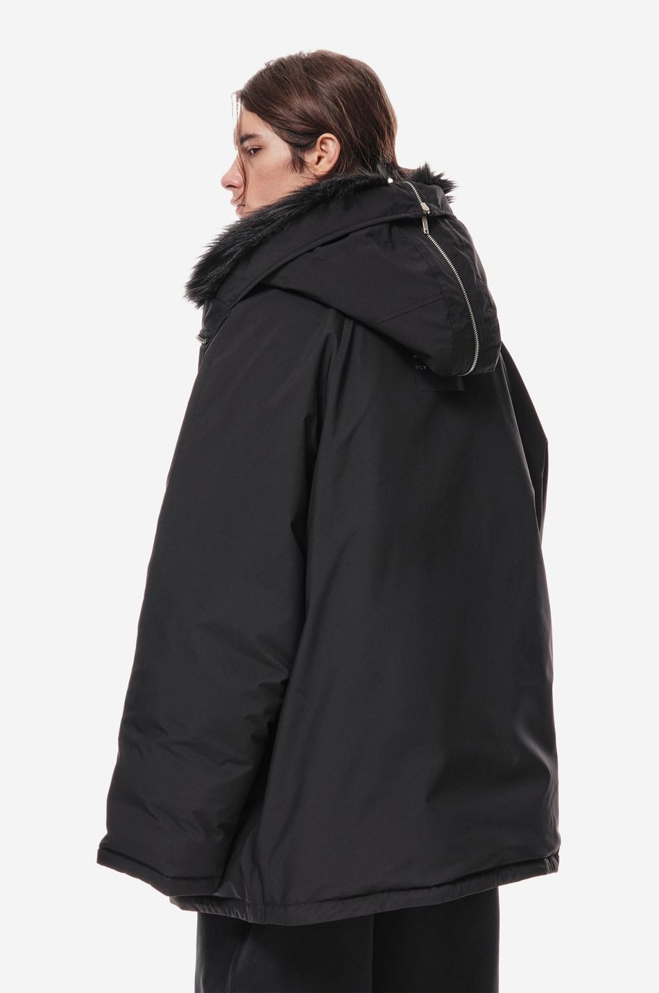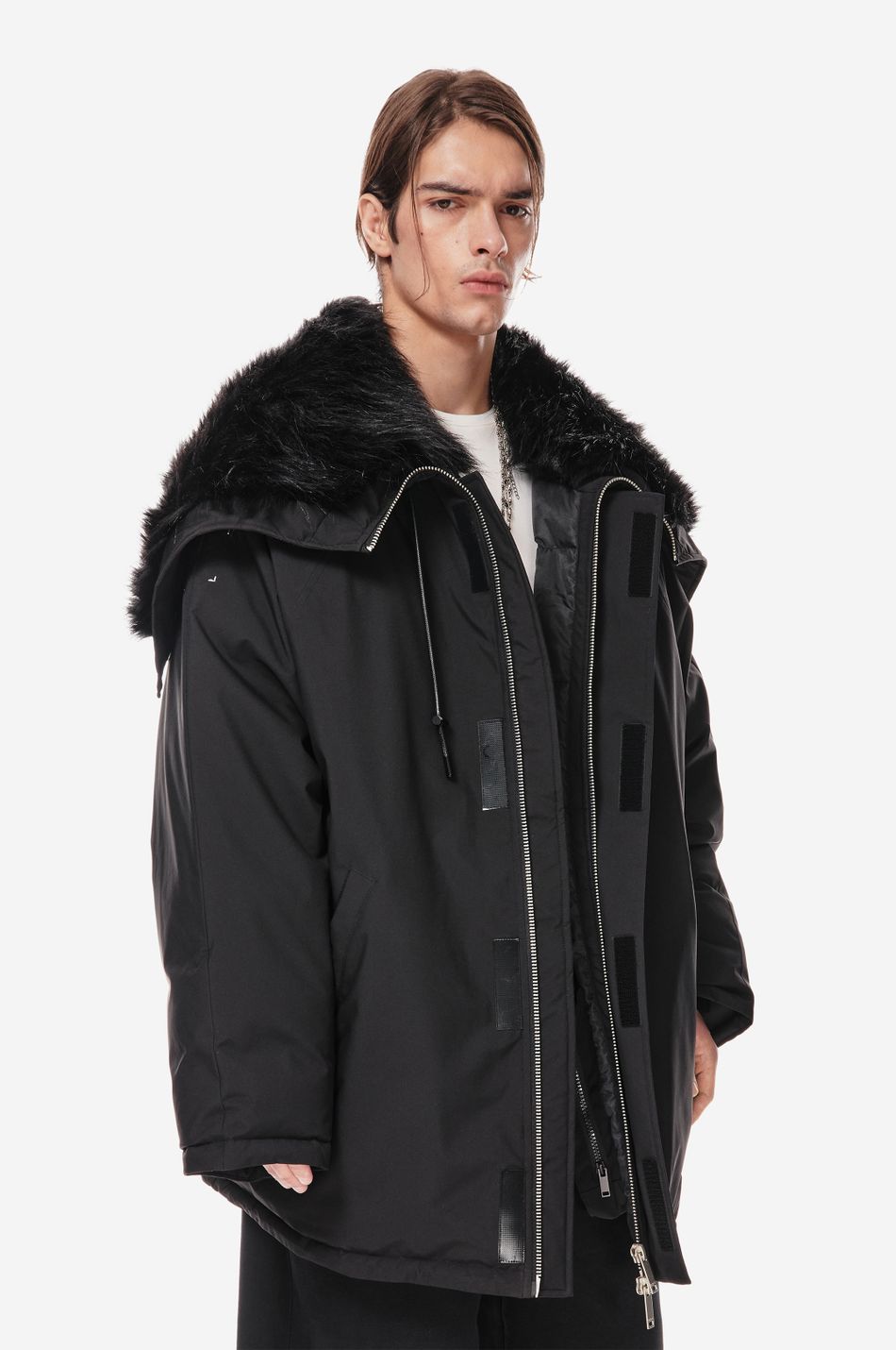 COLD LINE — утилитарная парка с архитектурным кроем. матовый полиэстер сочетается с пуховым утеплением и меховой подкладкой. система регулировок (капюшон, низ) и двухзамковая молния подчеркивают функциональность. днк бренда — металлические буквы post post scriptum на груди. форма, созданная для экстремальных -30°C.