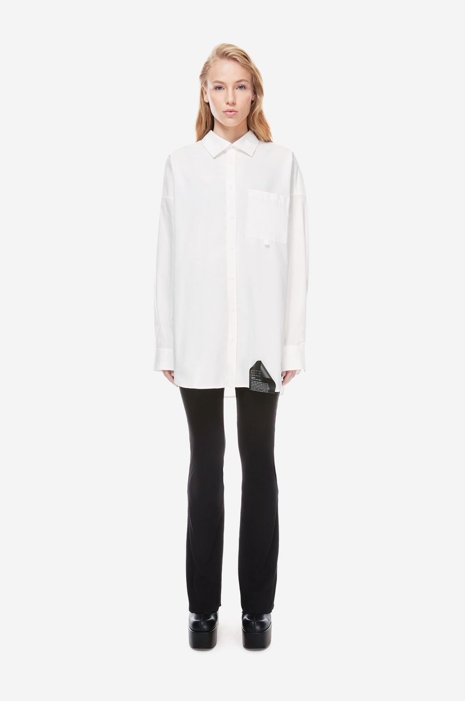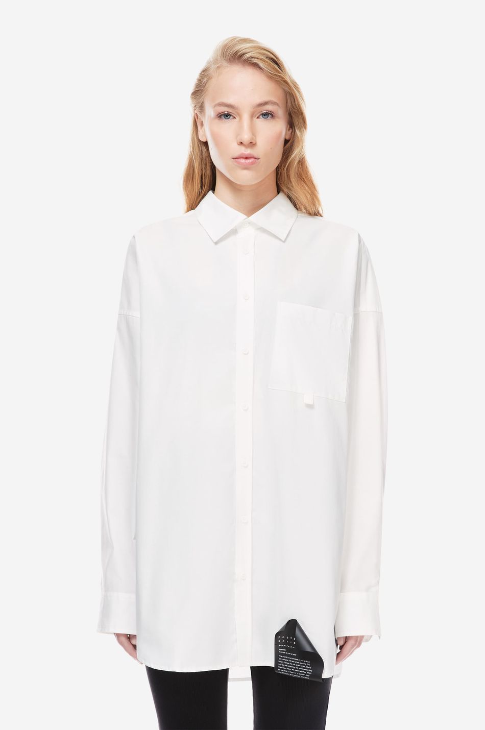 для изготовления оверсайз рубашки с круглым воротником использовали легкий тонкий хлопок. изделию придали объемный крой посредством опущения плечевого шва и дополнили её карманом на груди и застежками-пуговицами в тон