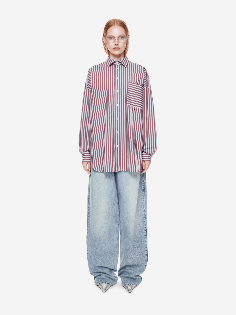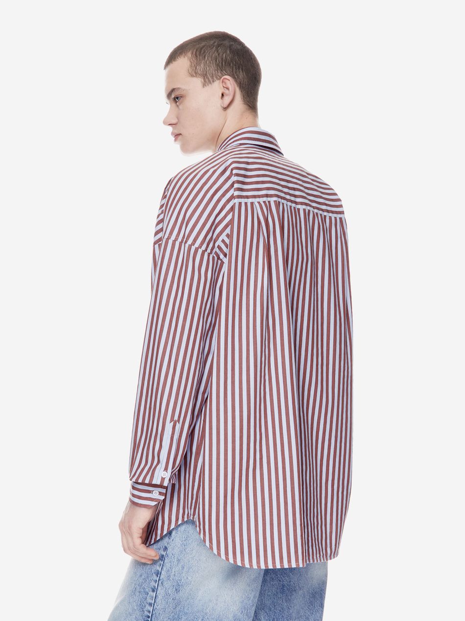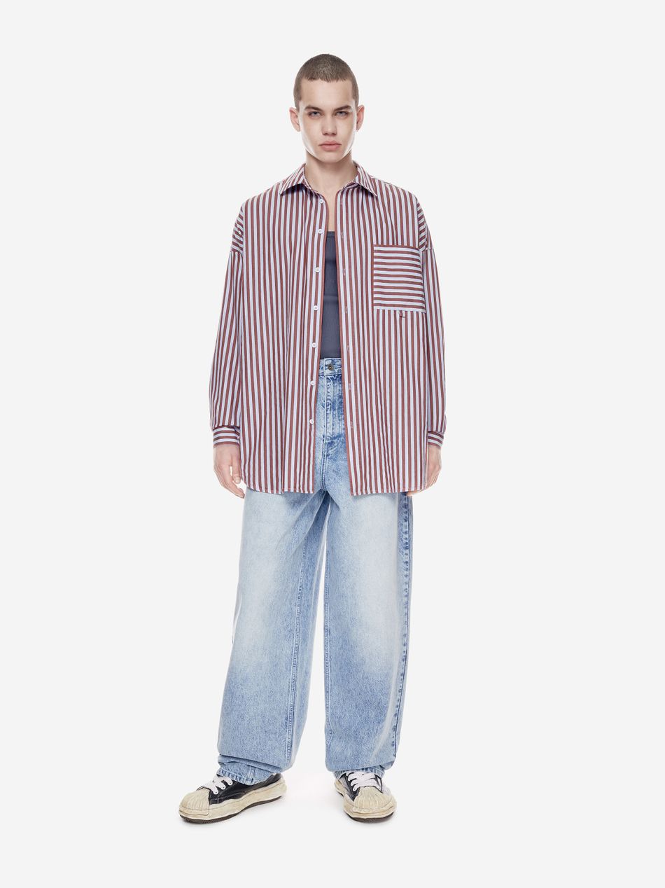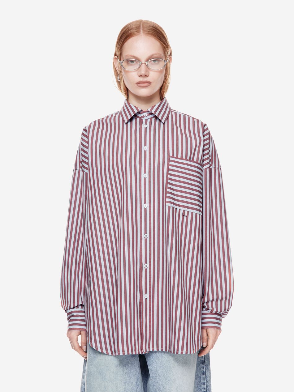 при пошиве оверсайз-рубашки в полоску использовался смесовый хлопок. непринужденный вид изделия поддержали утрированно свободным кроем со спущенной линией плеч. модель обладает удлиненным силуэтом, закрывающими ладони рукавами и застёжкой-пуговицами.