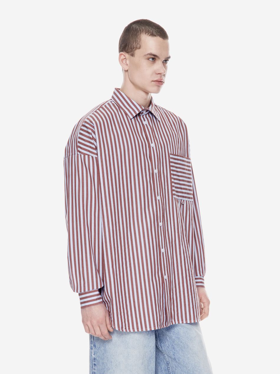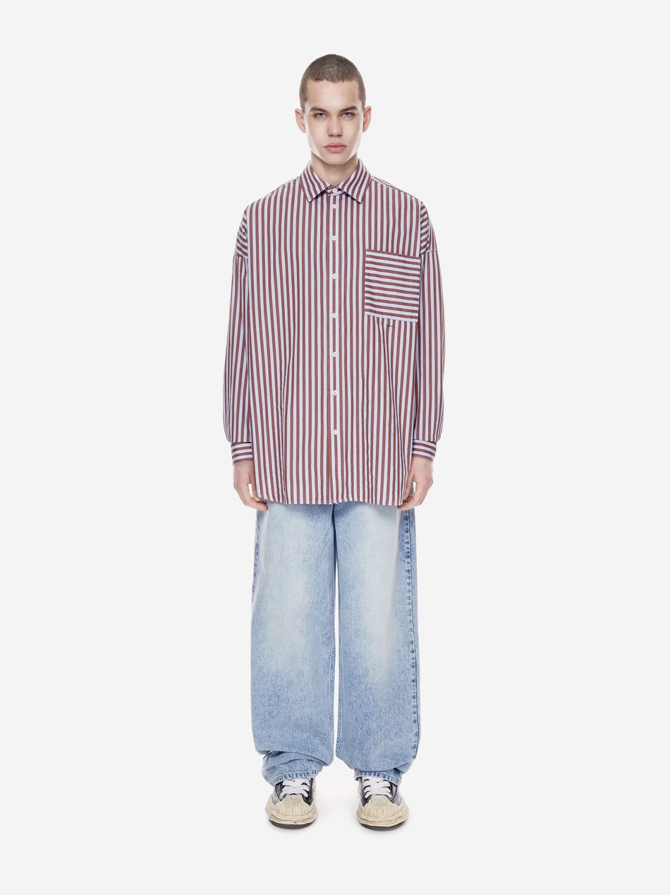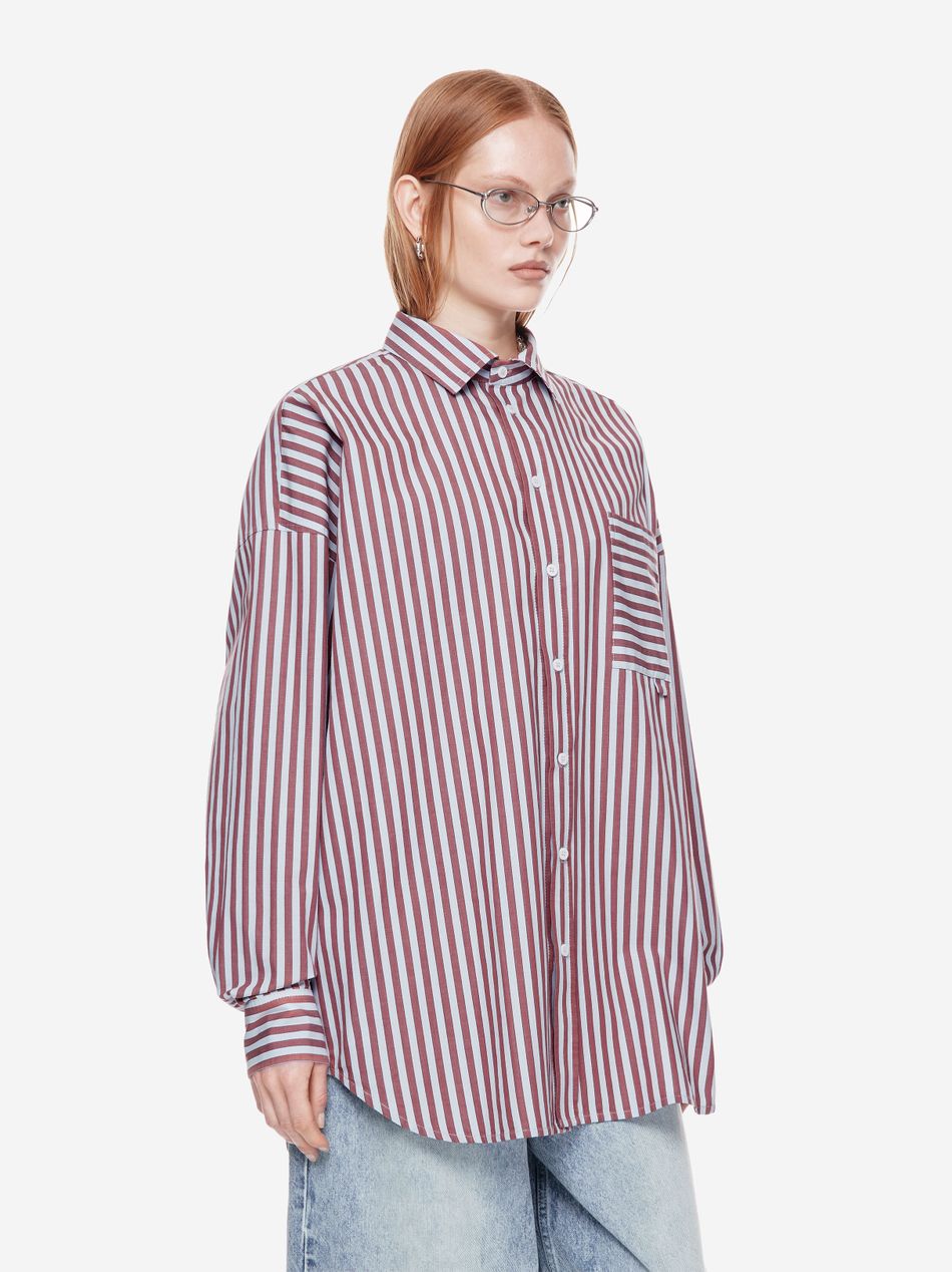 при пошиве оверсайз-рубашки в полоску использовался смесовый хлопок. непринужденный вид изделия поддержали утрированно свободным кроем со спущенной линией плеч. модель обладает удлиненным силуэтом, закрывающими ладони рукавами и застёжкой-пуговицами.