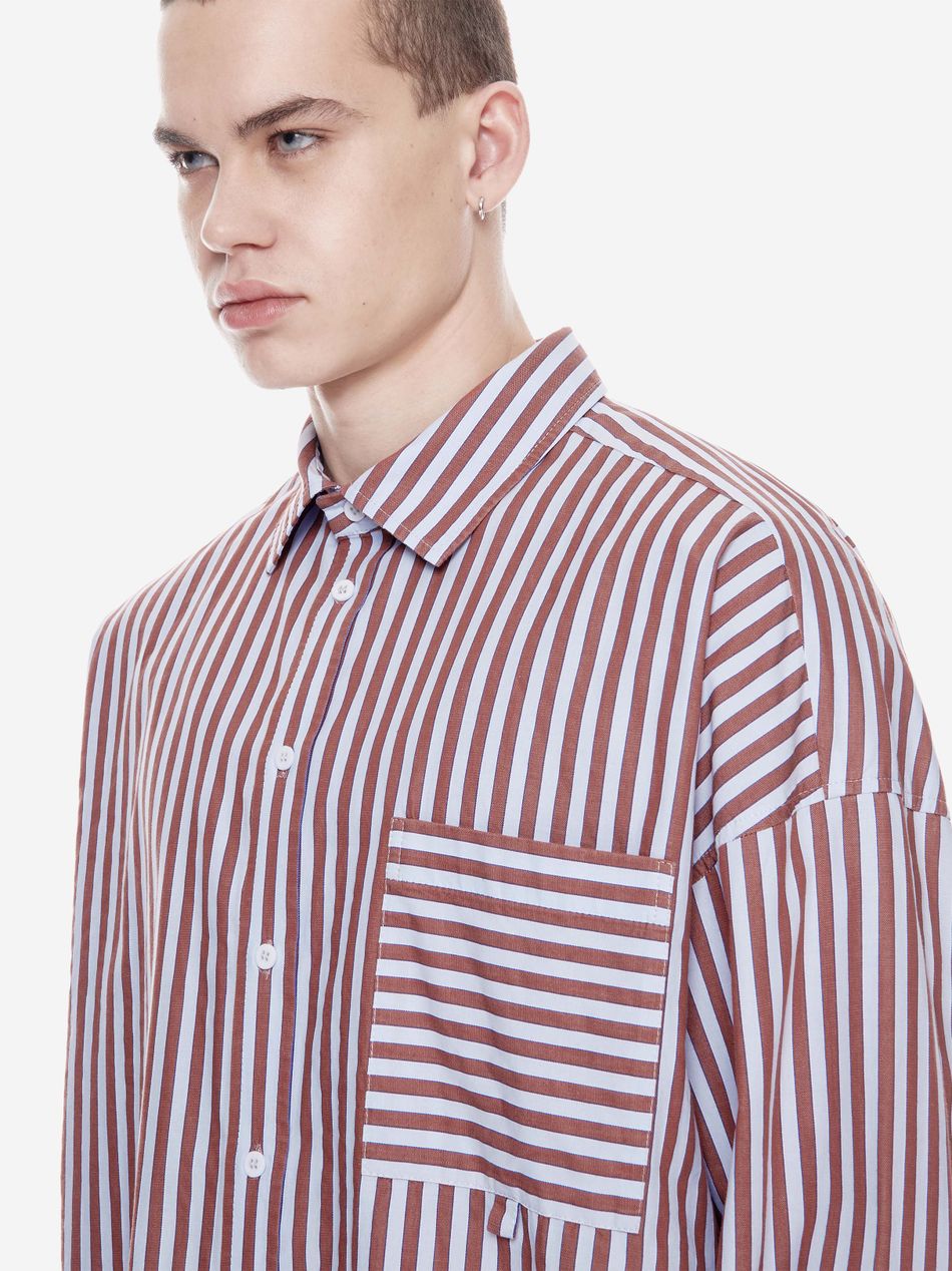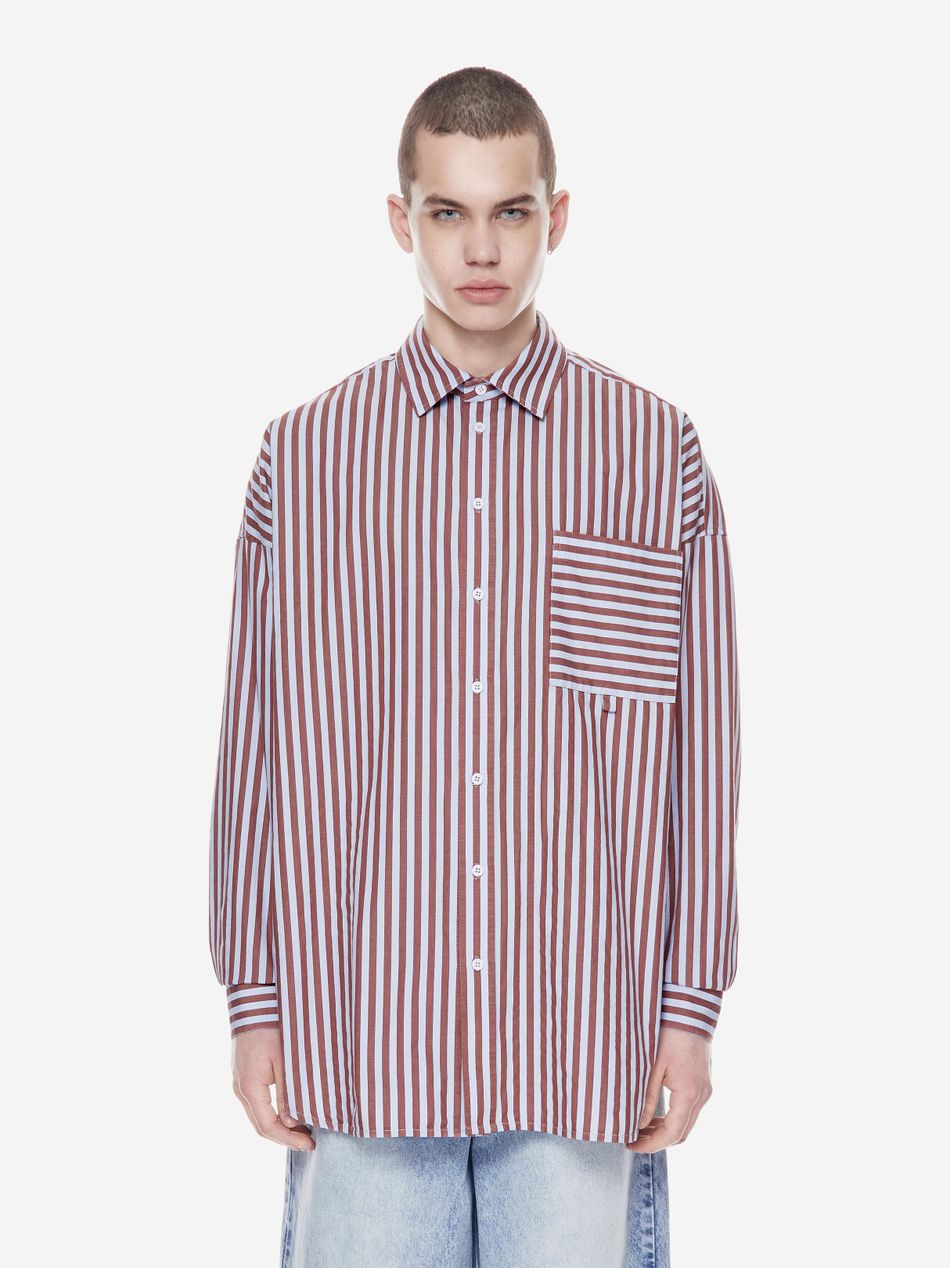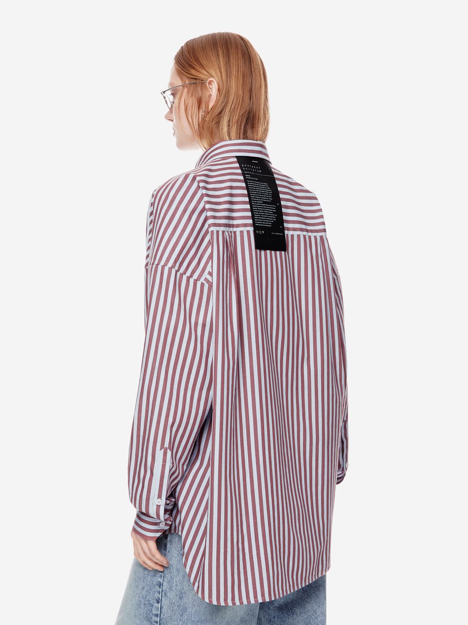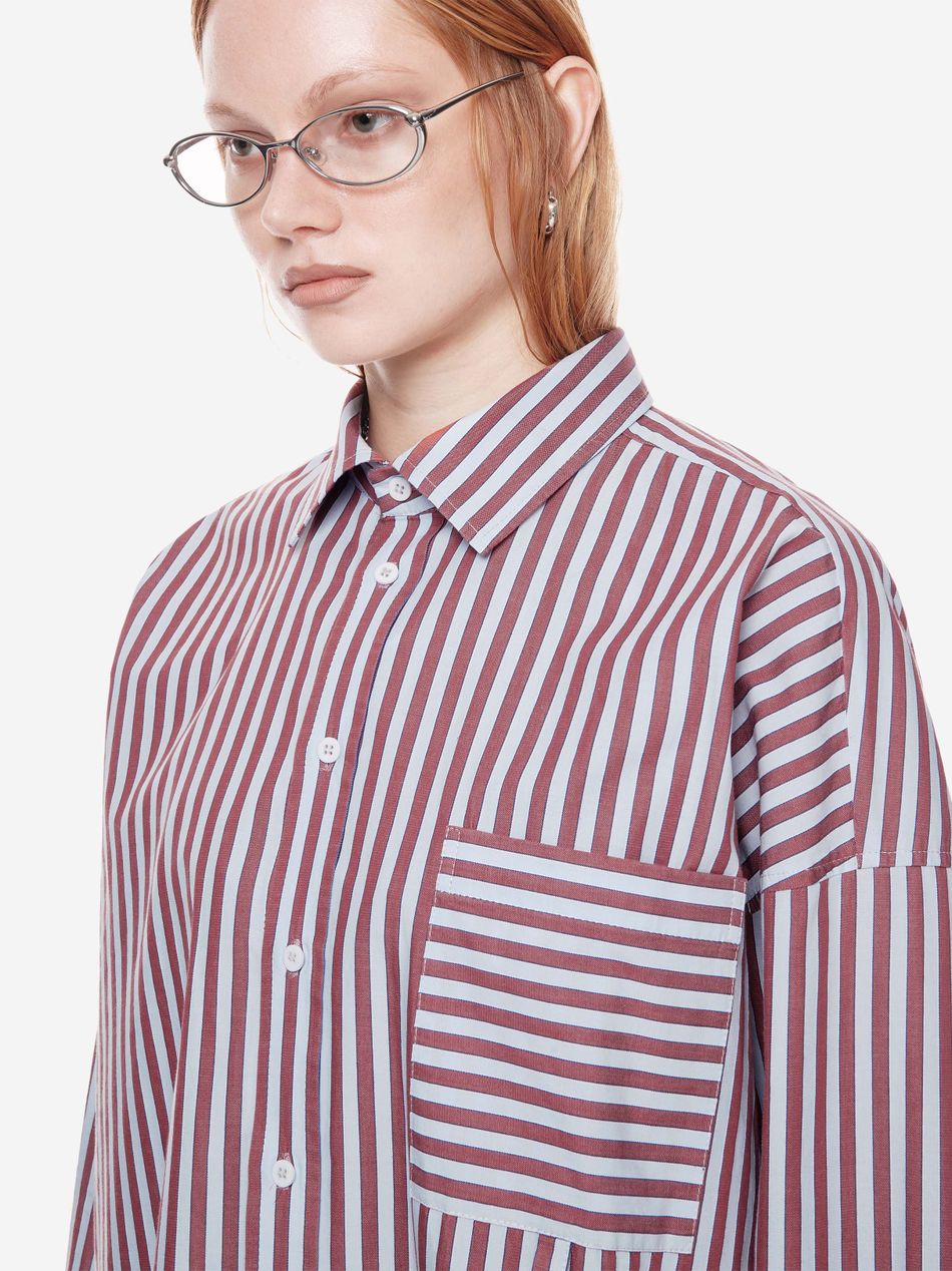 при пошиве оверсайз-рубашки в полоску использовался смесовый хлопок. непринужденный вид изделия поддержали утрированно свободным кроем со спущенной линией плеч. модель обладает удлиненным силуэтом, закрывающими ладони рукавами и застёжкой-пуговицами.