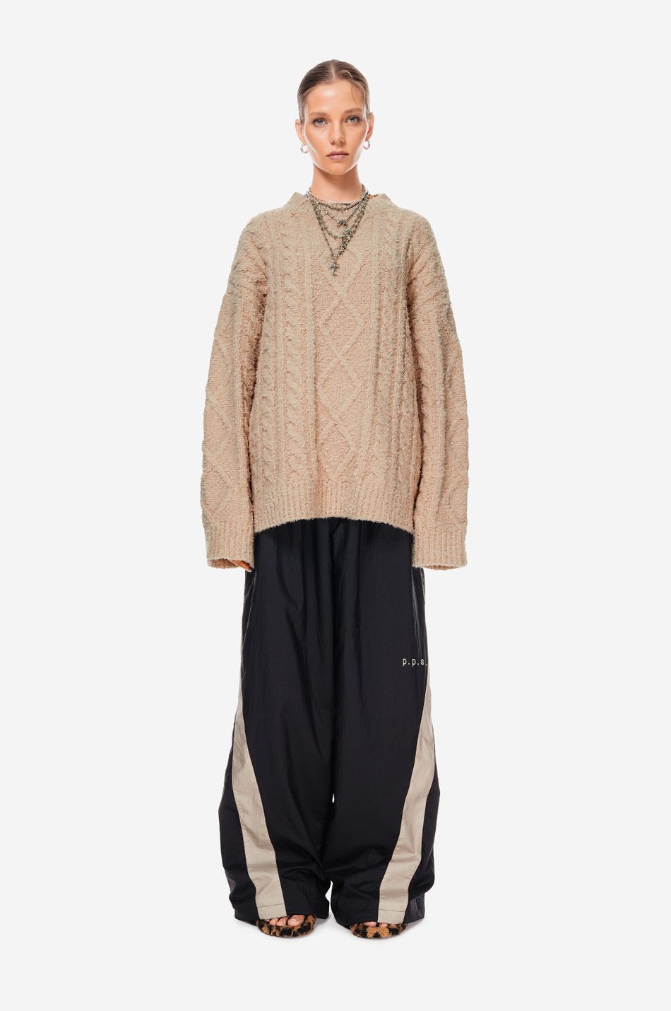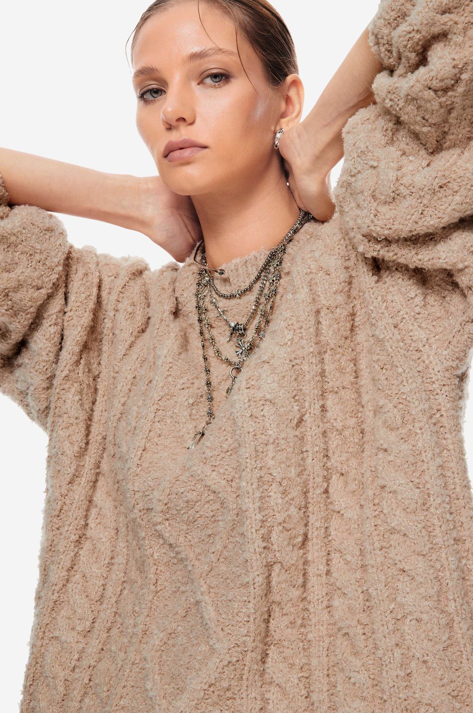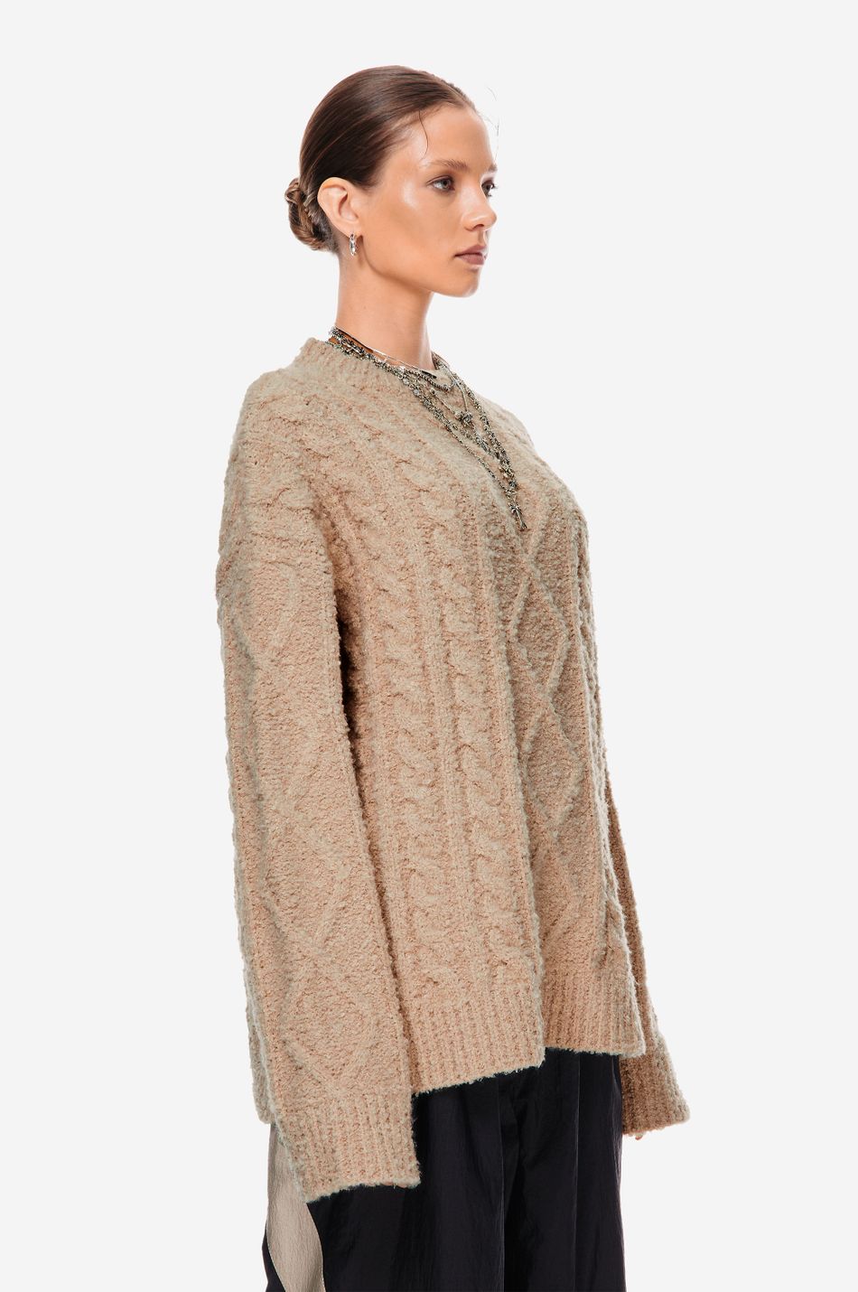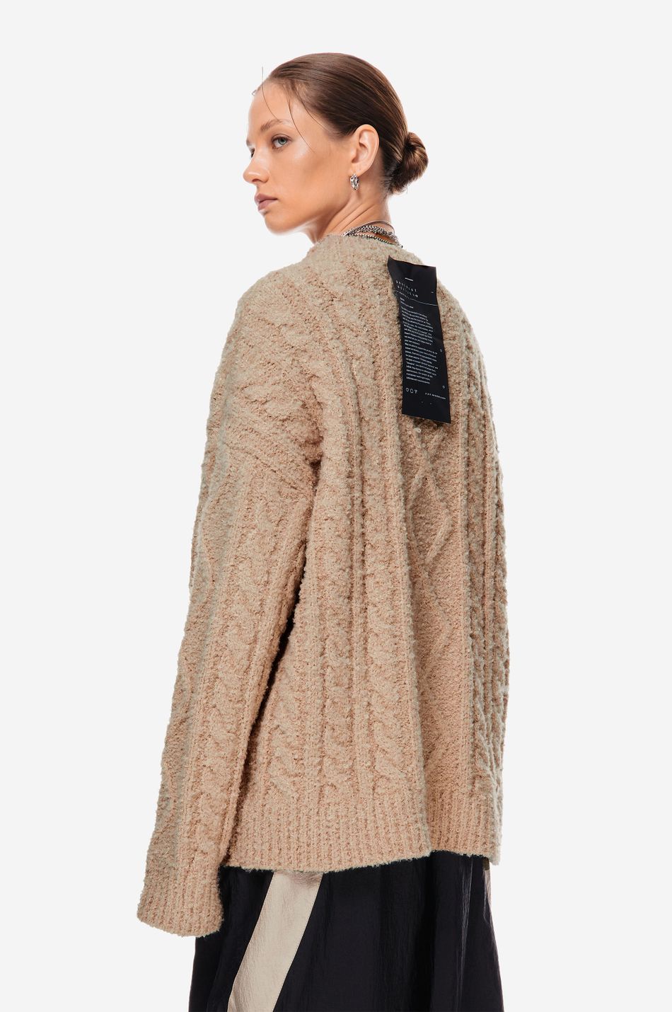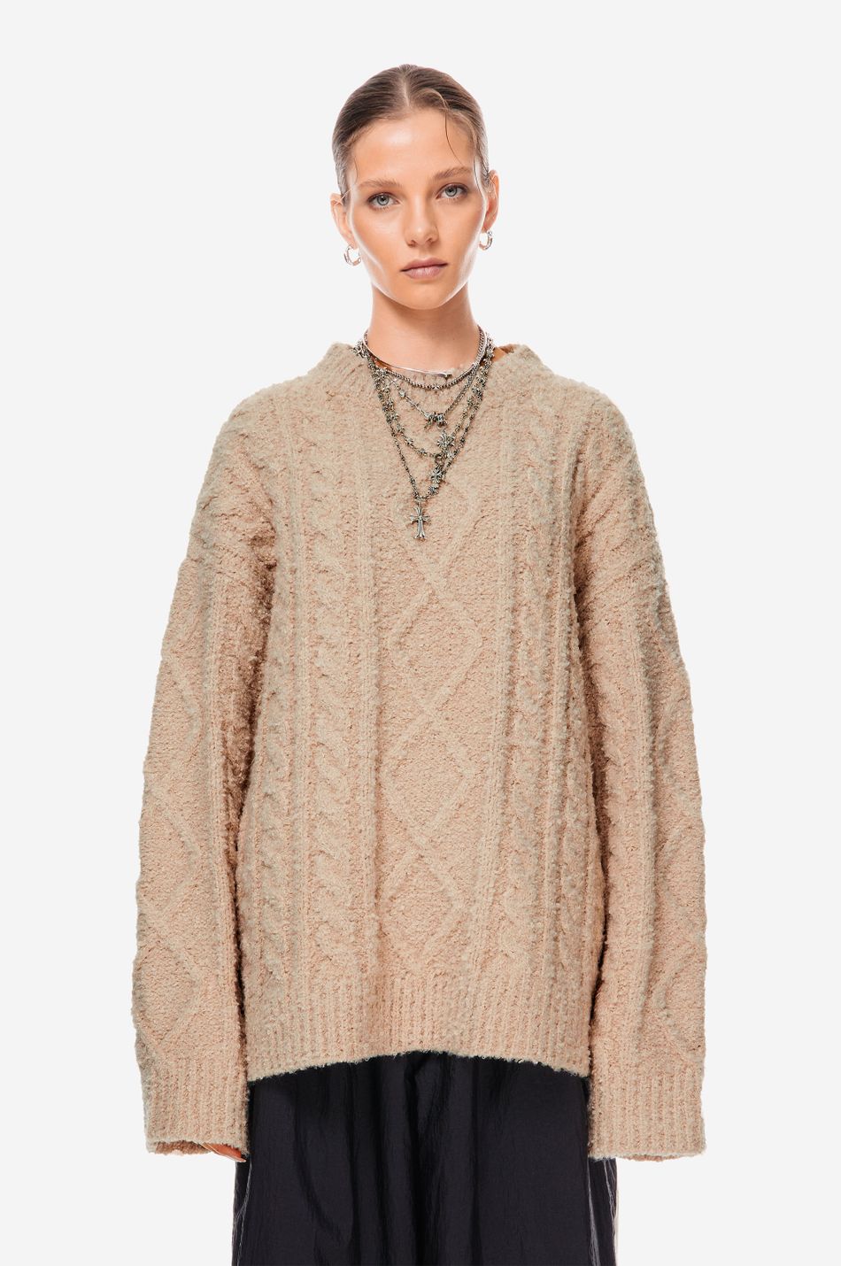 свитер оверсайз из буклированной пряжи выразительных оттенков. массивные «косы» в орнаменте создают гипертекстуру и навевают ностальгическое настроение. комфортный и теплый, он может быть как самостоятельным акцентом в образе, так и отлично сочетаться с верхними слоями.