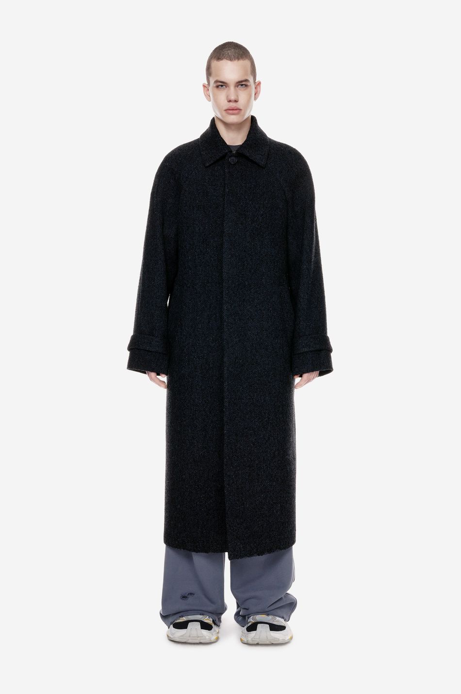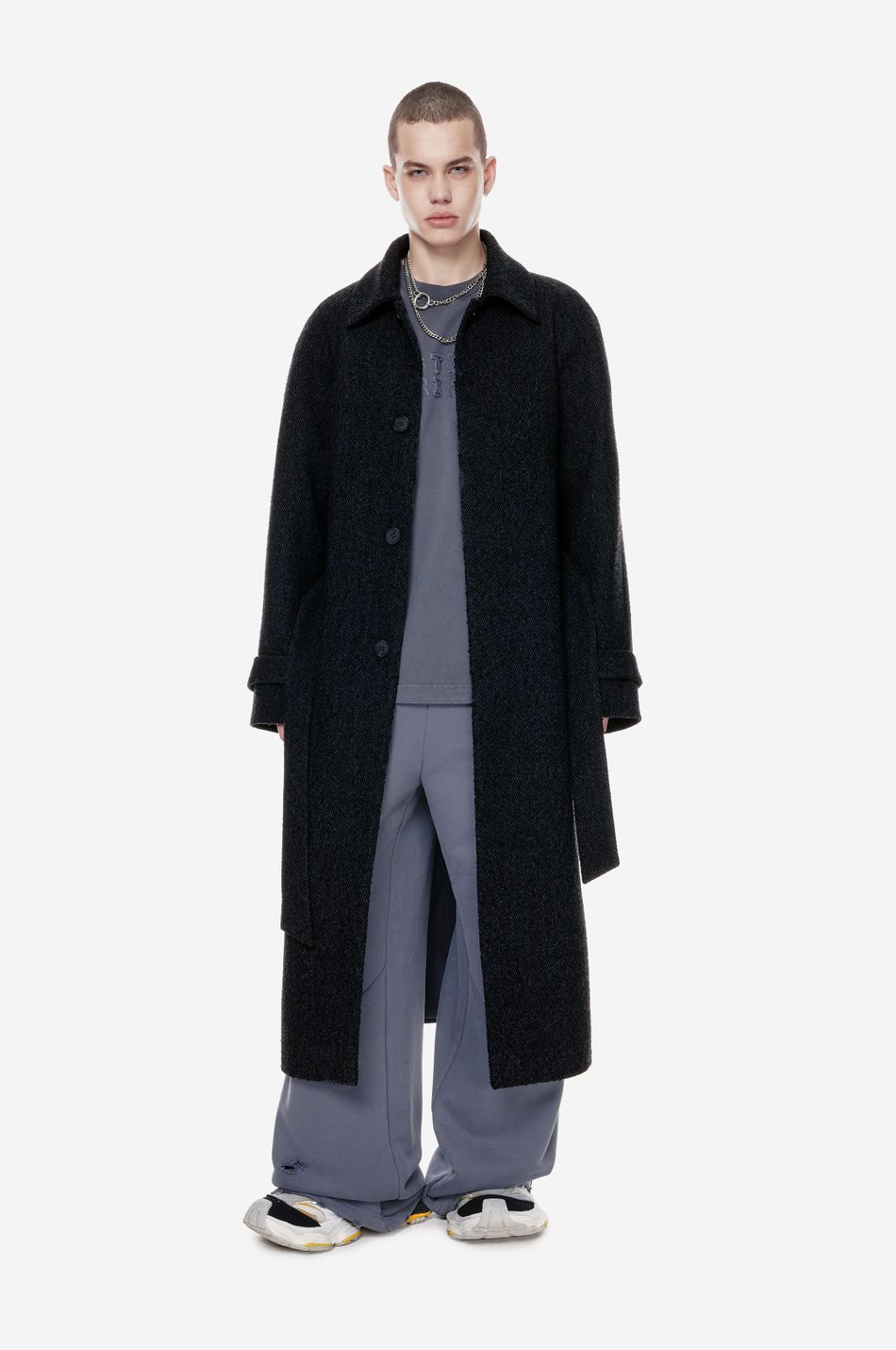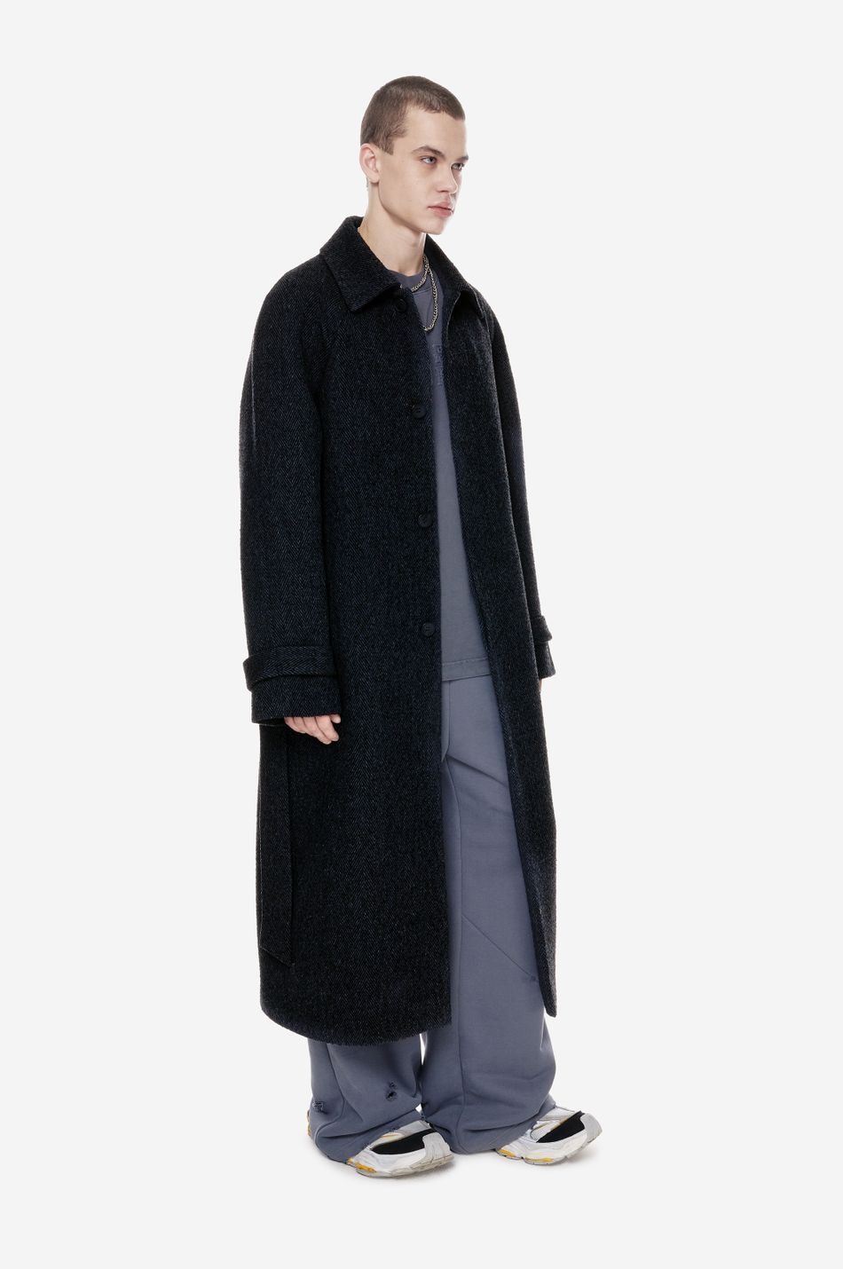 пальто из фактурной шерсти с графикой «ёлочка». тихая архитектура силуэта. удлинённая форма, мягкая линия плеча, пояс как инструмент трансформации. классика, лишённая привычной строгости.