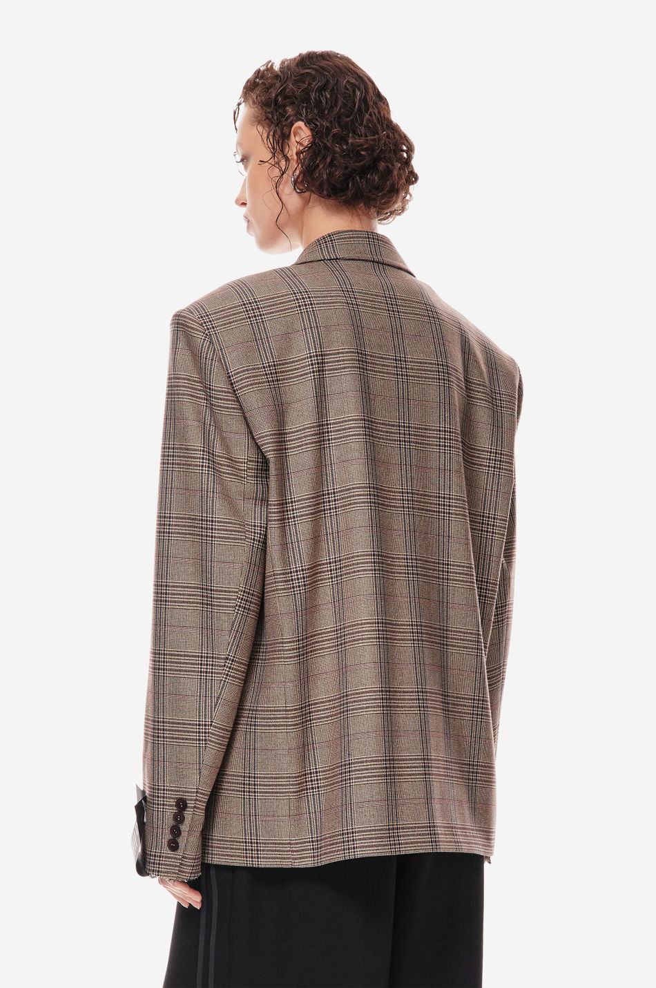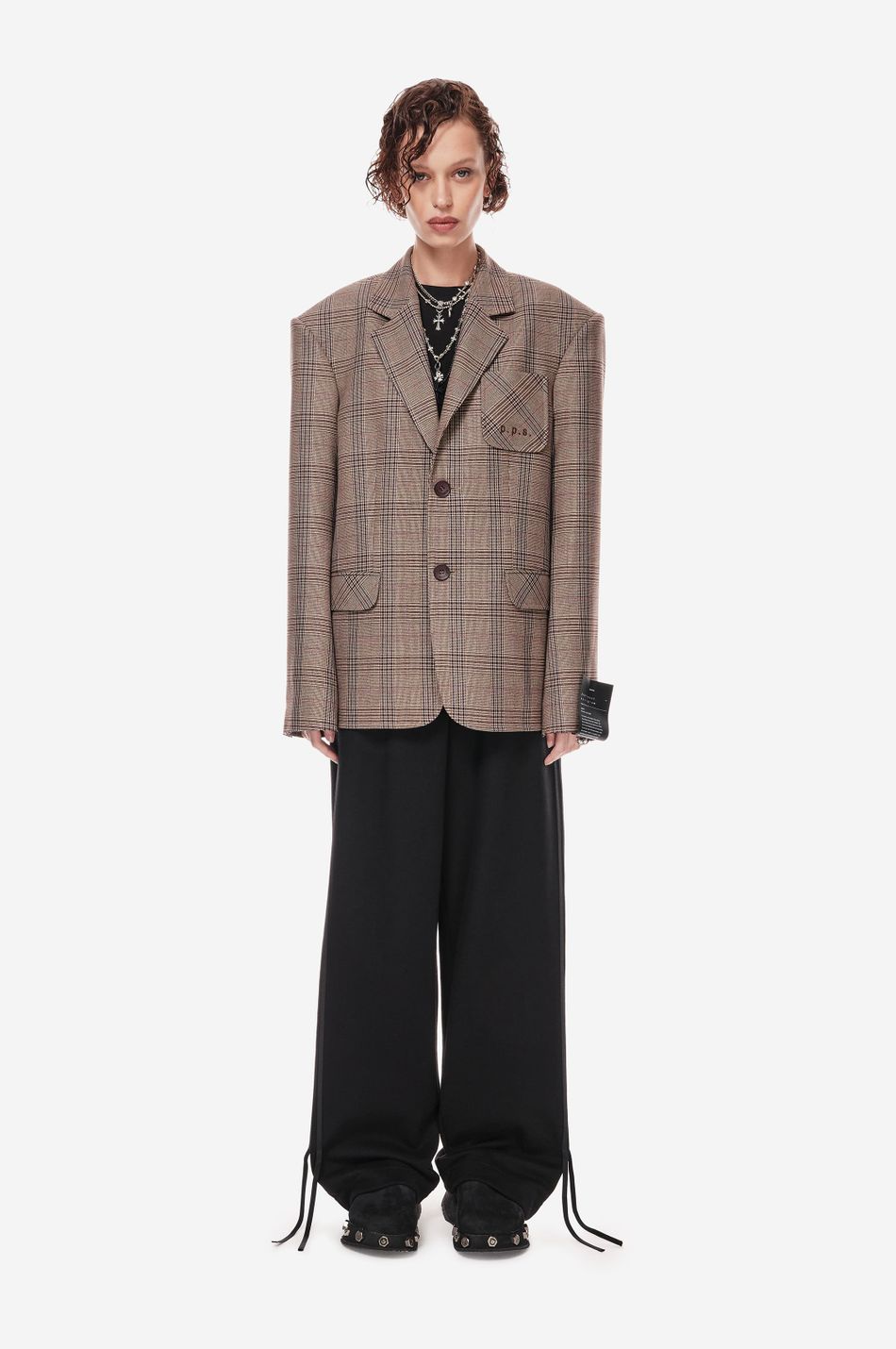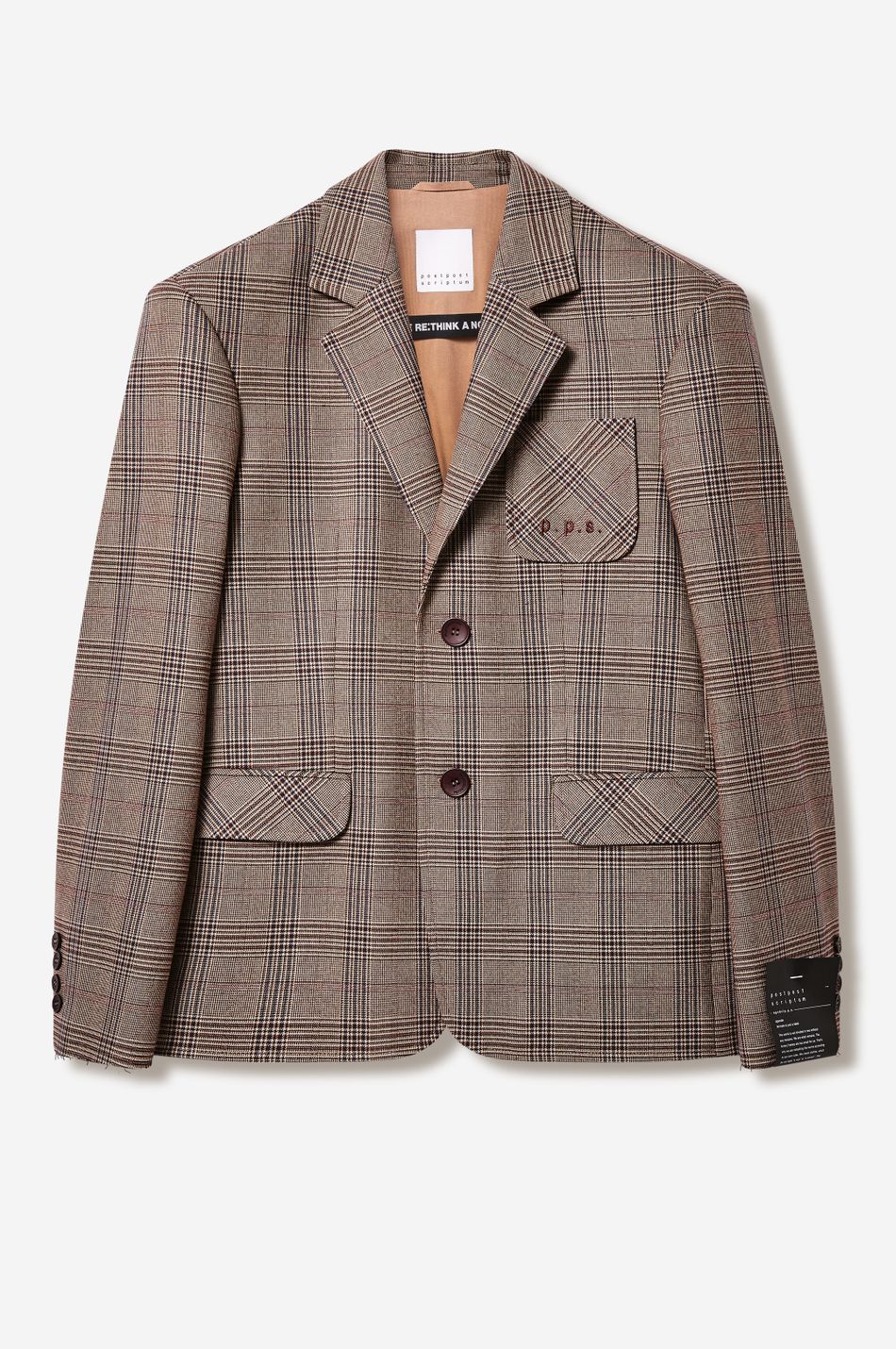 классический силуэт переосмыслен в эстетике post post scriptum. свободный крой, клетка «беж/вино» и смещённое плечо подчеркивают архитектуру формы. вышивка p.p.s., двубортная застежка и накладные карманы создают собранный, но расслабленный образ.
