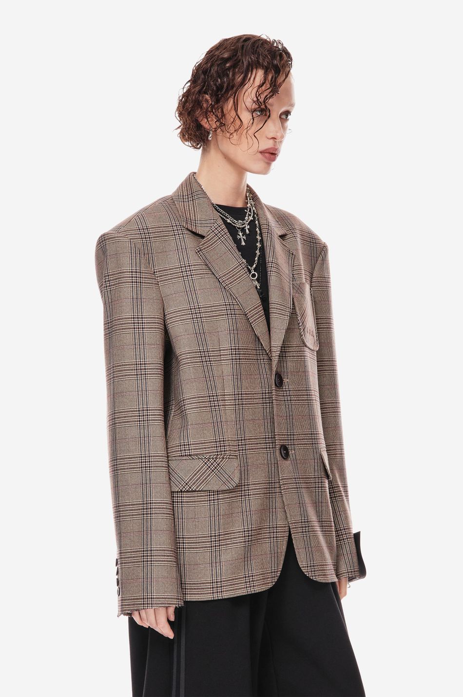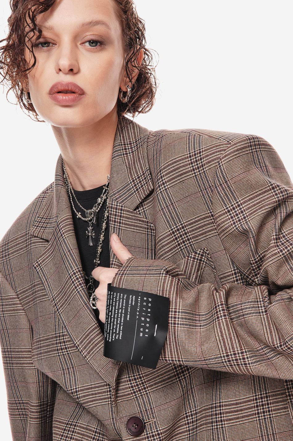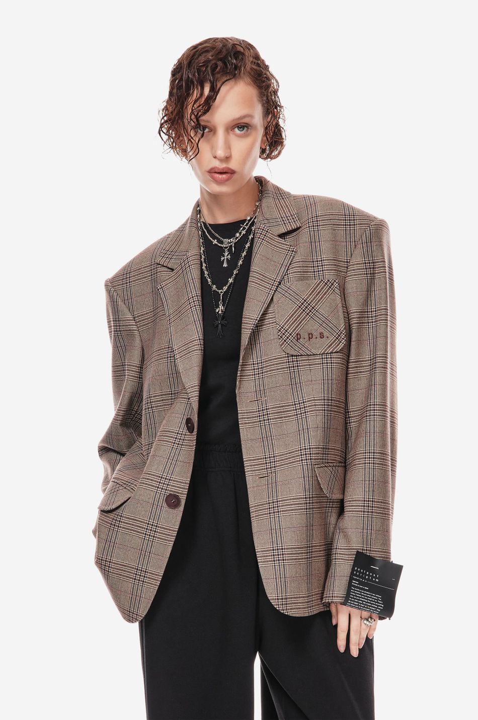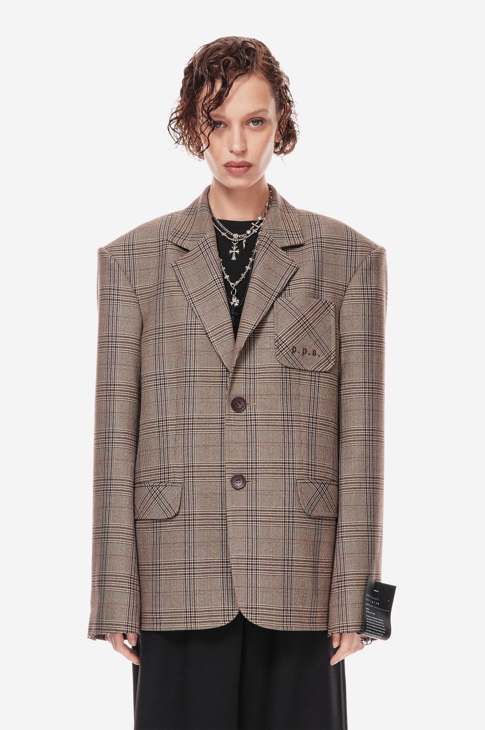 классический силуэт переосмыслен в эстетике post post scriptum. свободный крой, клетка «беж/вино» и смещённое плечо подчеркивают архитектуру формы. вышивка p.p.s., двубортная застежка и накладные карманы создают собранный, но расслабленный образ.