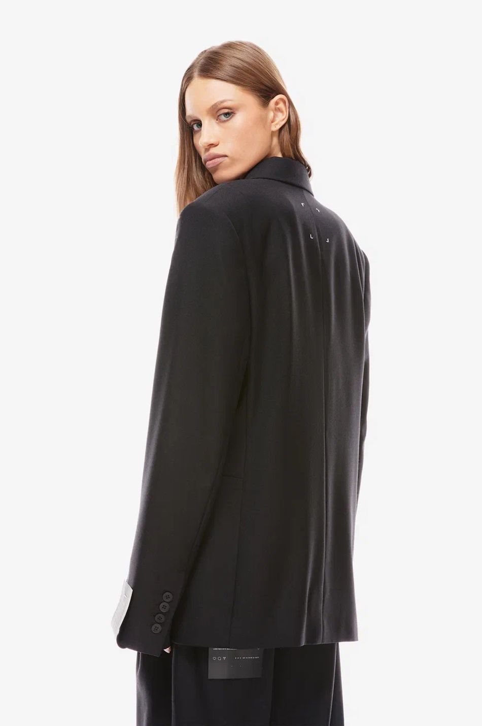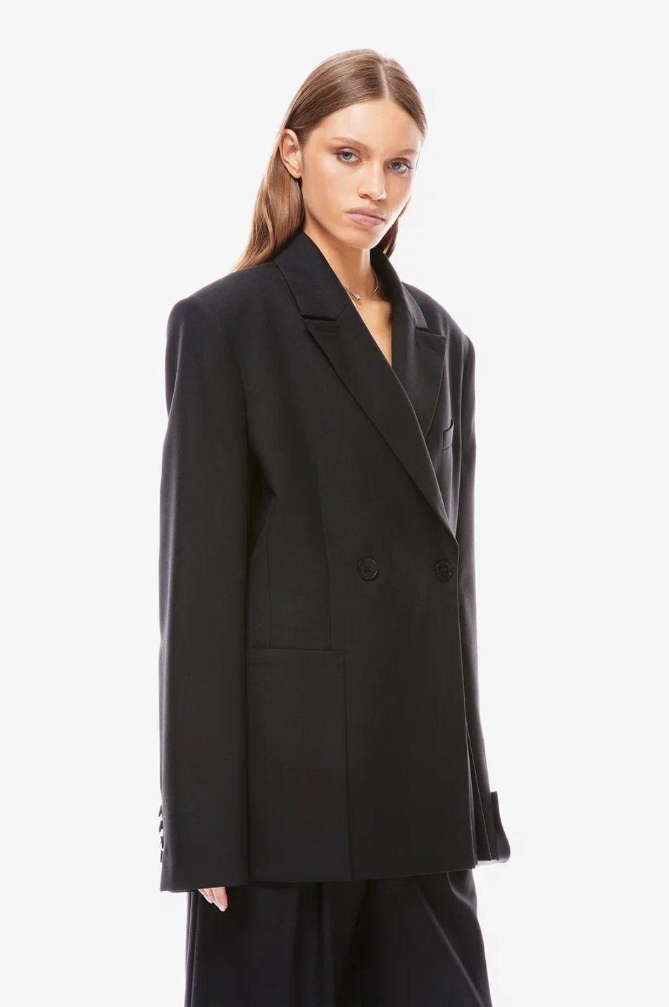 двубортный пиджак приталенного кроя выполнен из плотной костюмной ткани. модель с остроконечными лацканами, прорезным карманом на груди и большими накладными карманами спереди на бедрах. манжеты с четырьмя пуговицами.