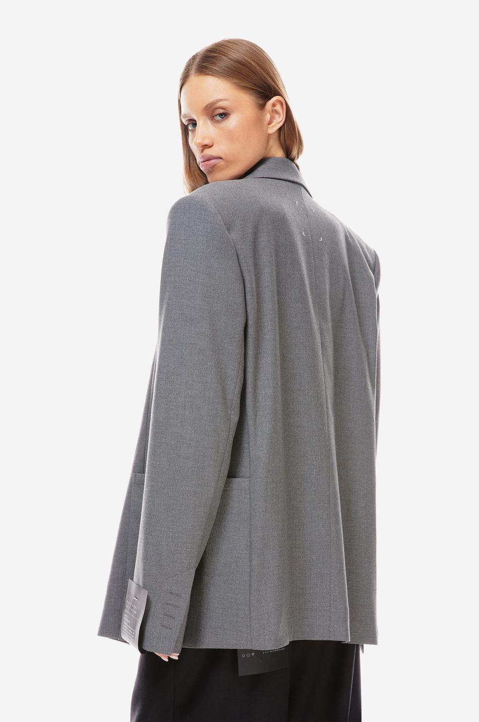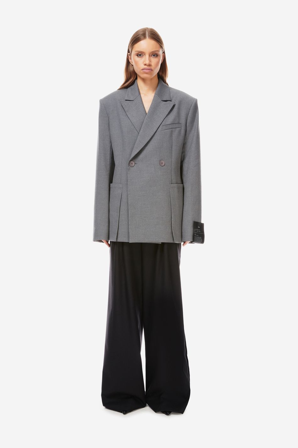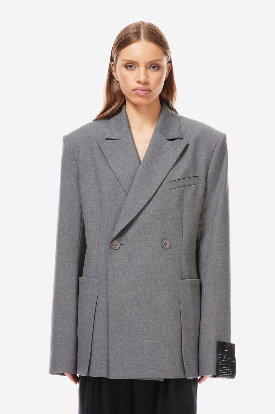 двубортный пиджак приталенного кроя выполнен из плотной костюмной ткани. модель с остроконечными лацканами, прорезным карманом на груди и большими накладными карманами спереди на бедрах. манжеты с четырьмя пуговицами.