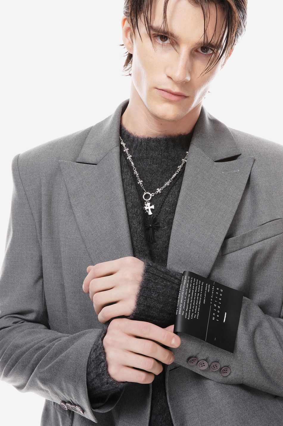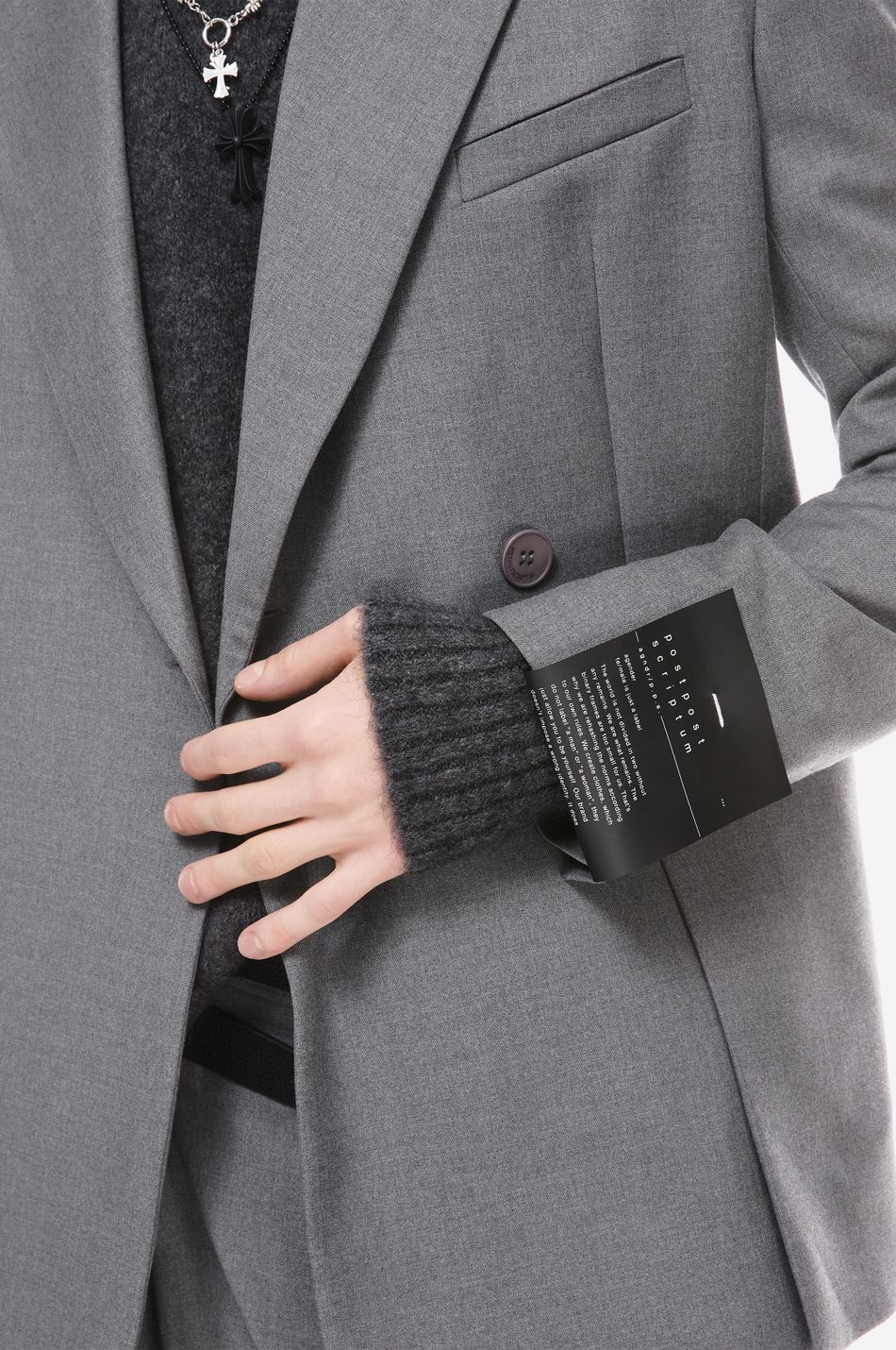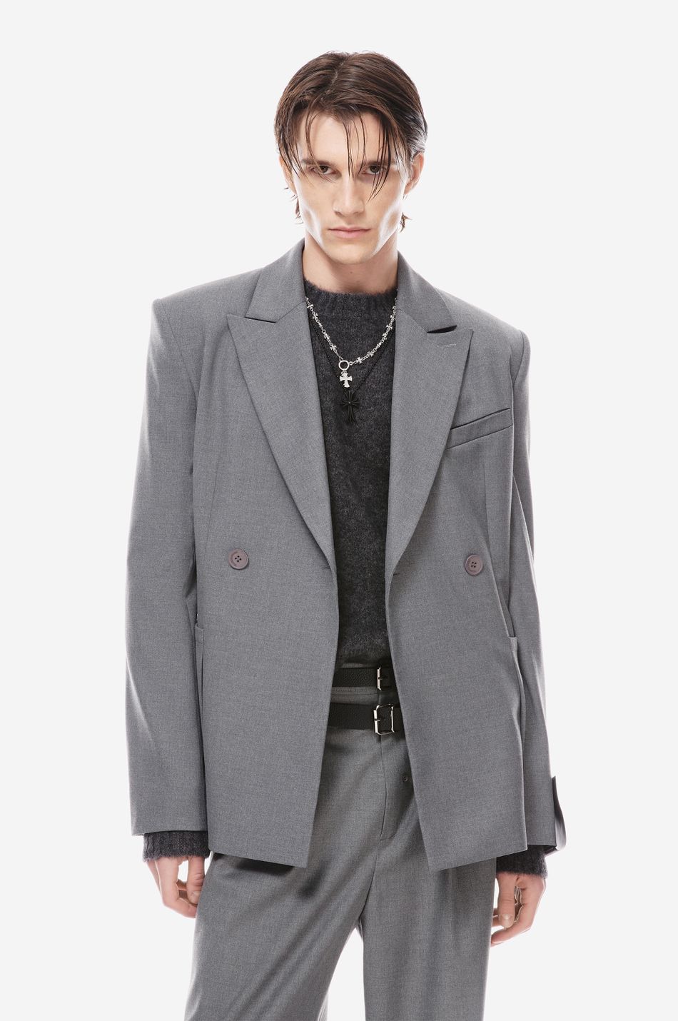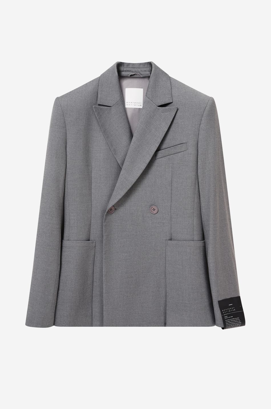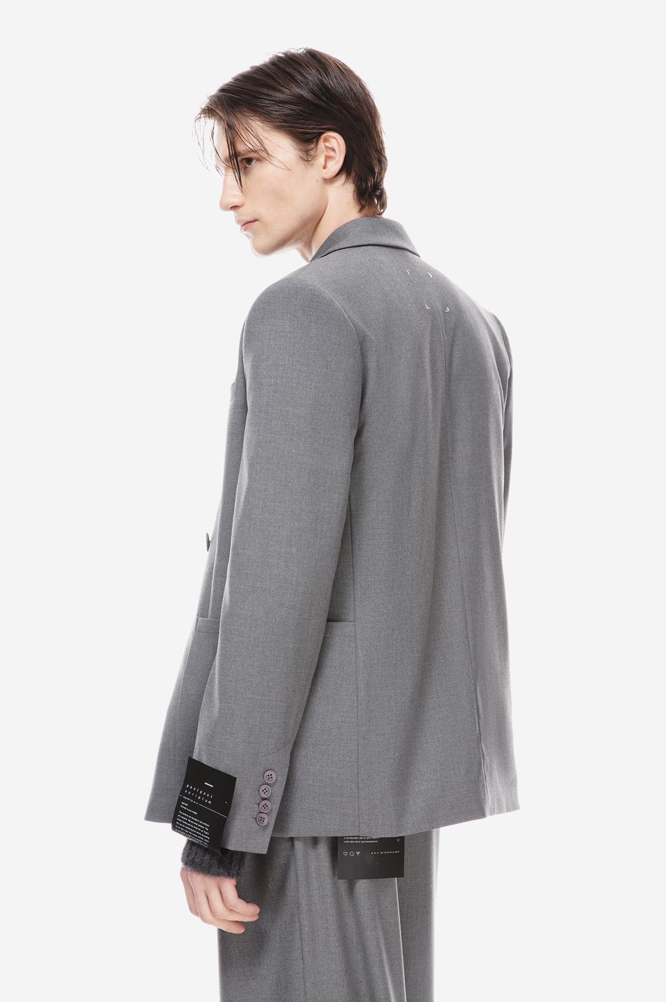 двубортный пиджак приталенного кроя выполнен из плотной костюмной ткани. модель с остроконечными лацканами, прорезным карманом на груди и большими накладными карманами спереди на бедрах. манжеты с четырьмя пуговицами.