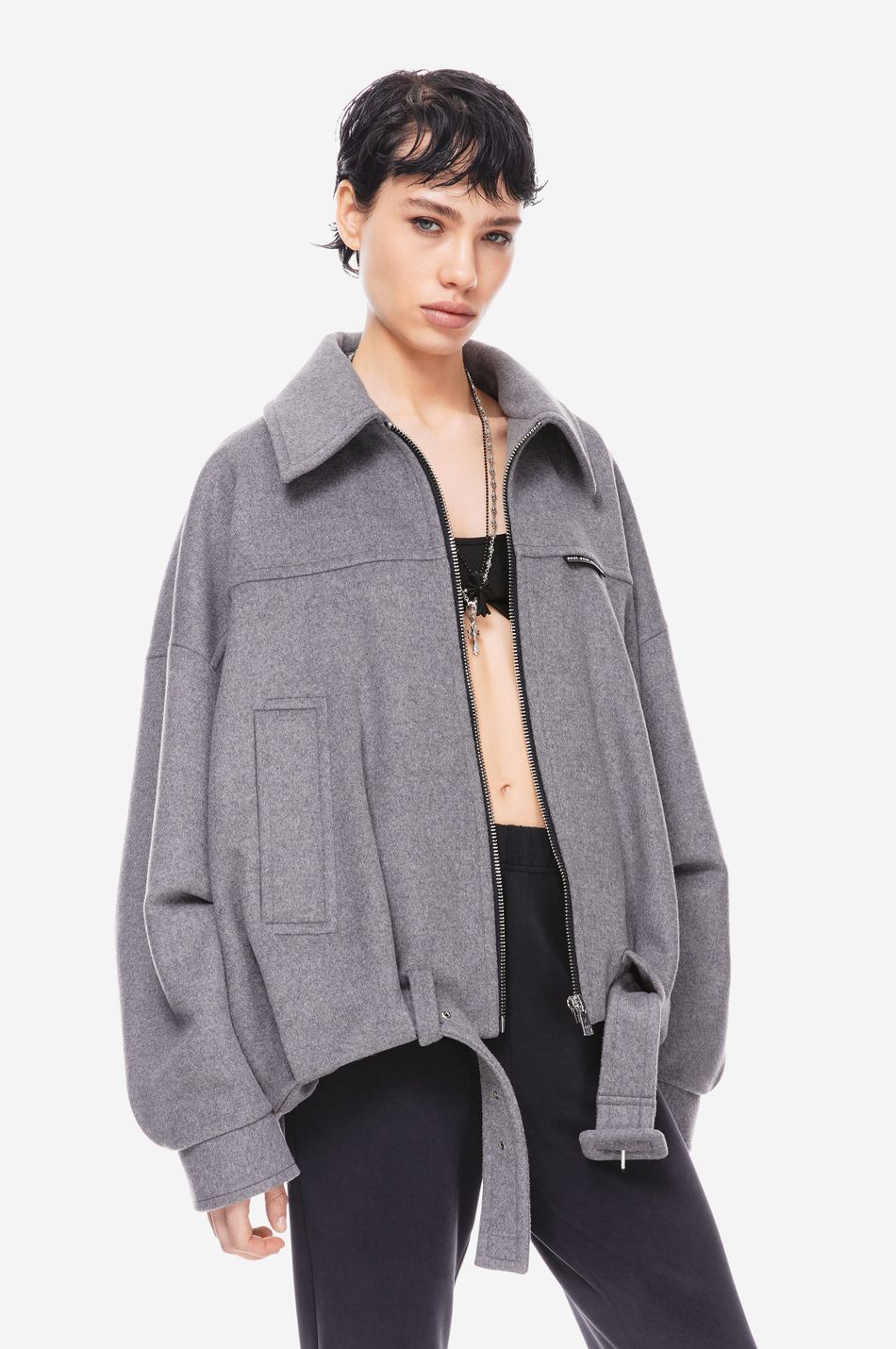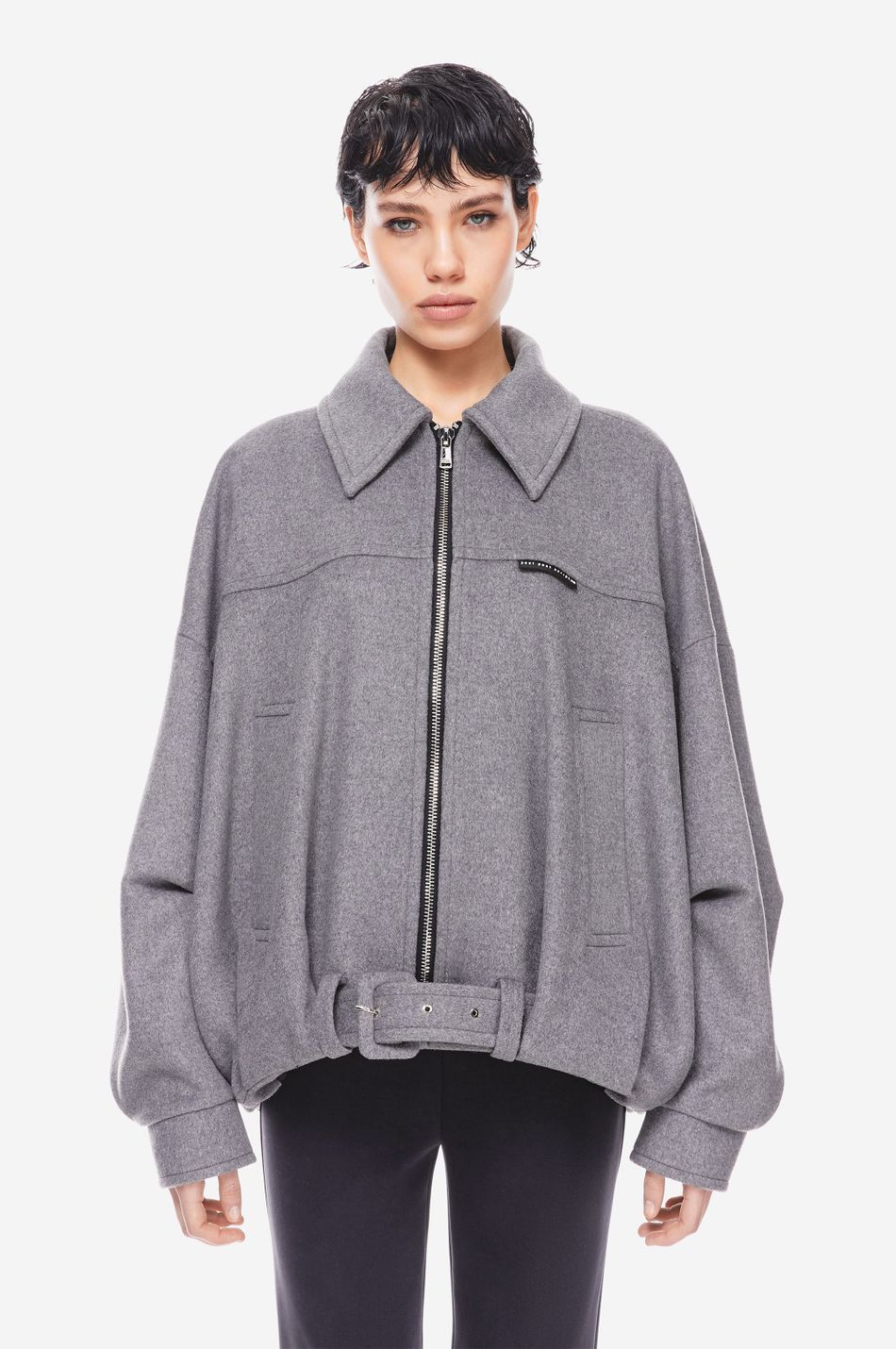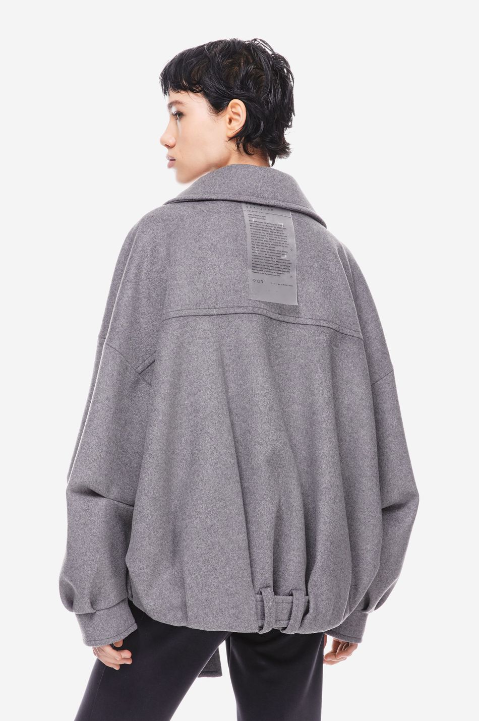 Оверсайз шерстяной бомбер из плотной смесовой шерсти с четкими линиями и объемным силуэтом. Молния и регулируемый пояс создают структуру, спущенные плечи и удлиненные рукава — расслабленность. Минималистичный дизайн с фирменным патчем делает его универсальной основой для стильных многослойных образов.