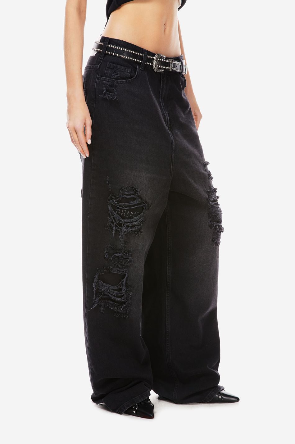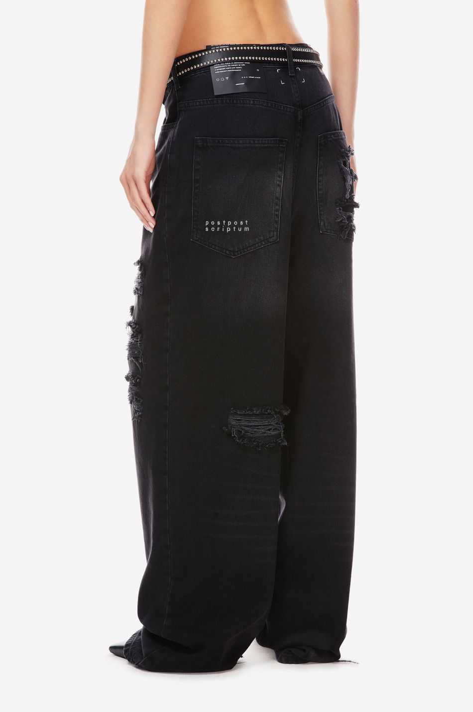 широкие джинсы кроя oversized с эффектом винтажной потёртости. модель с крупными разрезами на штанинах и заниженной посадкой изготовлена из мягкого хлопка. контрастная подкладка под разрезами с логотипом бренда, пять карманов, контрастная вышивка на заднем кармане. застегиваются на молнию и пуговицу.