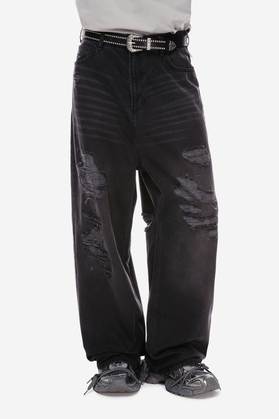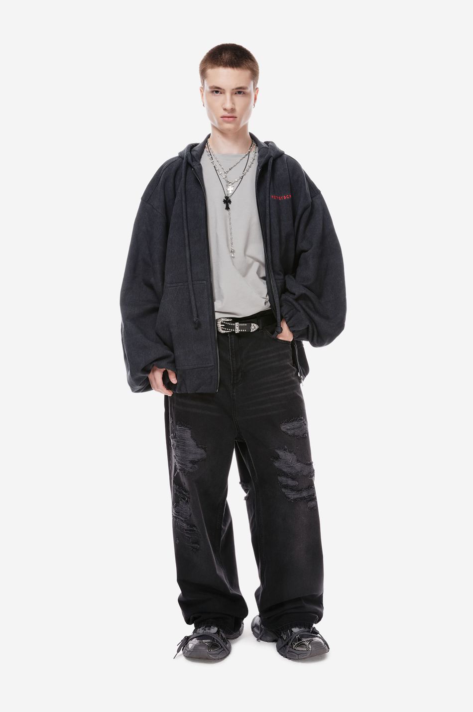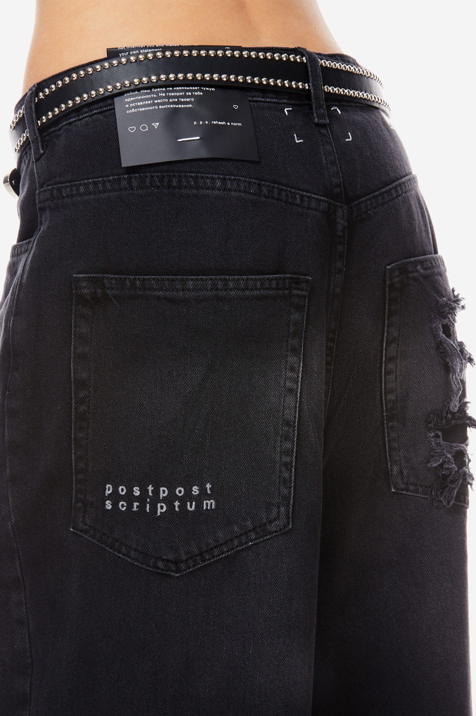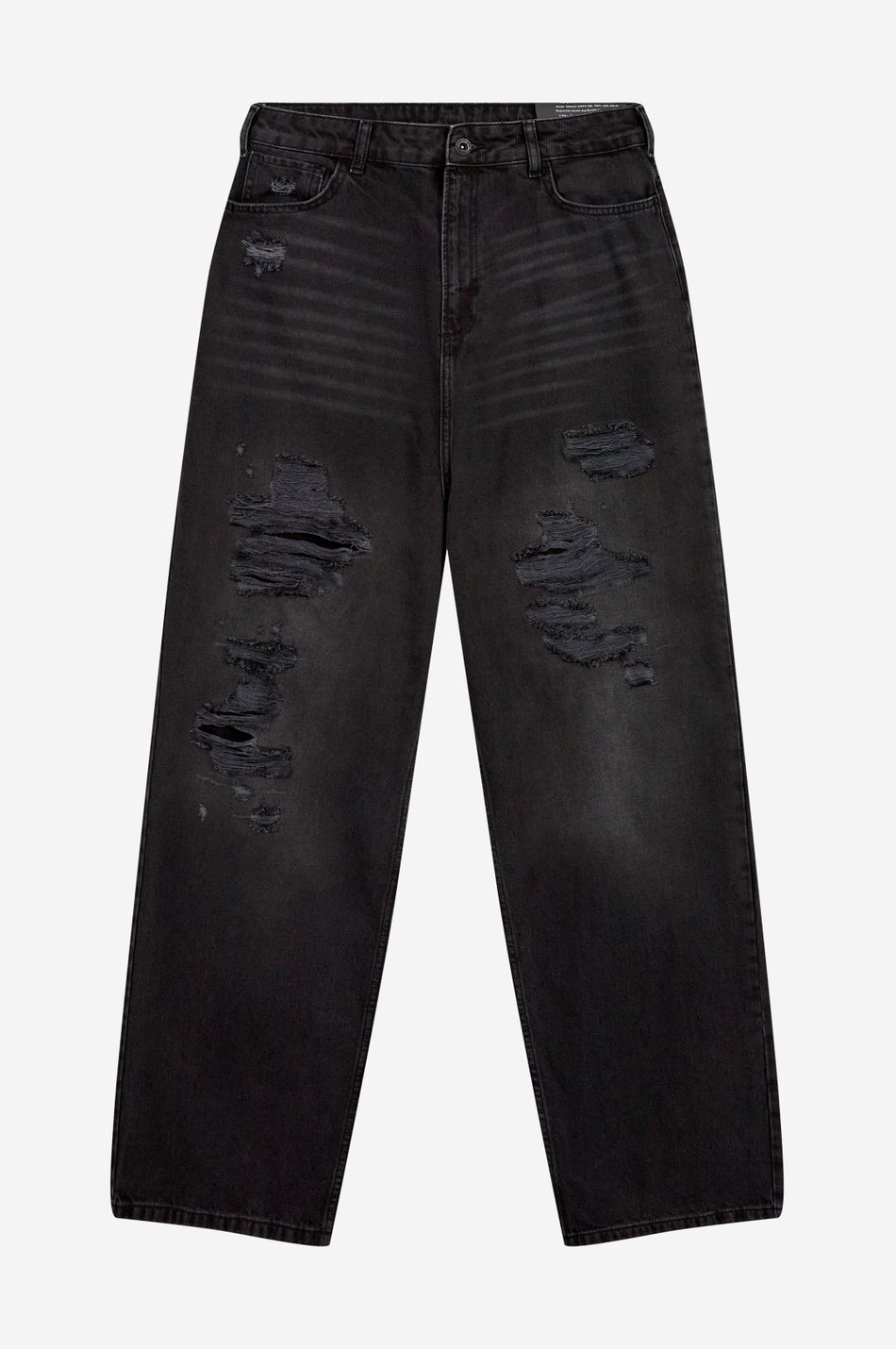 широкие джинсы кроя oversized с эффектом винтажной потёртости. модель с крупными разрезами на штанинах и заниженной посадкой изготовлена из мягкого хлопка. контрастная подкладка под разрезами с логотипом бренда, пять карманов, контрастная вышивка на заднем кармане. застегиваются на молнию и пуговицу.