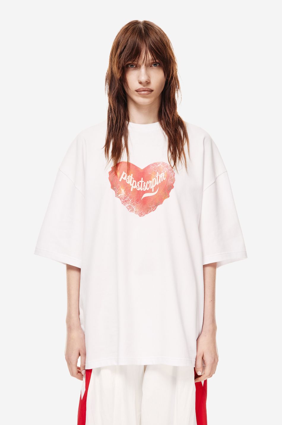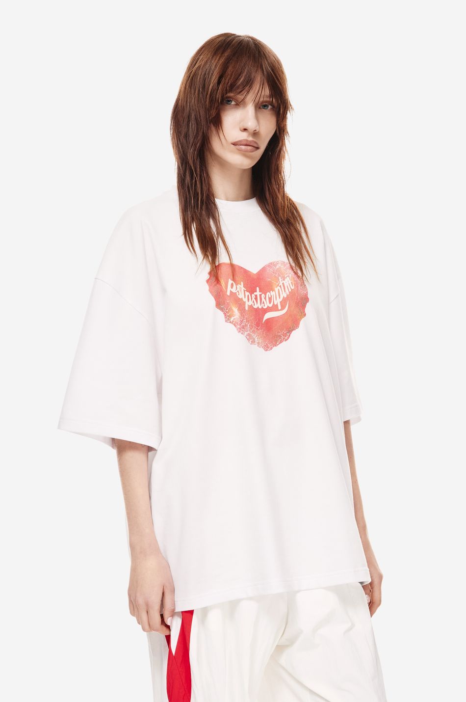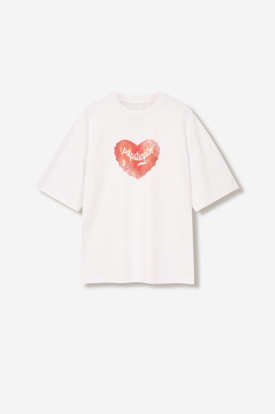 Оверсайз футболка с пич-эффектом и принтом. Модель, продолжающая концептуальный streetwear-код post post scriptum.