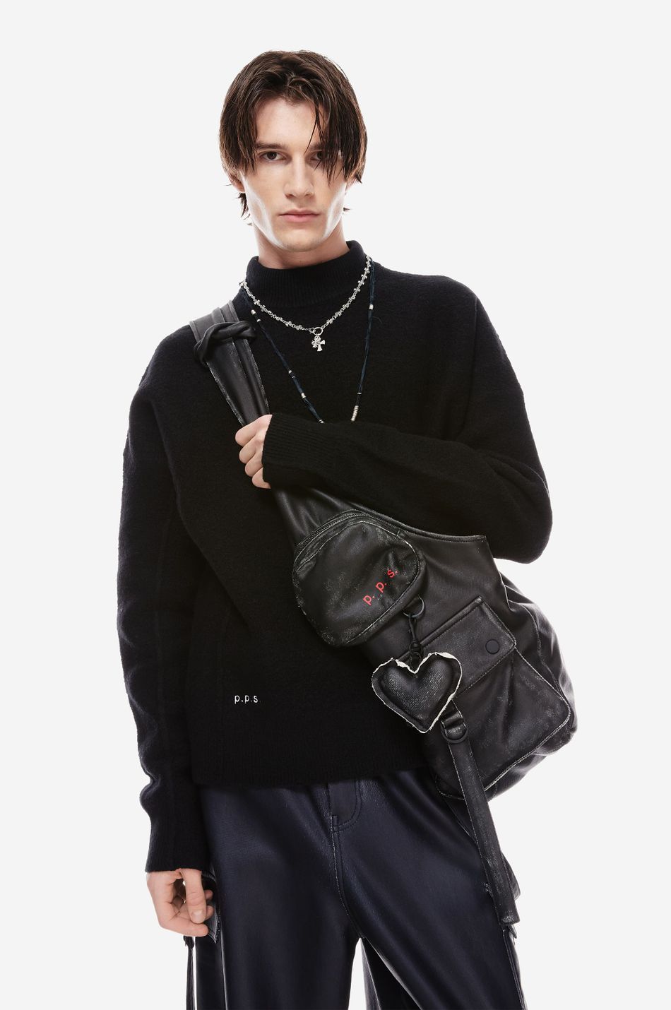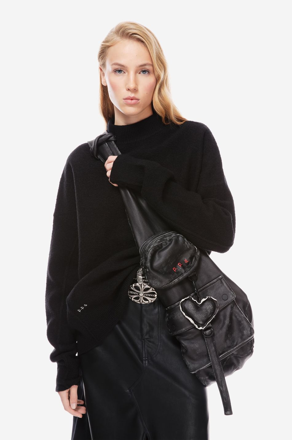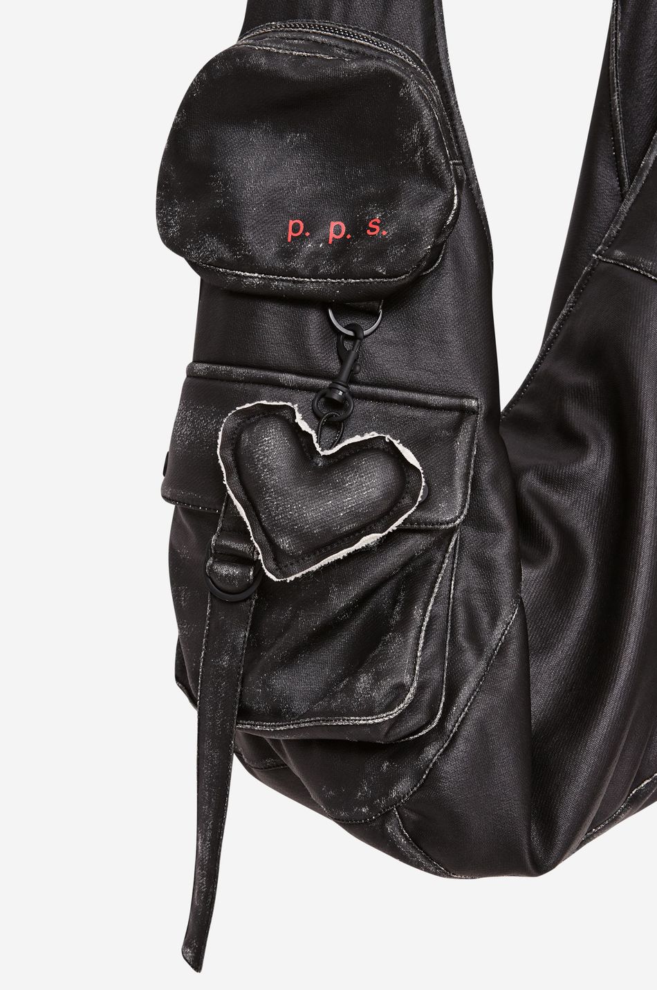 сумка мягкой формы с застежкой на магнитную кнопку, накладными карманами, с клапаном и карманом на молнии с боковой стороны. внутренняя часть сумки с карманом на молнии. эстетику бренда подчеркивает съемный брелок-сердце и патч-манифест