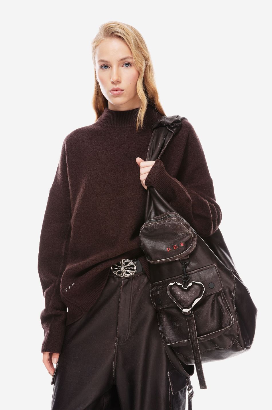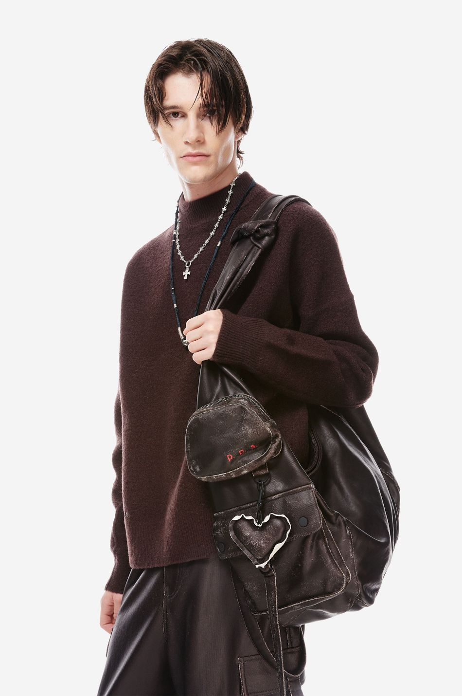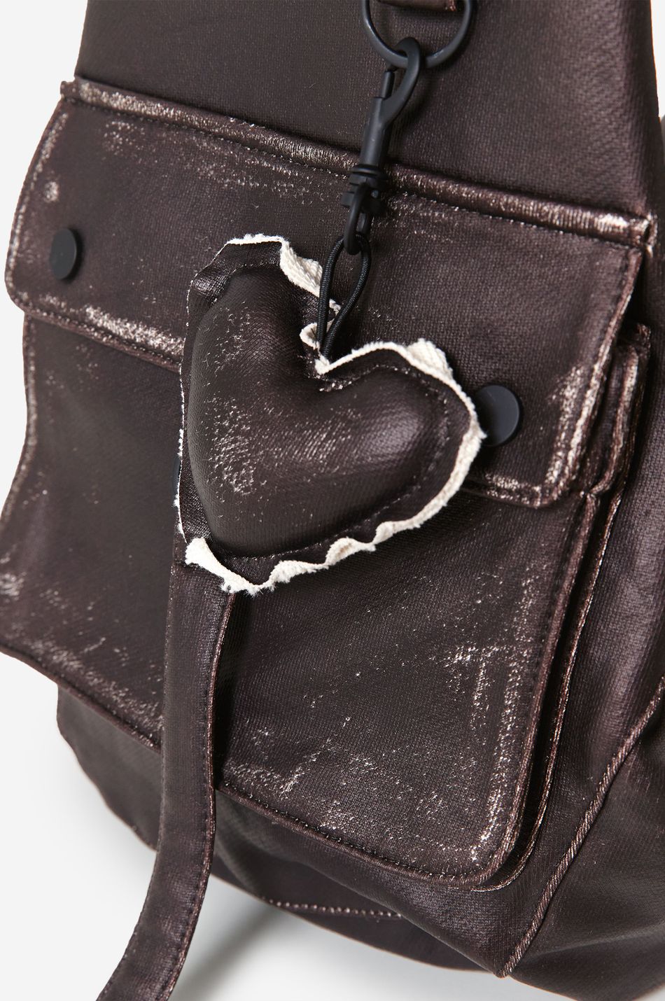 сумка мягкой формы с застежкой на магнитную кнопку, накладными карманами, с клапаном и карманом на молнии с боковой стороны. внутренняя часть сумки с карманом на молнии. эстетику бренда подчеркивает съемный брелок-сердце и патч-манифест