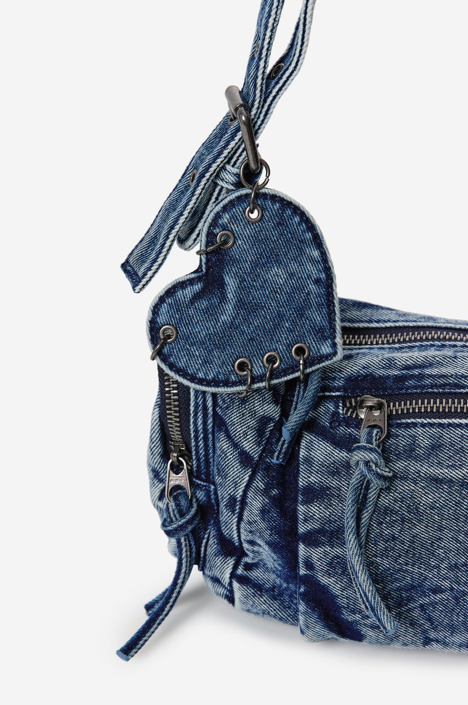 Миниатюрная сумка в стиле Cargo выполнена из плотного варёного денима. Эстетика 90-х сочетается с утилитарными элементами: наружные карманы на молниях, шнурки-завязки и декоративная подвеска в форме сердца. Модель дополнена двумя ручками: короткой и съёмной длинной — для ношения в руке или на плече. Внутри — подкладка из полиэстера и карман на молнии.