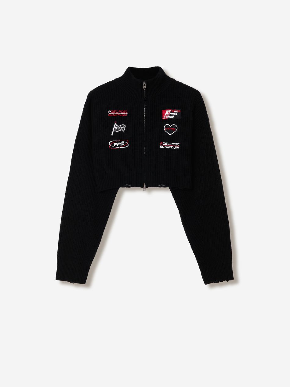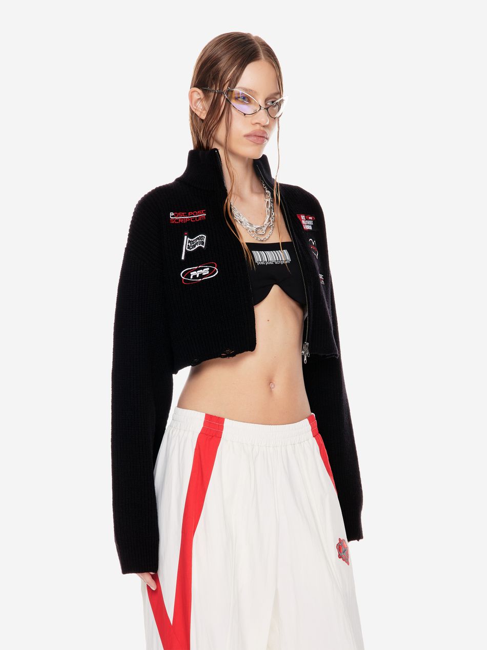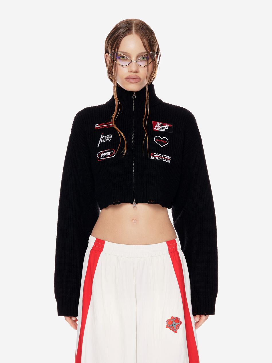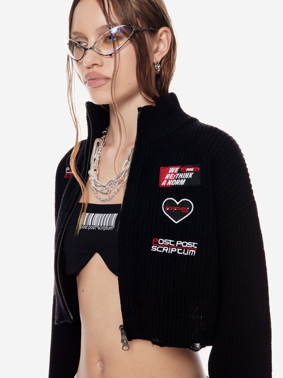 Это свитер-хроника, рождённый из эстетики командных комбинезонов.