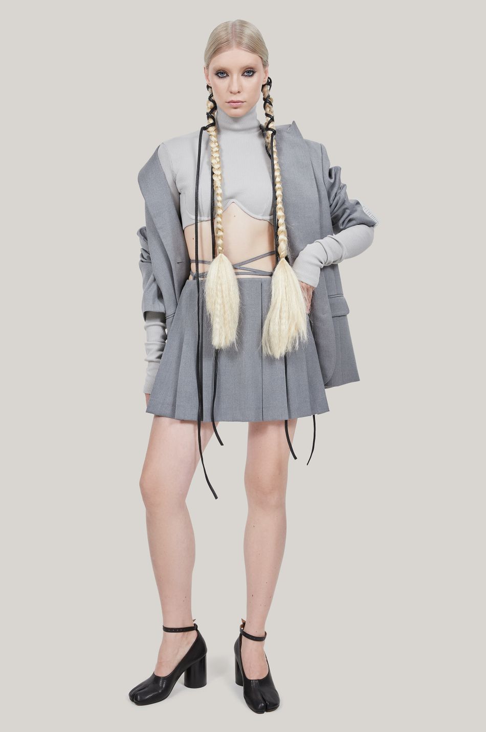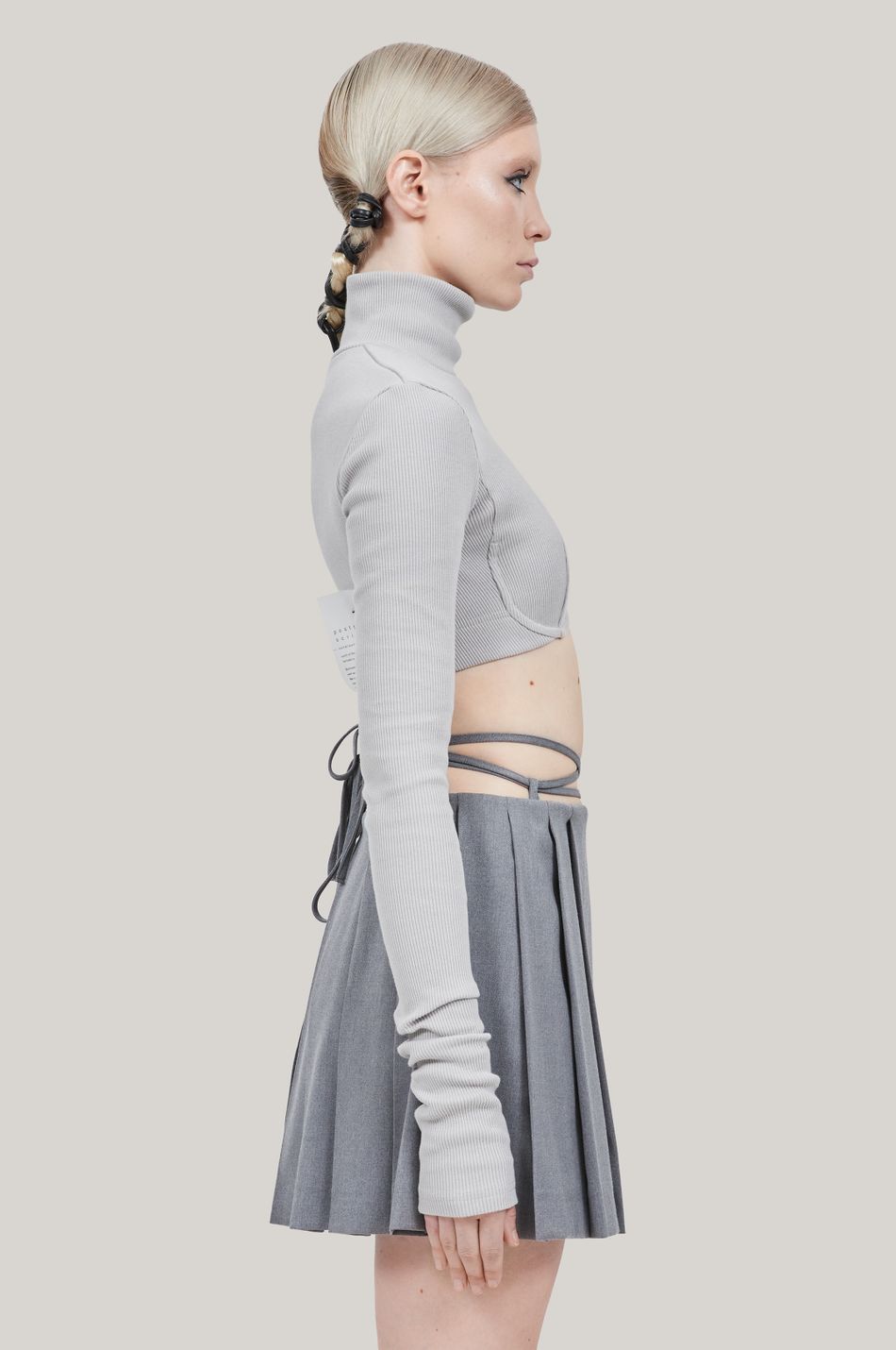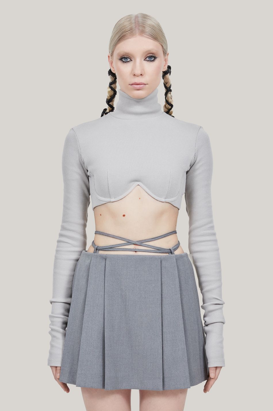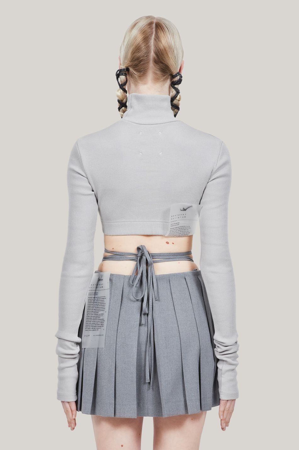 хлопковый топ из ткани в рубчик. укороченная модель с фигурным вырезом по нижней кромке и косточками, удлиненными рукавами и высоким воротником