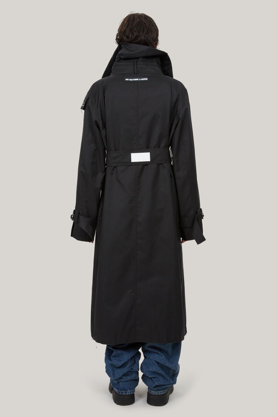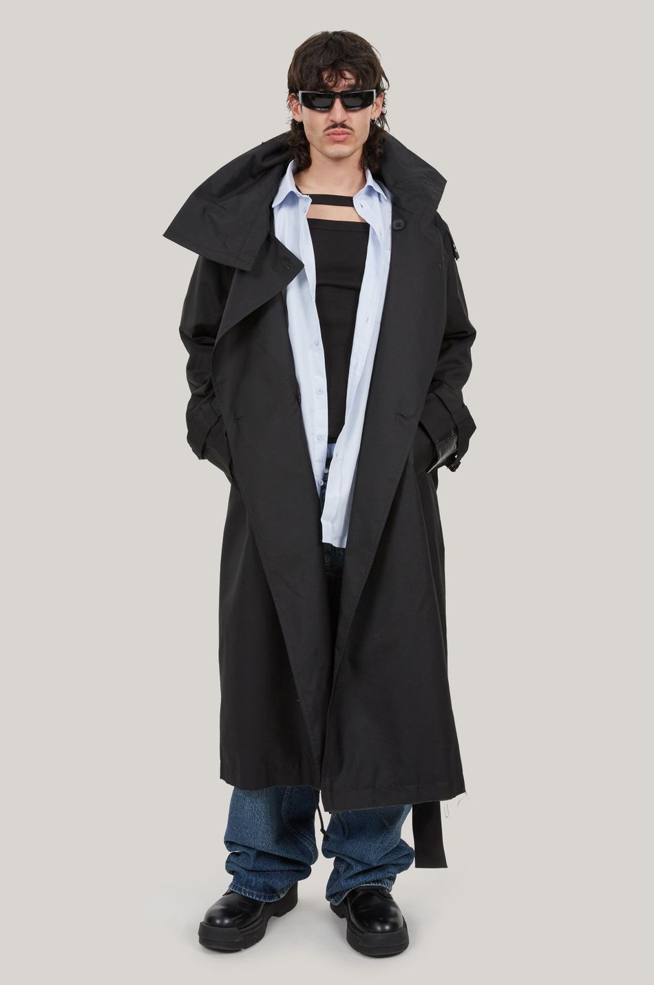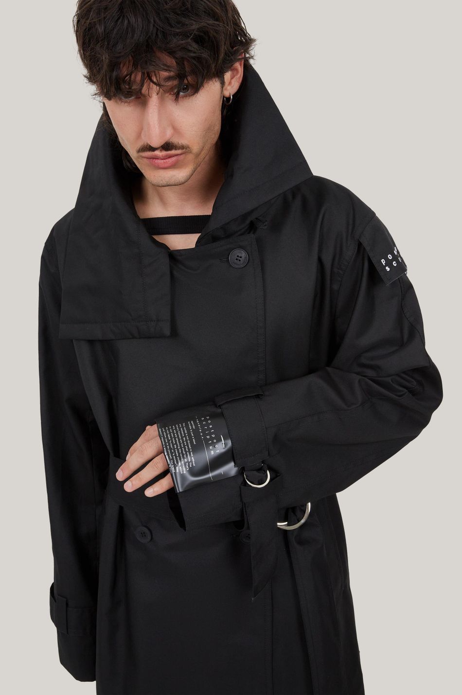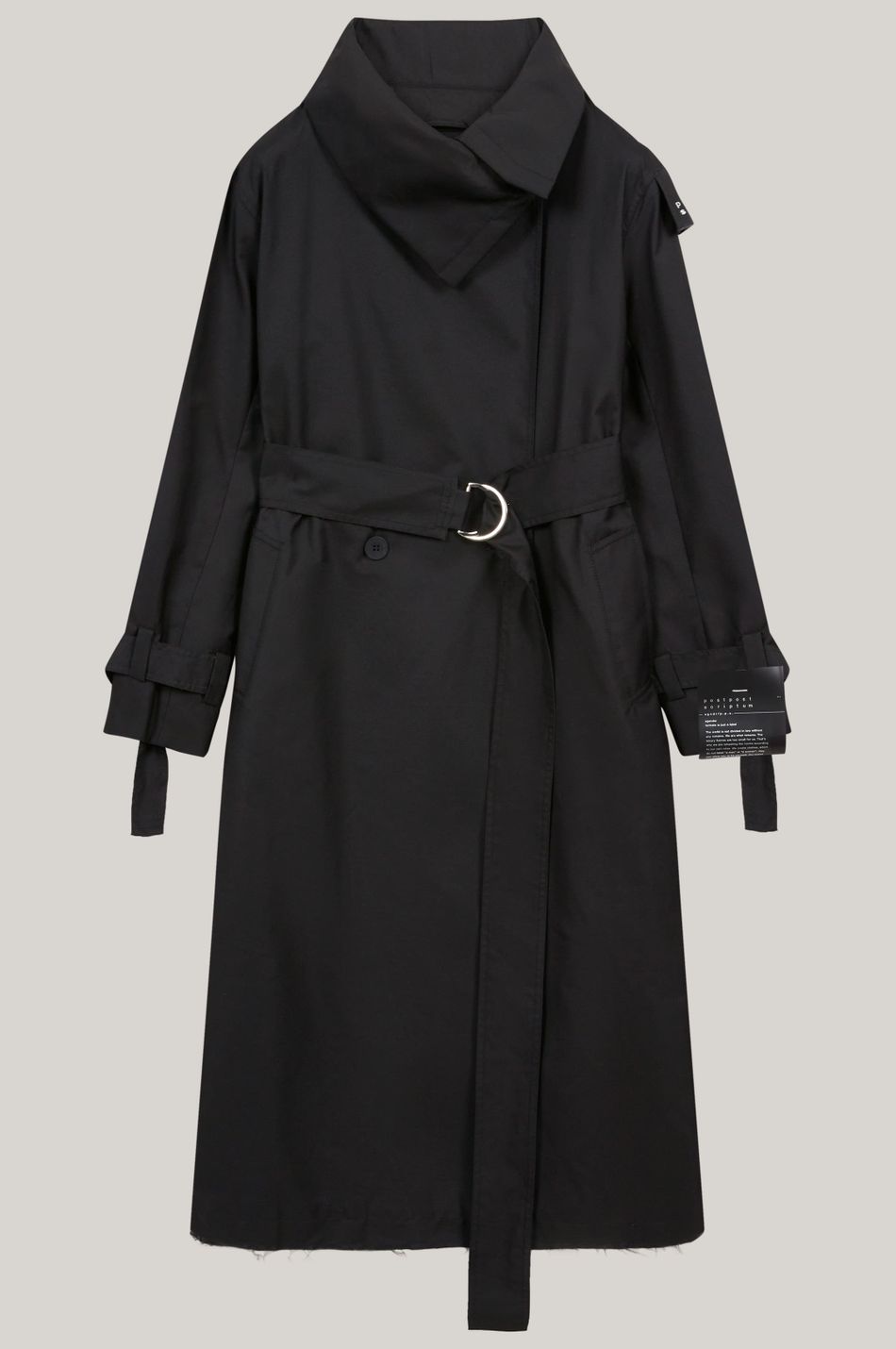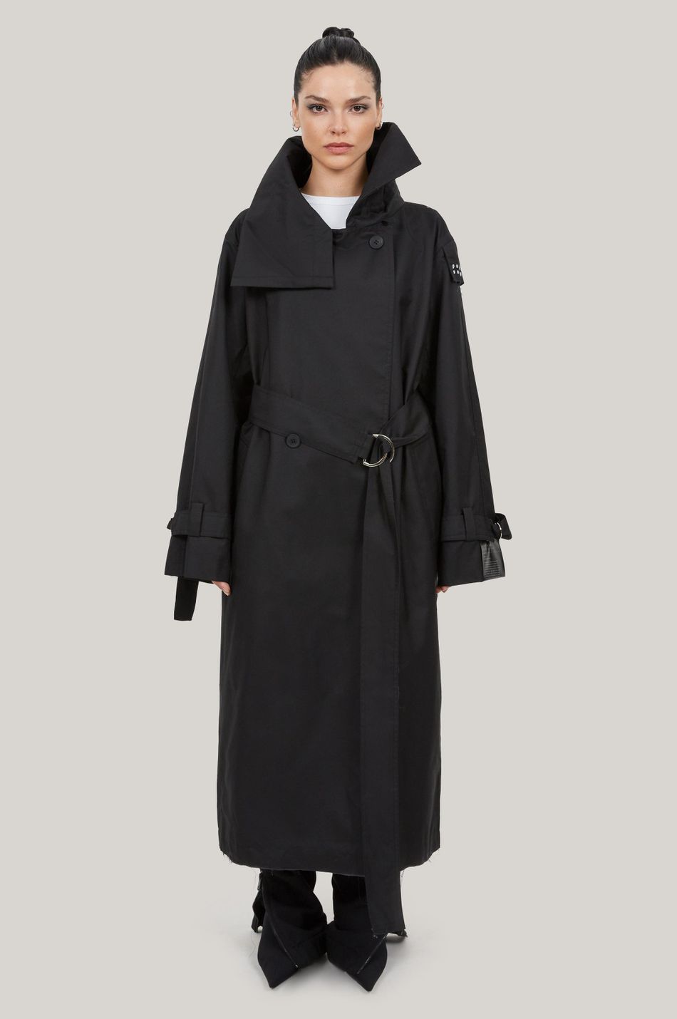 Двубортный плащ на подкладе, прямого кроя с ассиметричным воротником. В качестве декора - открытый срез на рукавах и по низу изделия. Съемный пояс позволяет носить плащ на запах. Рекомендуемый температурный режим: от +5 до +15 градусов.