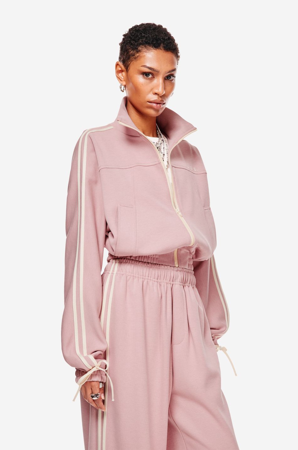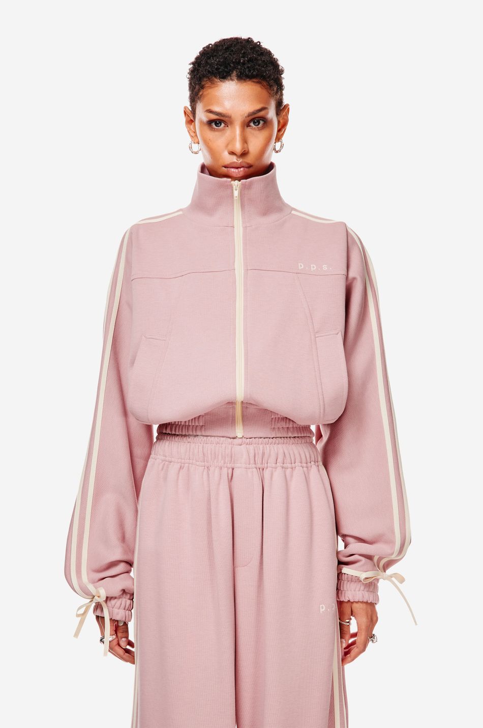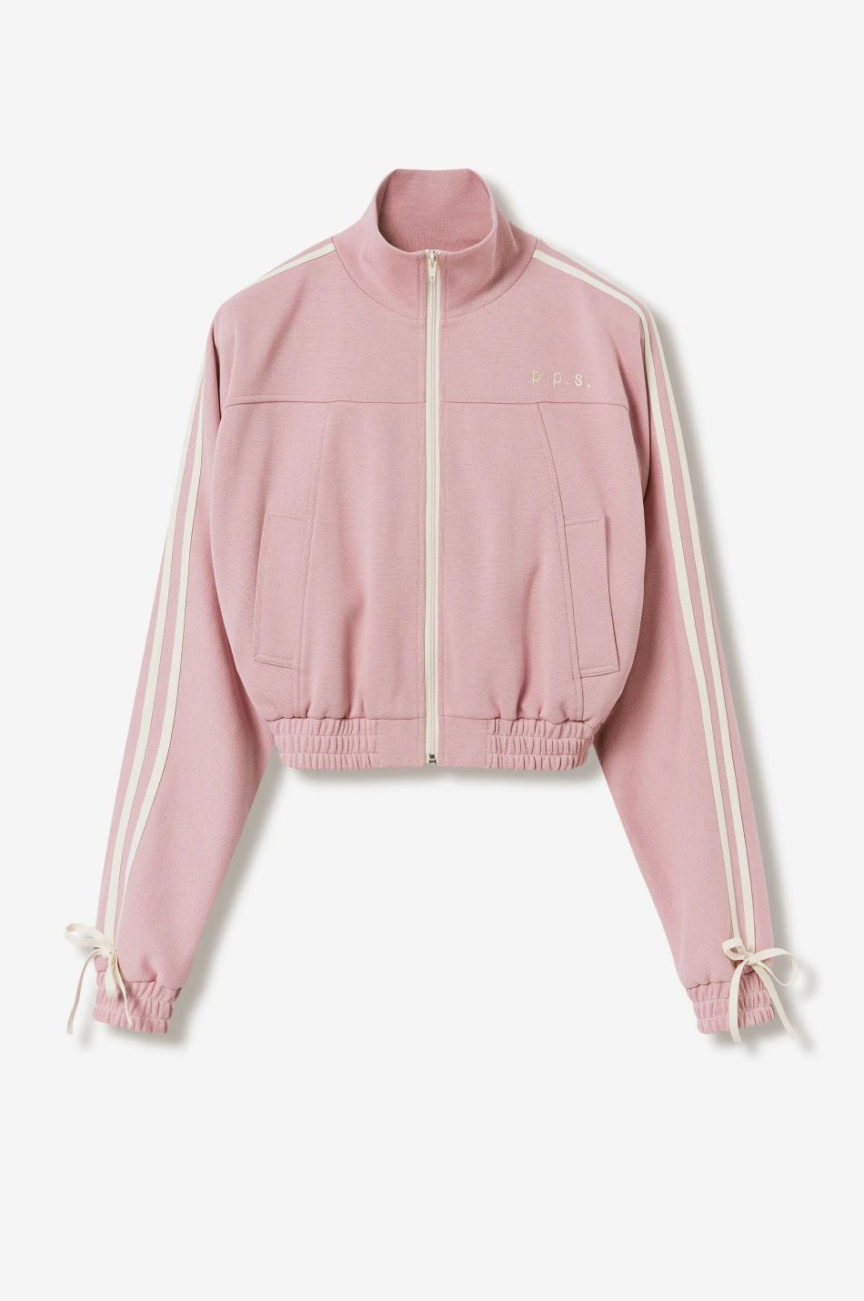 укороченная трикотажная куртка с высоким воротником и эластичной нижней кромкой. контрастные белые лампасы на рукавах заканчиваются декоративными бантиками на эластичных манжетах. модель дополняется застежкой-молнией и прорезными карманами спереди. на принадлежность бренду указывают контрастный логотип на груди и фирменный манифест на спине.