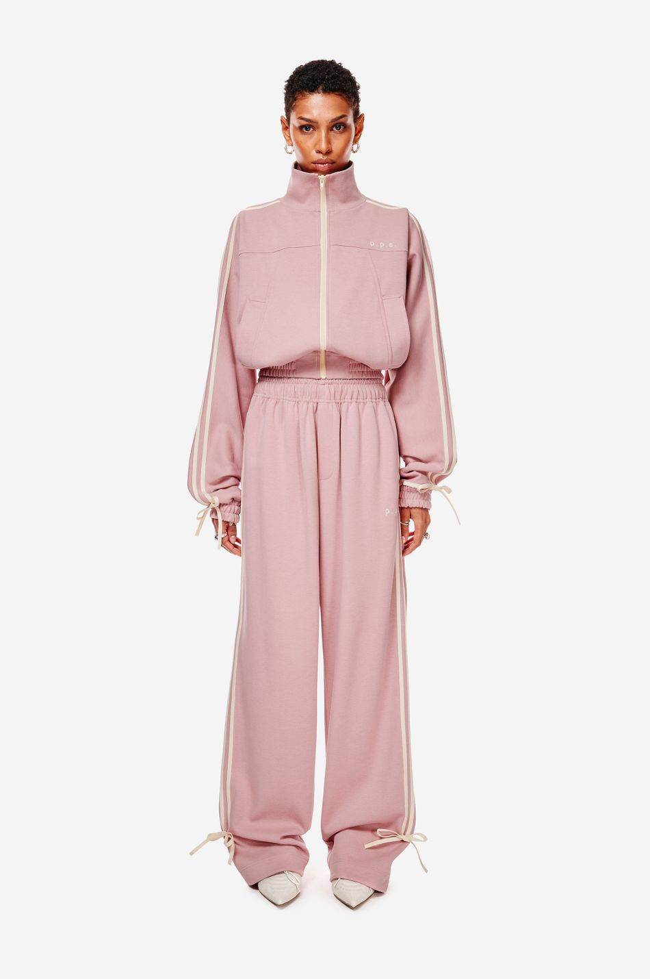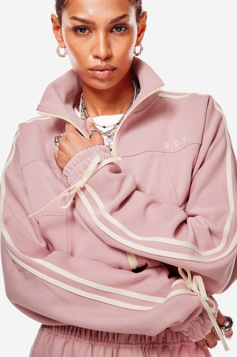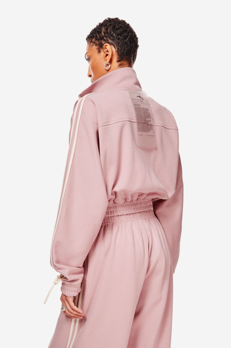 укороченная трикотажная куртка с высоким воротником и эластичной нижней кромкой. контрастные белые лампасы на рукавах заканчиваются декоративными бантиками на эластичных манжетах. модель дополняется застежкой-молнией и прорезными карманами спереди. на принадлежность бренду указывают контрастный логотип на груди и фирменный манифест на спине.