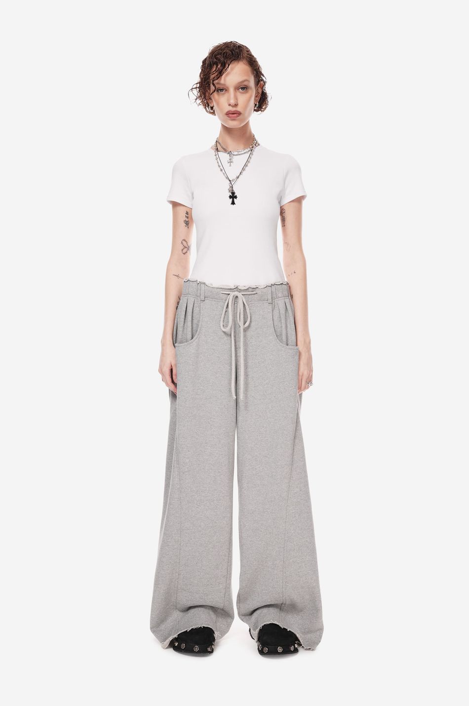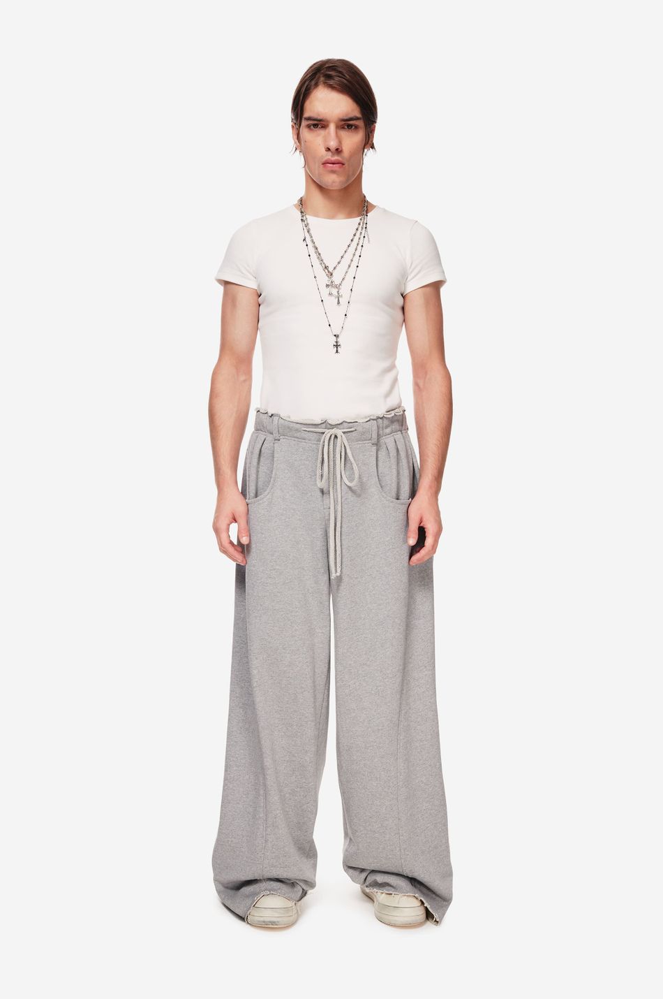 брюки в эстетике contemporary streetwear с отсылкой к спортивным кодам конца 90-х. необработанный край пояса, утилитарные карманы и расслабленная длина с напуском на обувь. это не спорт, а его модная трансформация.