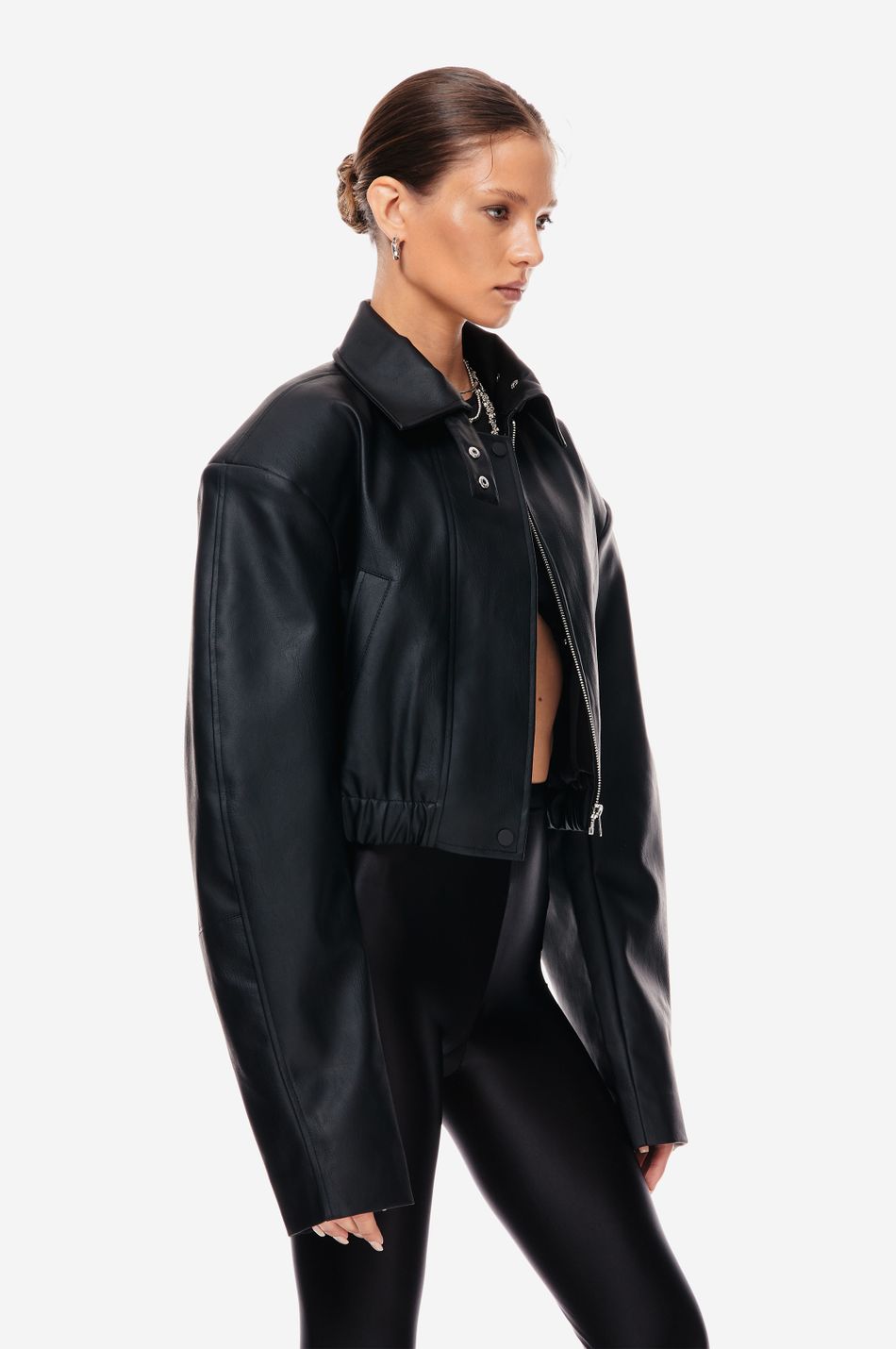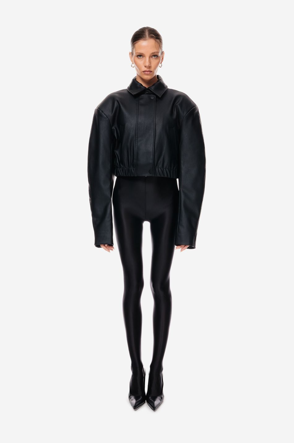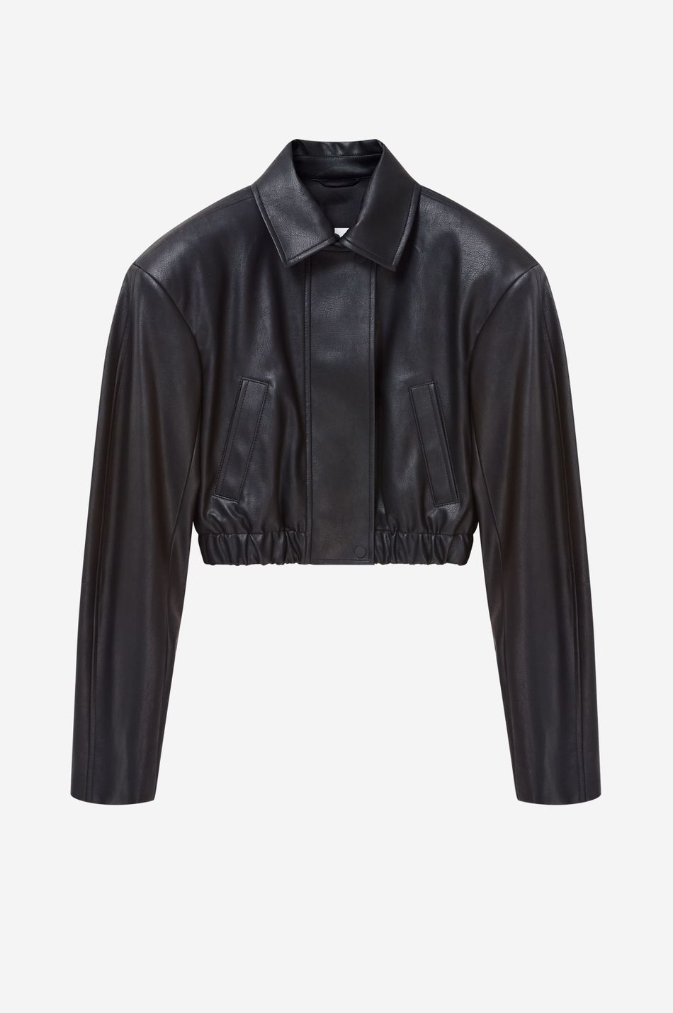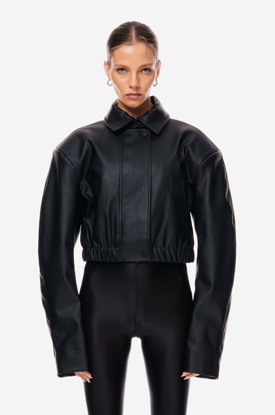 для пошива черной укороченной куртки с широким воротником и покатой линией плеч использовали качественную веганскую кожу. геометричность кроя разбавили эластичной нижней кромкой, передними карманами с клапанами и объёмными длинными рукавами, закрывающими ладони. модель застегивается на молнию под планкой с двумя кнопками.