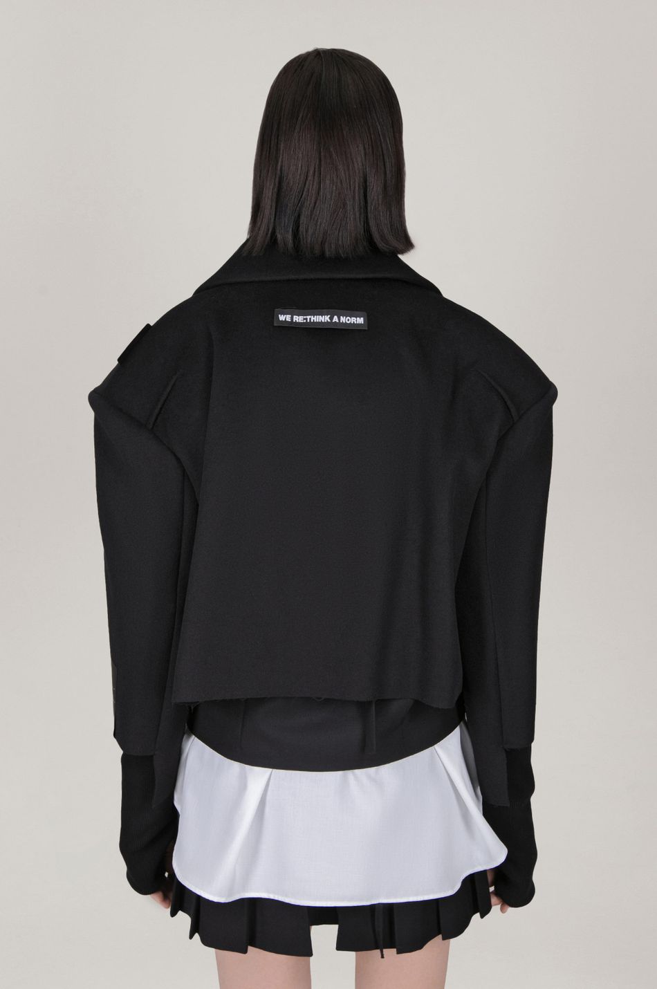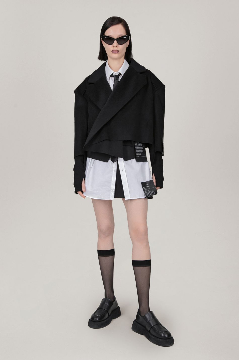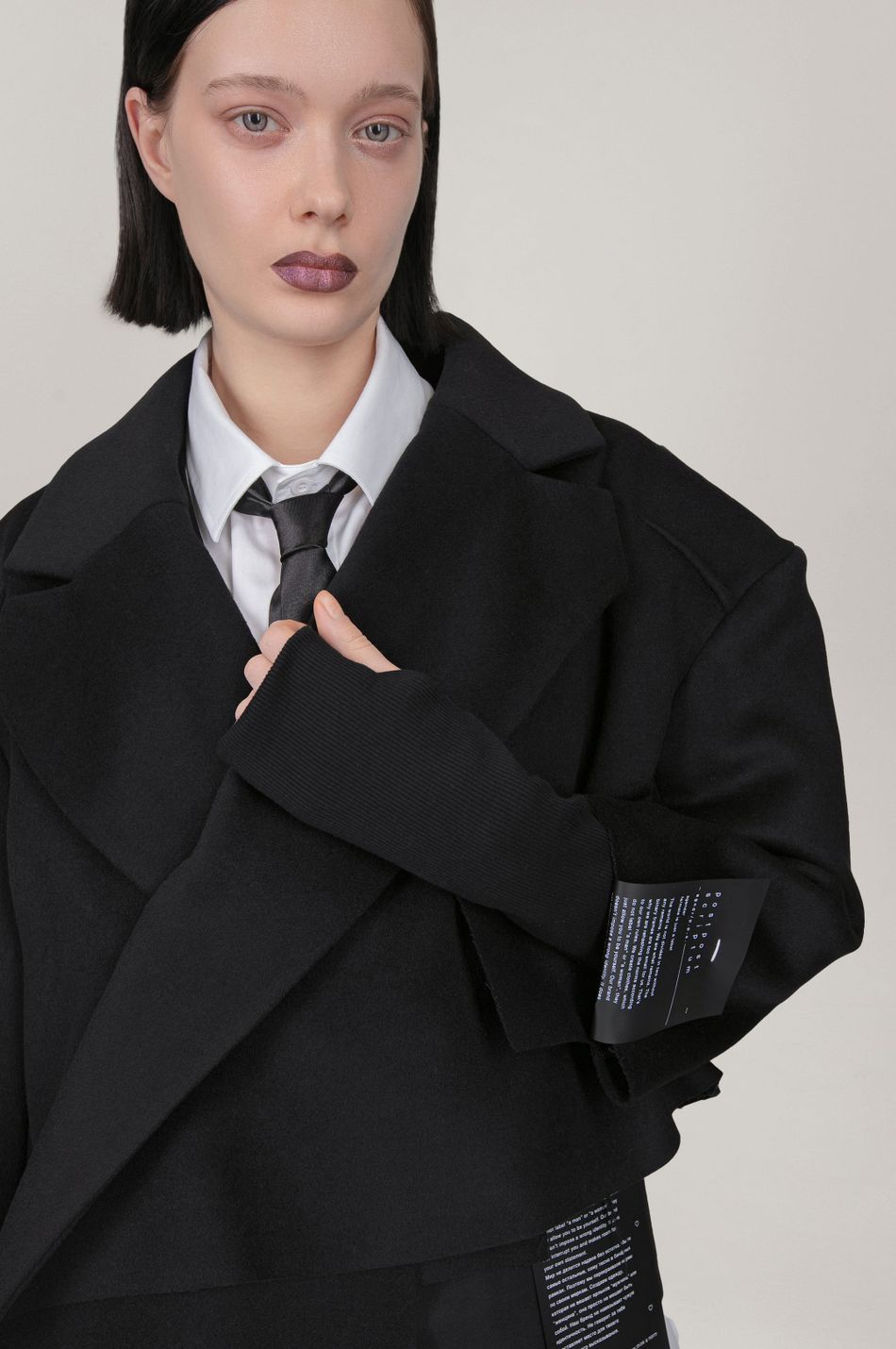 агендерный силуэт, рукава-перчатки. укороченное шерстяное пальто можно носить самостоятельно или соединить с осенним тренчем для дополнительного тепла. мы ценим многослойность: совмещая структуры и ткани, ты добиваешься индивидуального результата.
