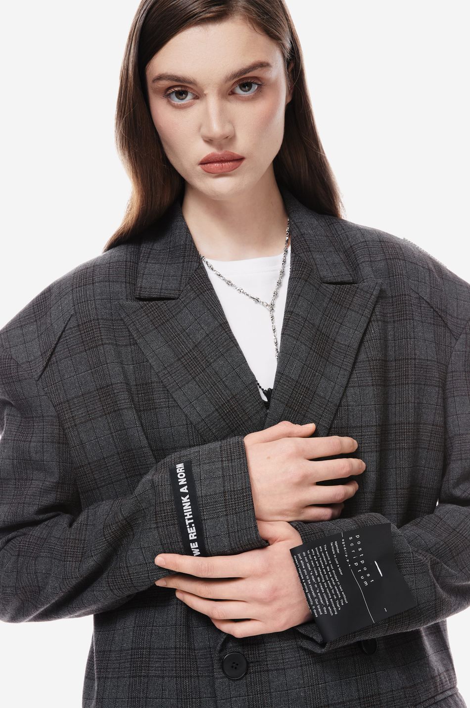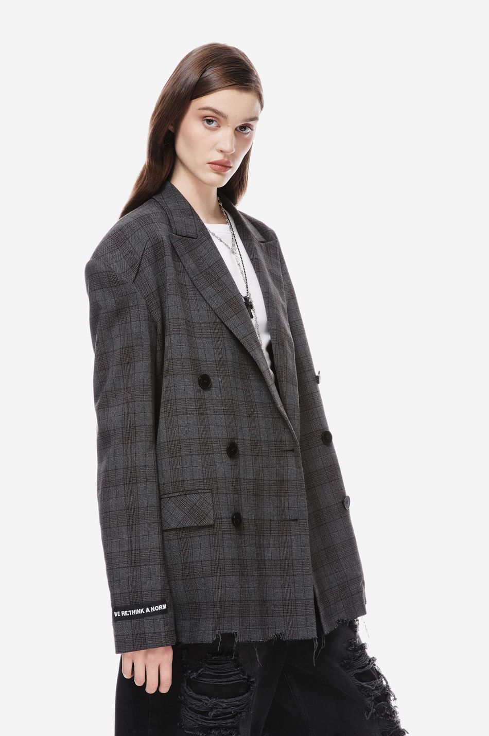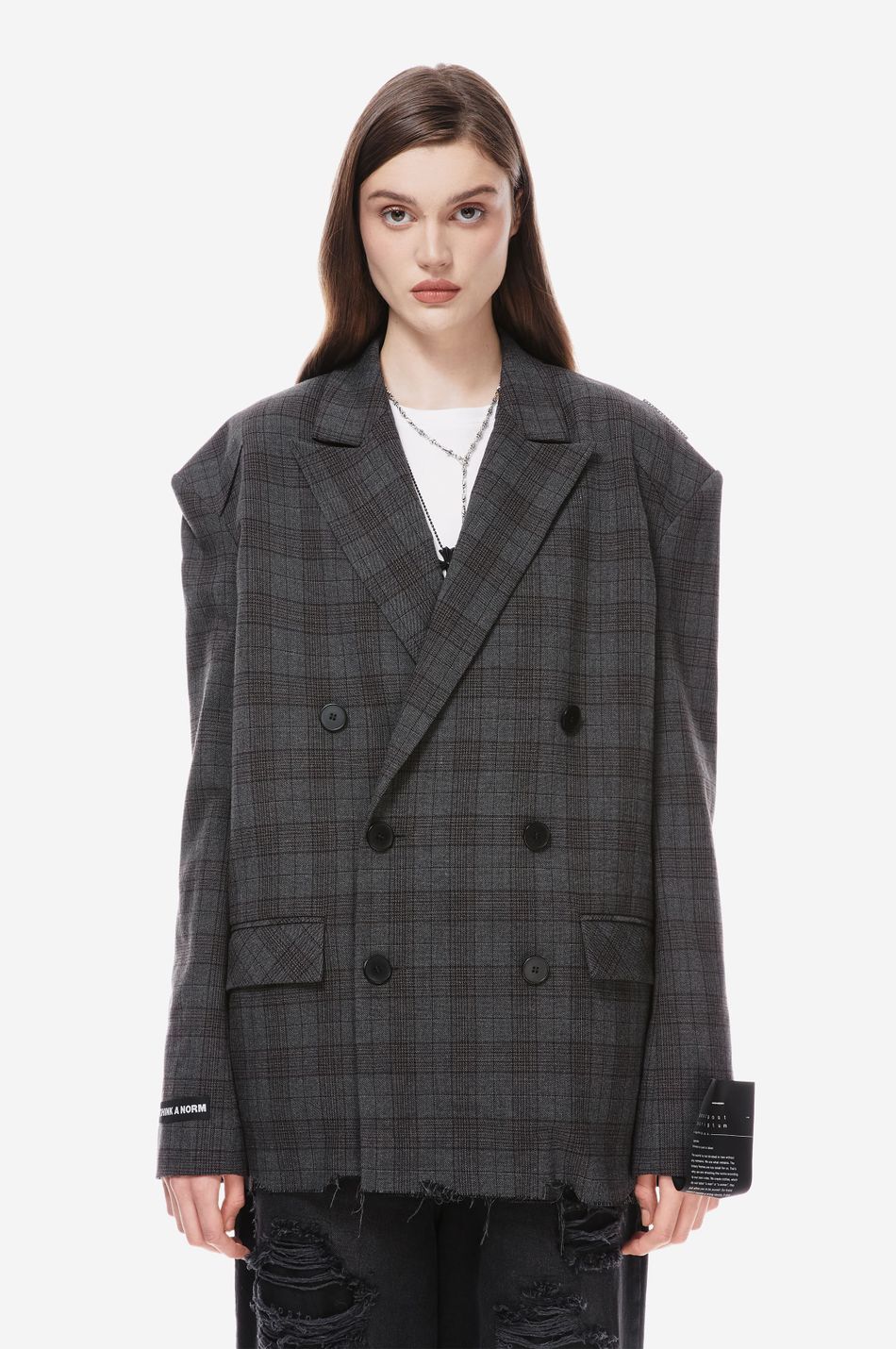 двубортный жакет в крупную клетку с гипертрофированной линией плеч и заостренными лацканами сшили из плотной ткани. для модели характерны длинные, закрывающие ладони рукава с контрастной нашивкой в виде слогана бренда, два ряда пуговиц в тон и необработанная кромка по низу, добавляющая изделию легкую акцентную небрежность.