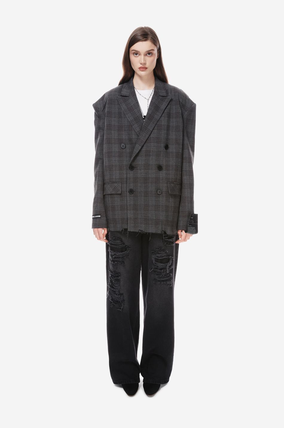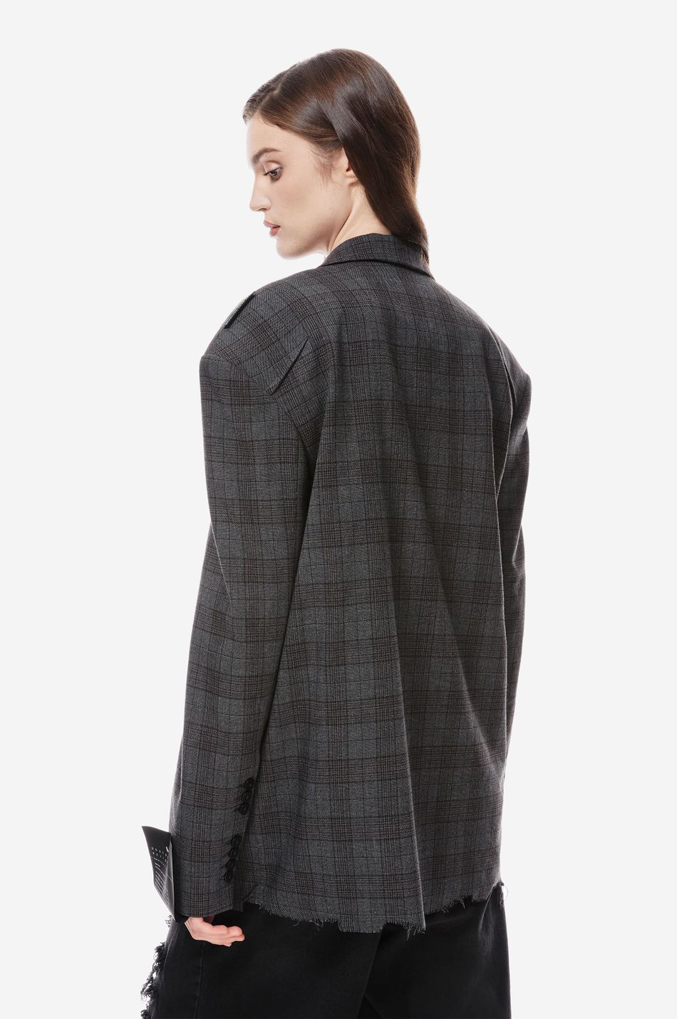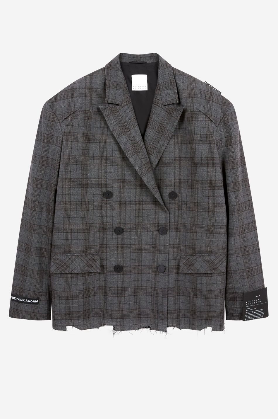 двубортный жакет в крупную клетку с гипертрофированной линией плеч и заостренными лацканами сшили из плотной ткани. для модели характерны длинные, закрывающие ладони рукава с контрастной нашивкой в виде слогана бренда, два ряда пуговиц в тон и необработанная кромка по низу, добавляющая изделию легкую акцентную небрежность.