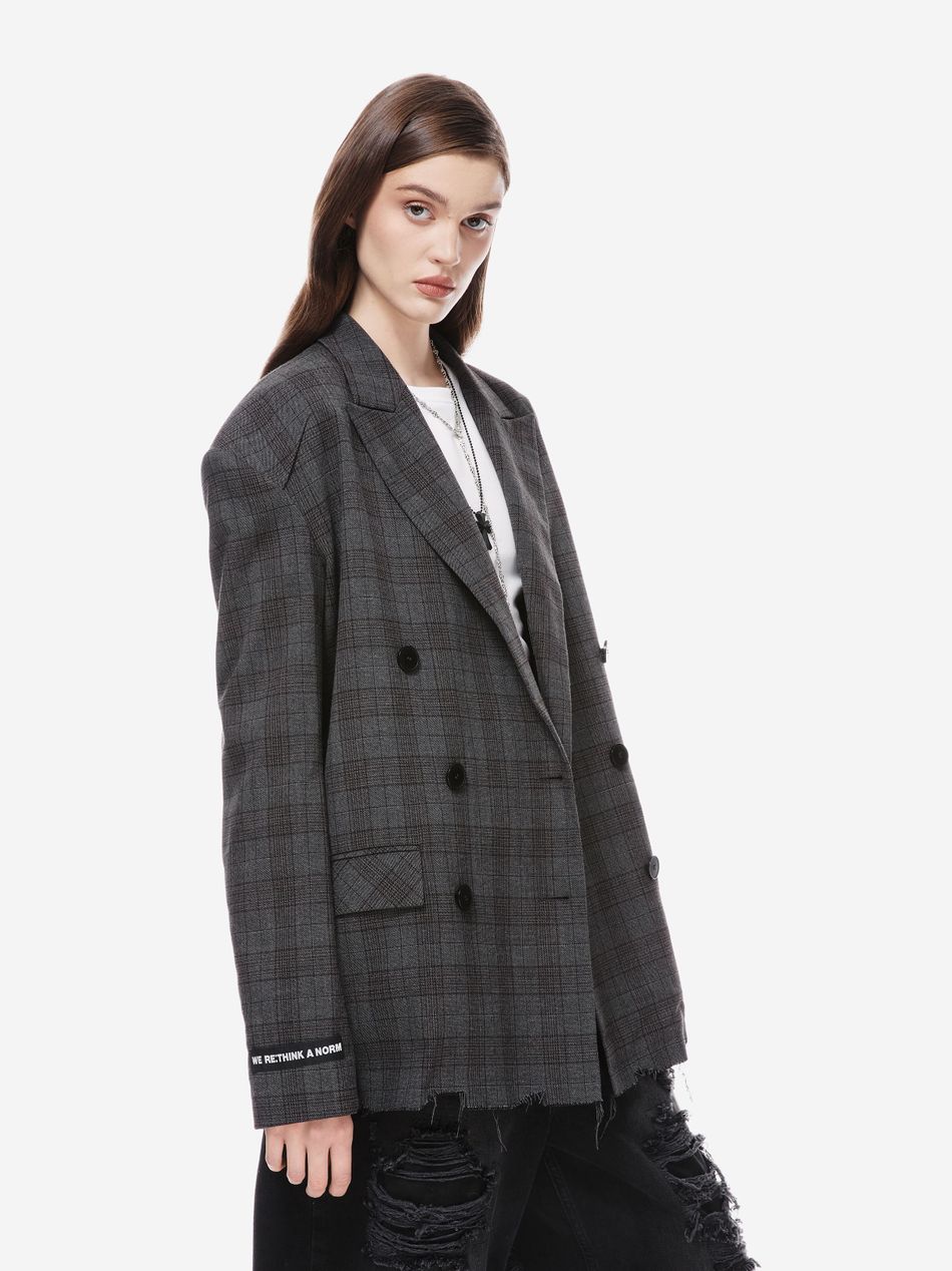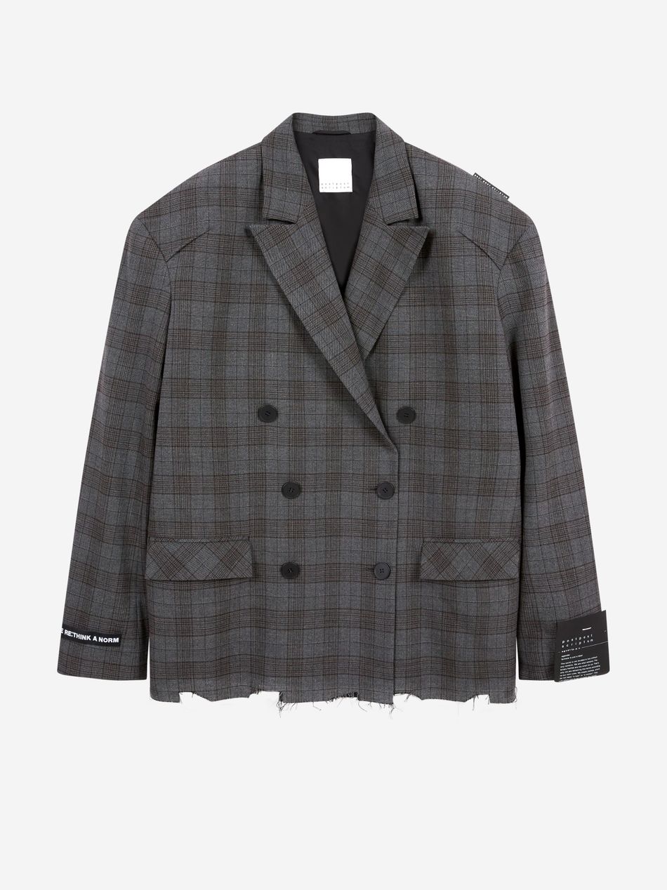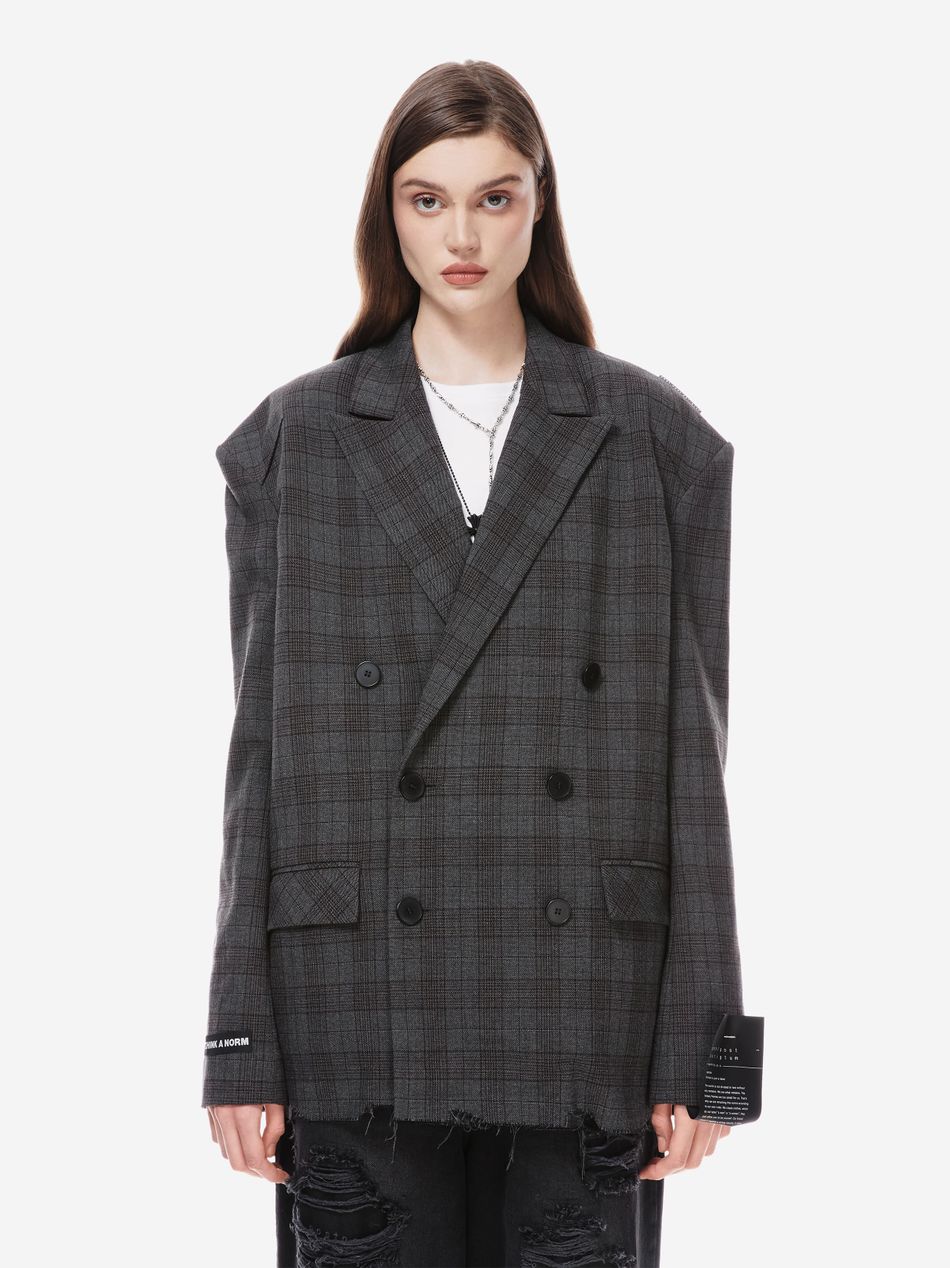 двубортный жакет в крупную клетку с гипертрофированной линией плеч и заостренными лацканами сшили из плотной ткани. для модели характерны длинные, закрывающие ладони рукава с контрастной нашивкой в виде слогана бренда, два ряда пуговиц в тон и необработанная кромка по низу, добавляющая изделию легкую акцентную небрежность.