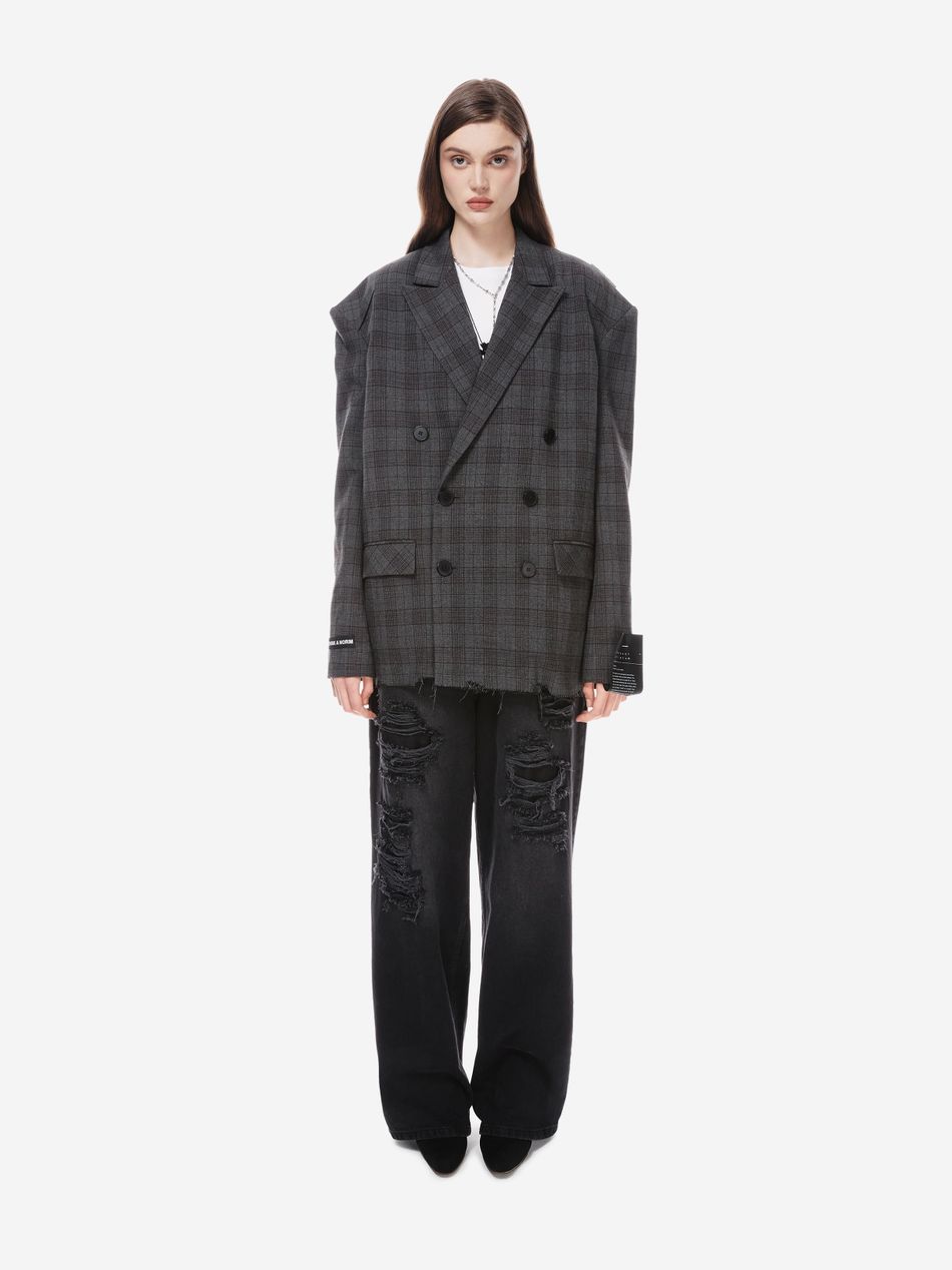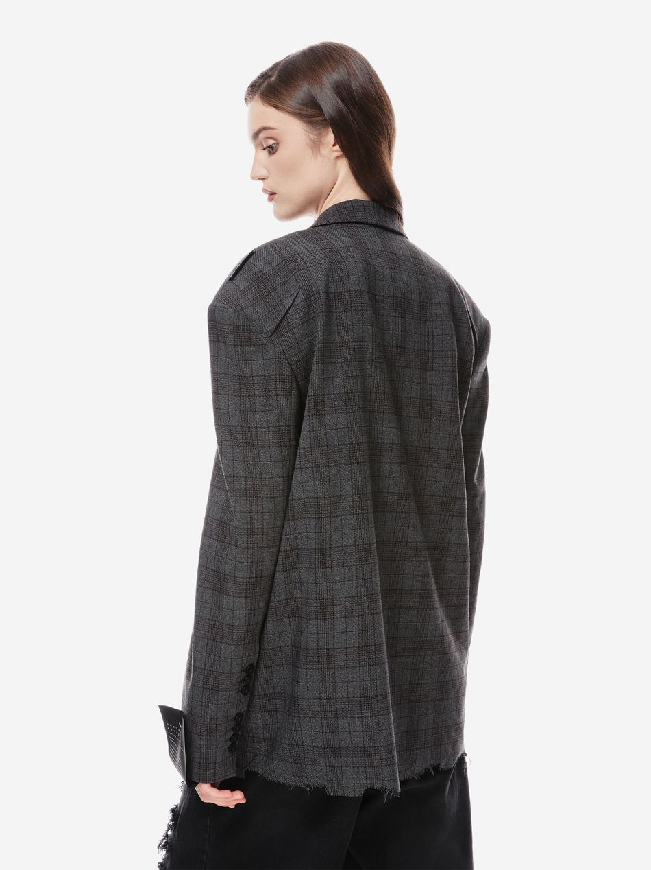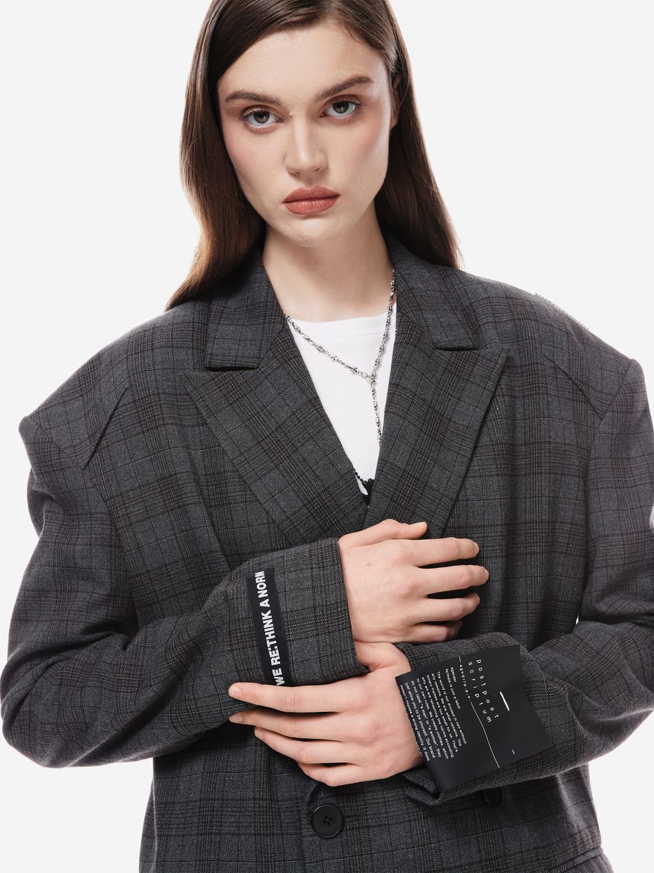 двубортный жакет в крупную клетку с гипертрофированной линией плеч и заостренными лацканами сшили из плотной ткани. для модели характерны длинные, закрывающие ладони рукава с контрастной нашивкой в виде слогана бренда, два ряда пуговиц в тон и необработанная кромка по низу, добавляющая изделию легкую акцентную небрежность.